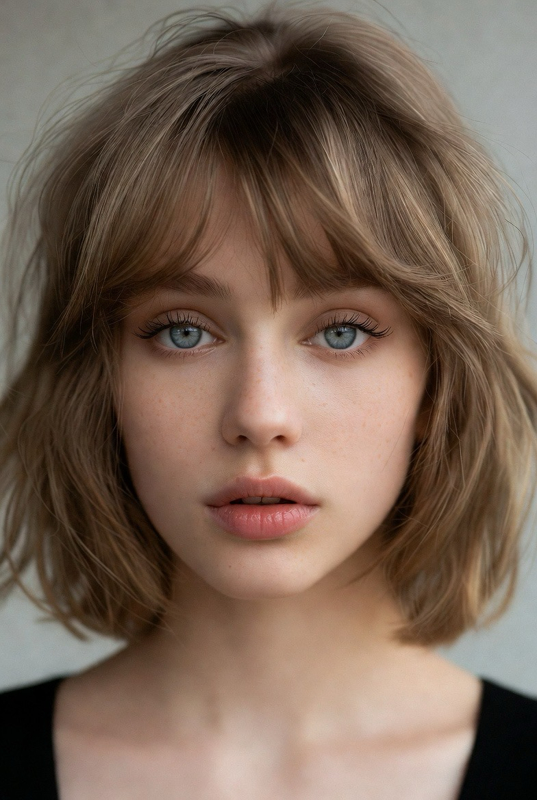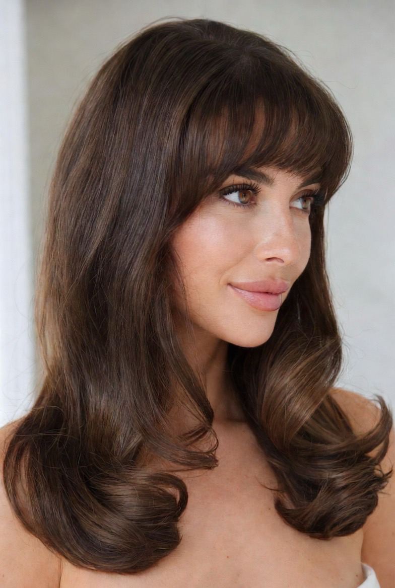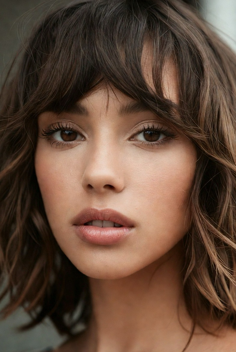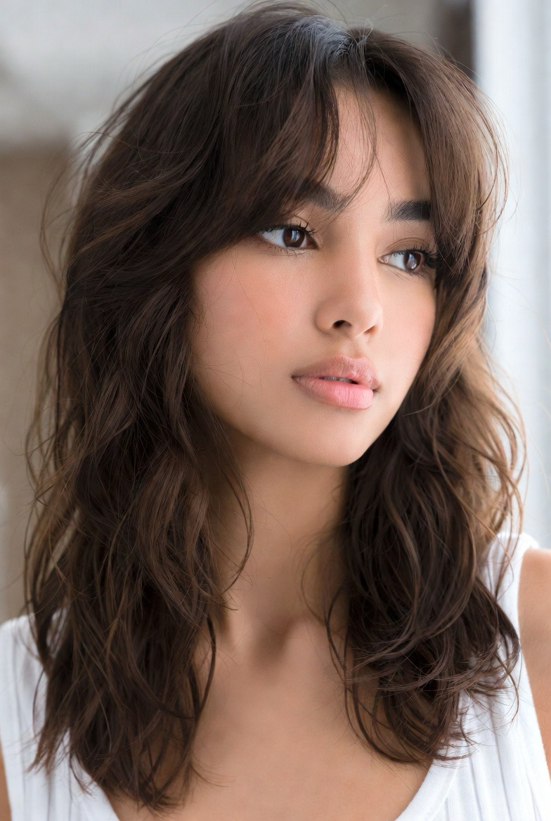 Wispy bangs paired with a medium-length cut create a youthful, romantic look that’s trending hard this year. The bangs are light and airy, not heavy, which keeps the style soft and fresh. This haircut works beautifully for straight and slightly wavy hair and helps soften strong facial features. In 2026, this look is all about subtle detail, nothing harsh, everything blended, with a focus on natural beauty and movement.