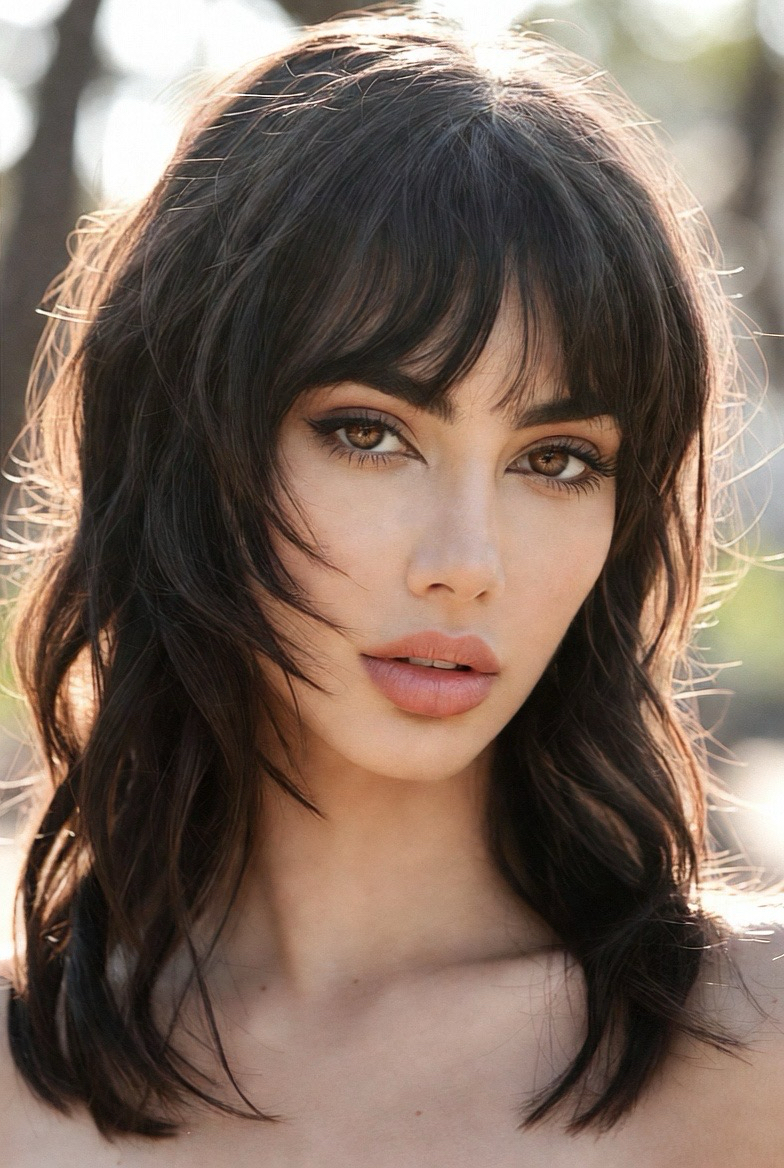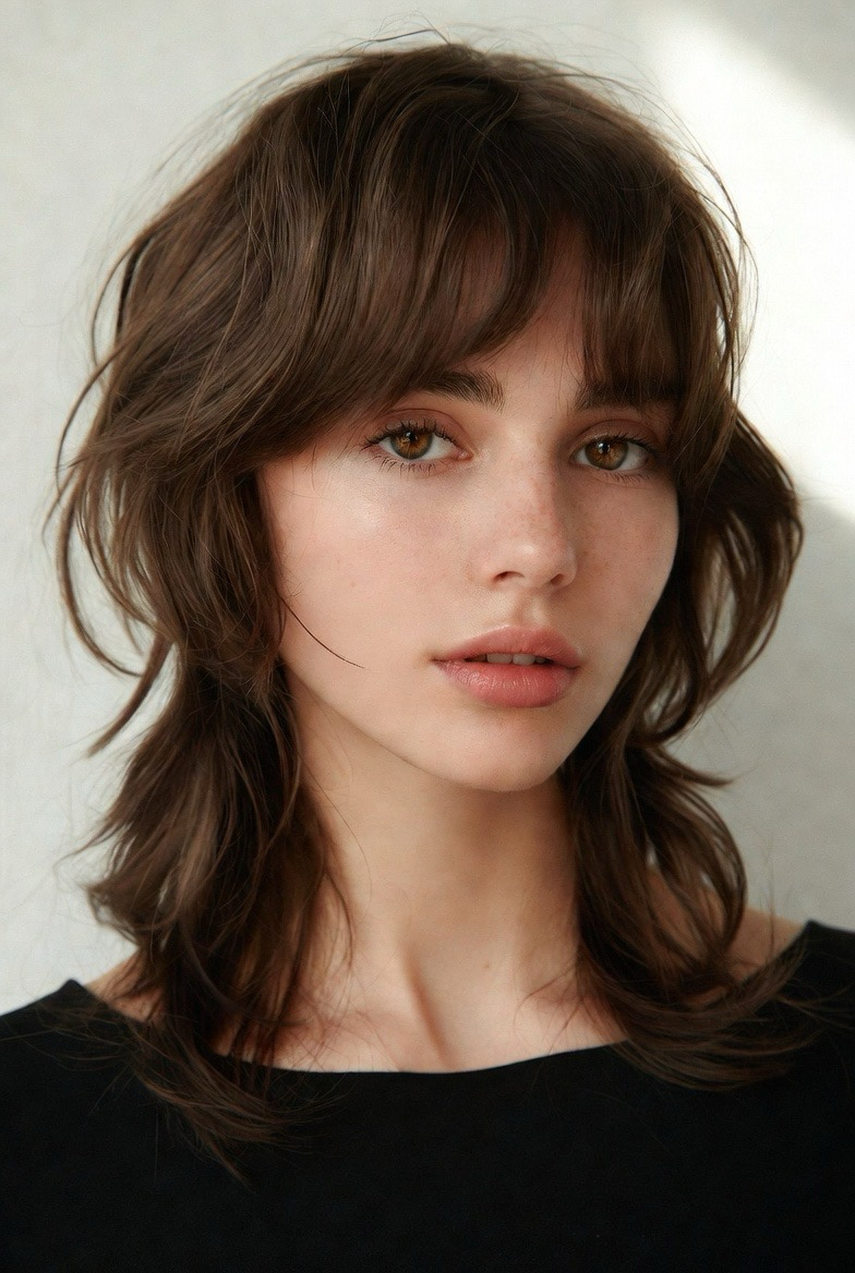 The shag is back and cooler than ever. This medium-length version features choppy layers and soft curtain bangs that frame the face beautifully. It’s perfect for adding volume and edge without looking messy. In 2026, this cut leans more polished than grunge, with feathered ends and lived-in texture. It works especially well for wavy or curly hair and gives off that effortless, French-girl energy everyone loves on Pinterest.