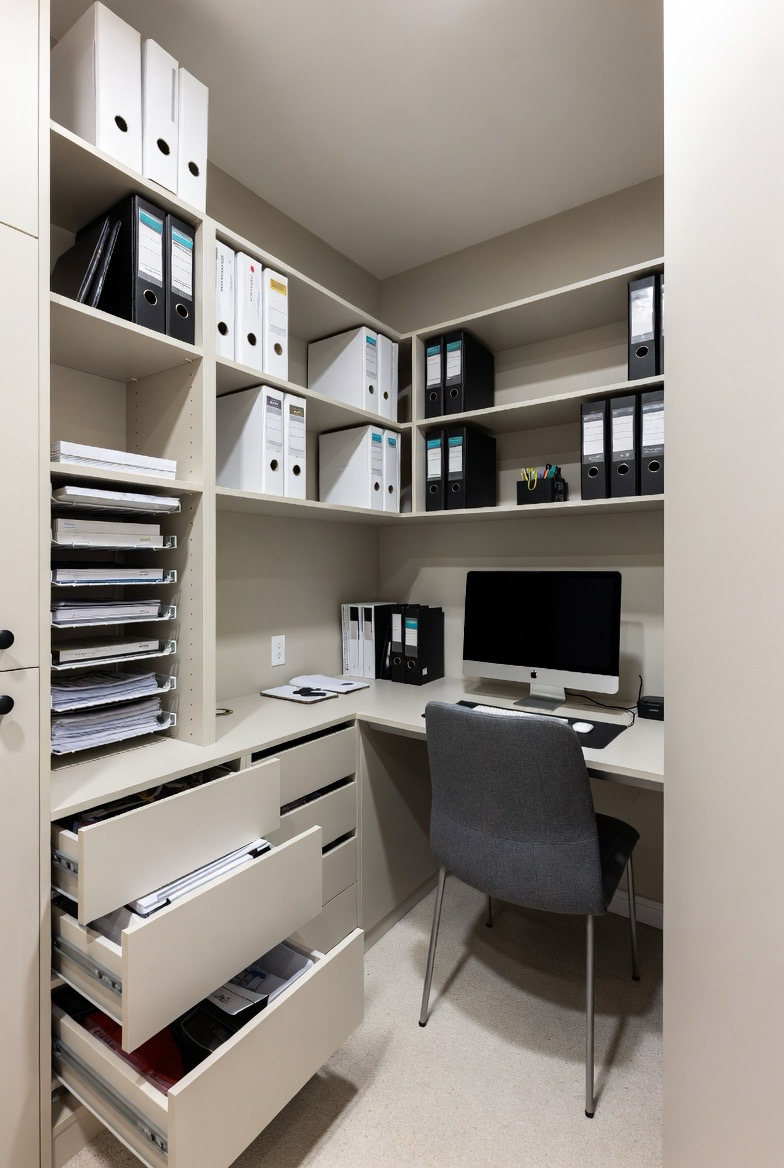 A functional office starts with organization. Built-in shelves, drawers, and filing systems keep paperwork and supplies out of sight but within reach. Vertical storage is especially helpful in small spaces, maximizing functionality without crowding the room. When everything has a place, your workspace feels calmer, more professional, and easier to maintain daily.