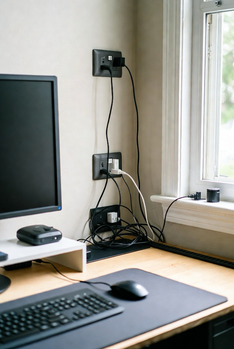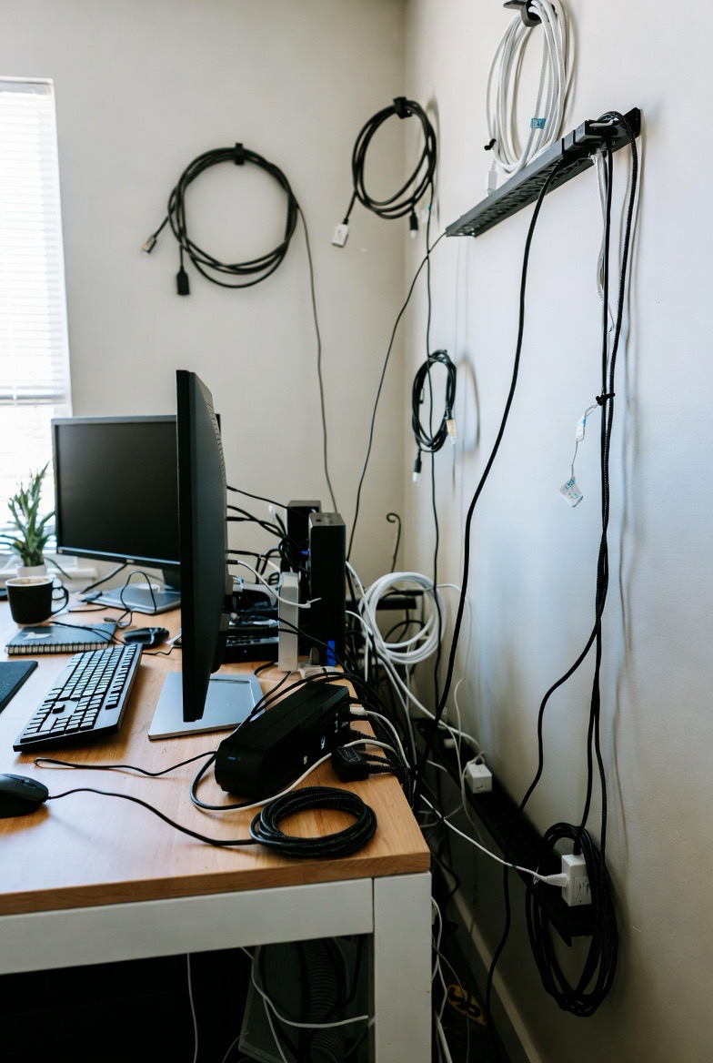 Tangled cords create visual clutter and frustration. Cable trays, clips, and hidden outlets keep wires organized and out of sight. A clean cable setup improves safety and maintains a polished, functional workspace.