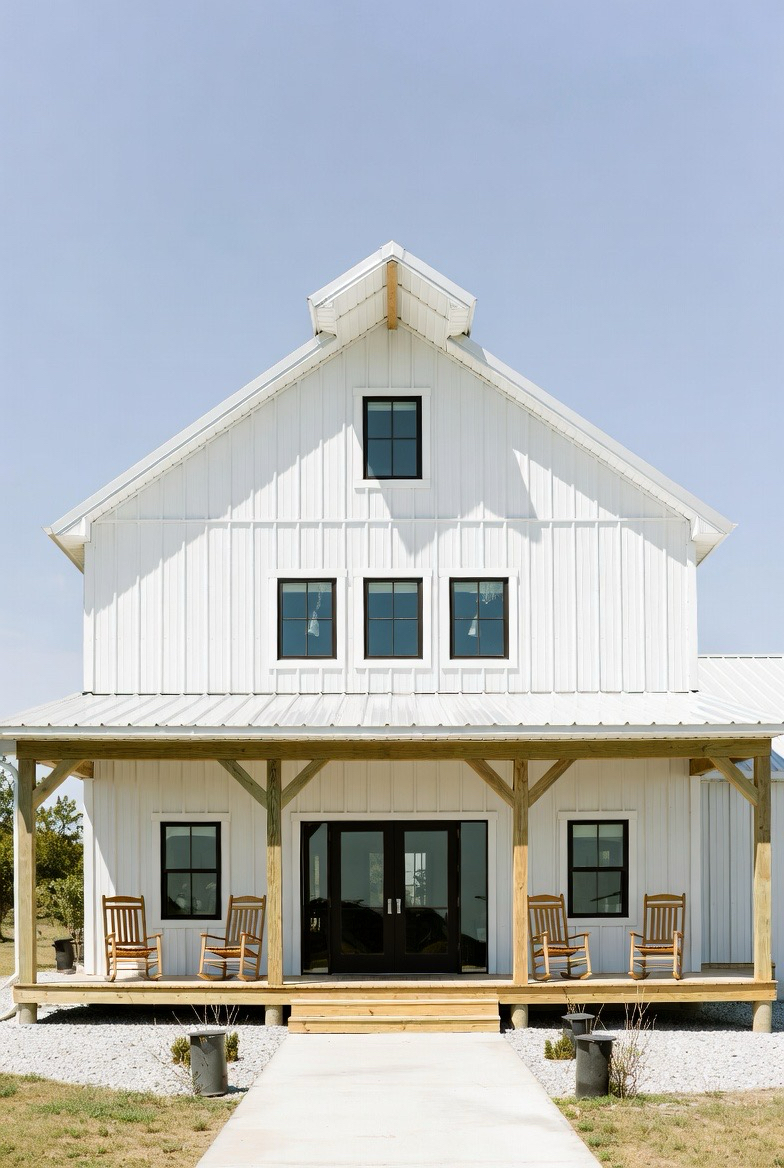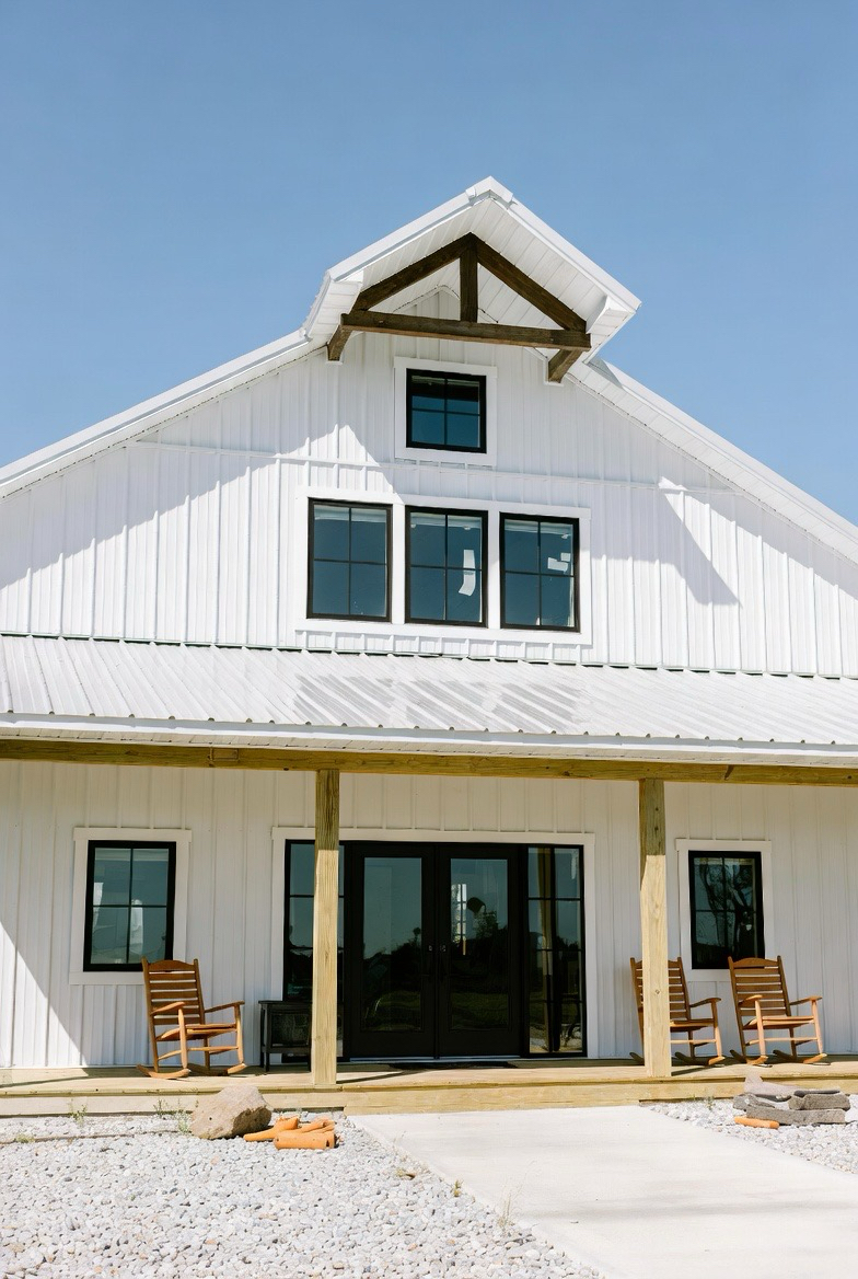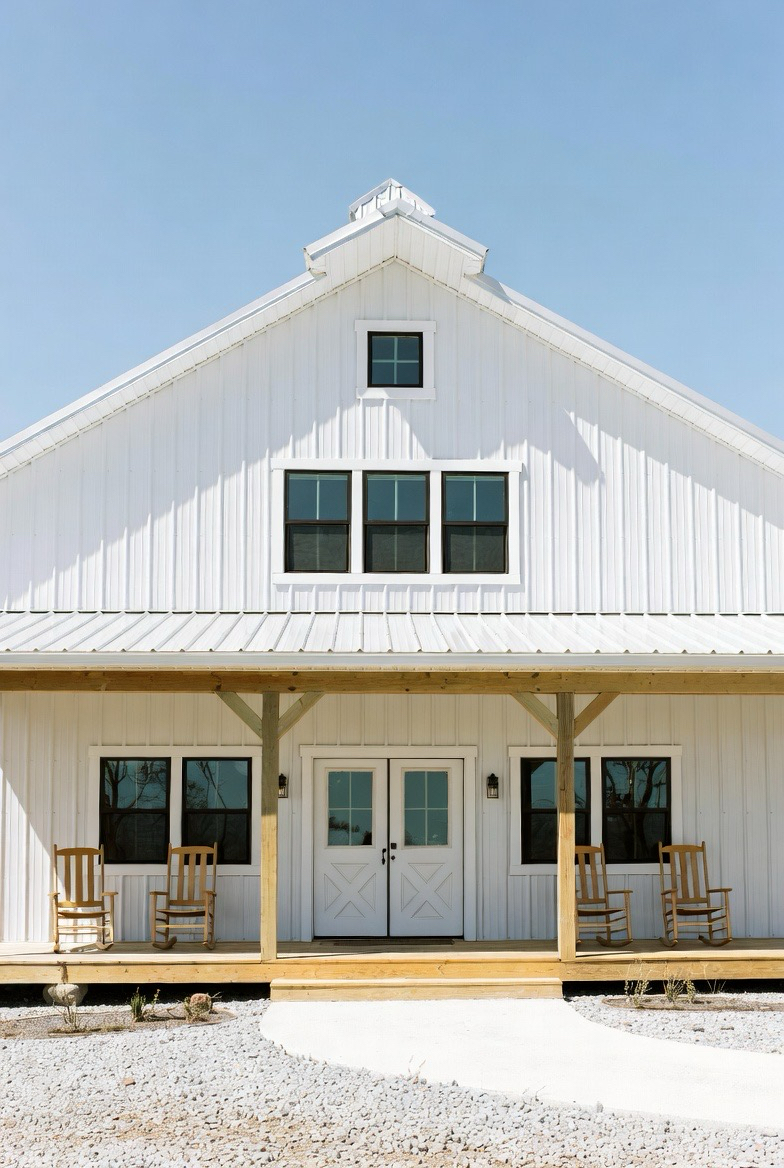 A white farmhouse-style barndominium feels clean, timeless, and inviting. The crisp exterior paired with black window frames creates a high-contrast look that’s both modern and rustic. Metal siding keeps maintenance low while still honoring barn-style roots. Add a wide front porch with wooden beams and rocking chairs to enhance the cozy appeal. This design fits beautifully into rural landscapes and feels like home the moment you see it. It’s perfect for anyone who loves bright, airy spaces with classic charm.
