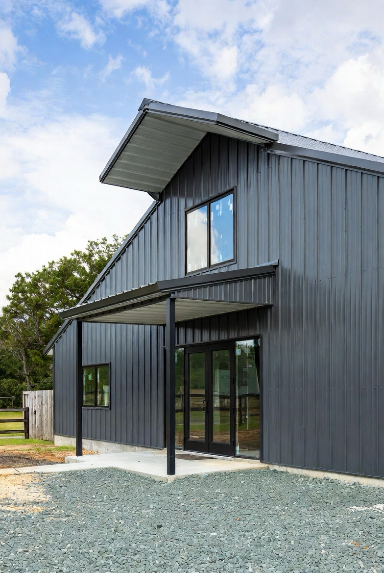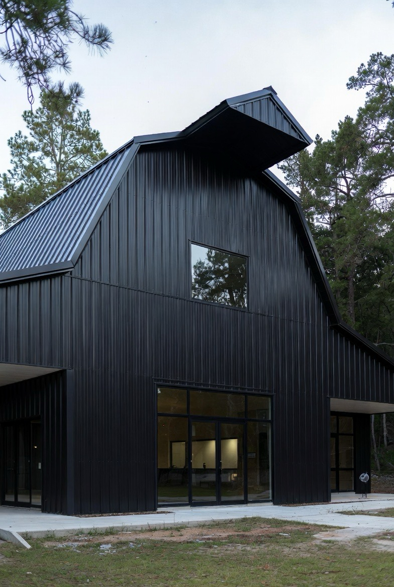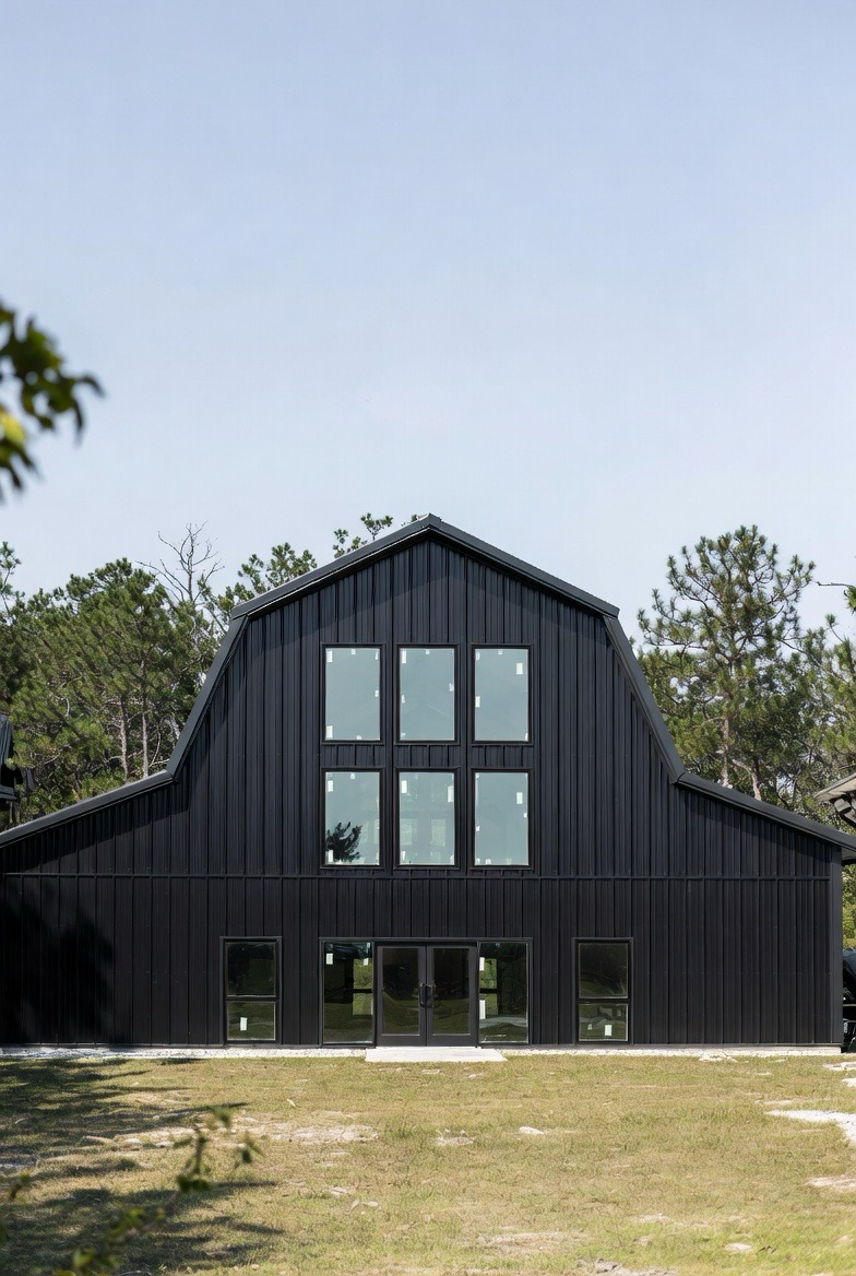 A black metal exterior gives a barndominium a bold, dramatic presence. The sleek finish feels modern and architectural while still keeping that barn-inspired silhouette. Large windows break up the dark siding and bring in plenty of natural light. This style works especially well in wooded or open settings where contrast enhances the landscape. Clean lines and minimal trim keep the look sharp and contemporary. It’s perfect for those who love modern design with a strong, confident edge.