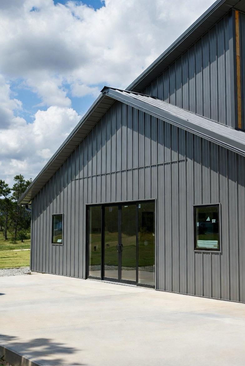 A gray metal exterior gives a barndominium a modern industrial feel. It’s neutral, sleek, and versatile. Gray tones pair well with black trim, wood accents, or glass features. This style feels contemporary without being cold. It works beautifully in both urban-edge and rural settings. It’s perfect for homeowners who love clean design with subtle sophistication.