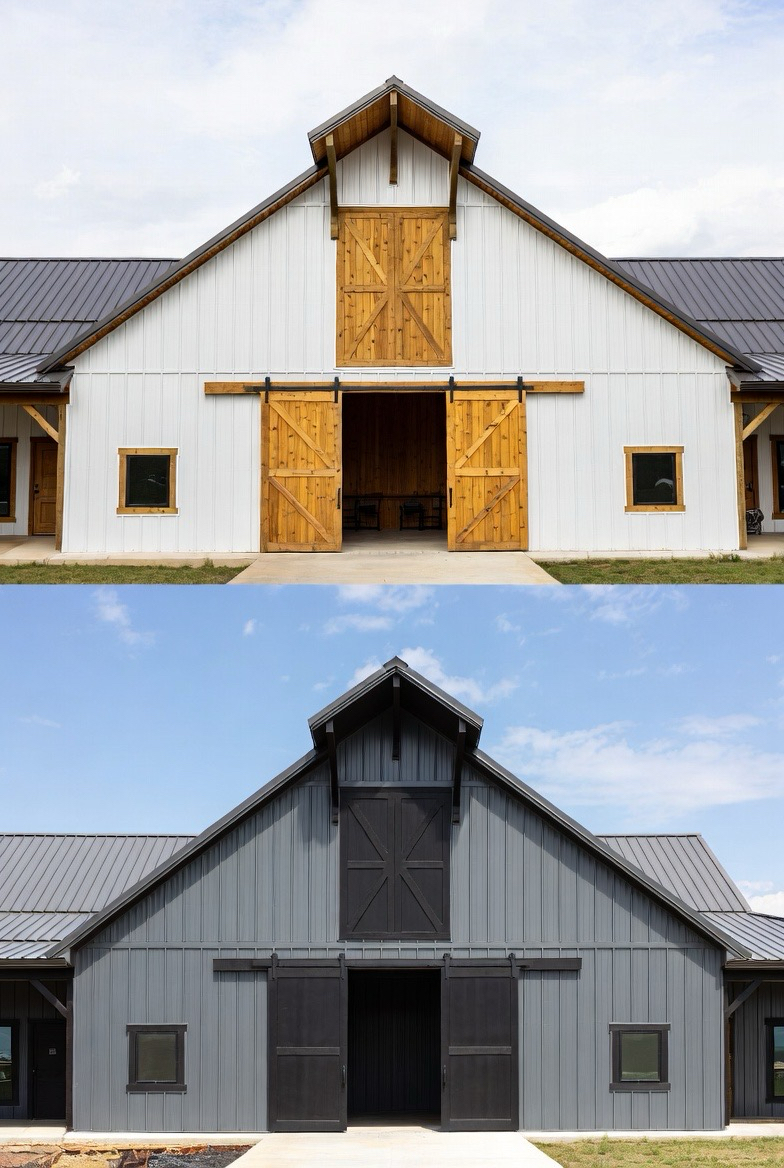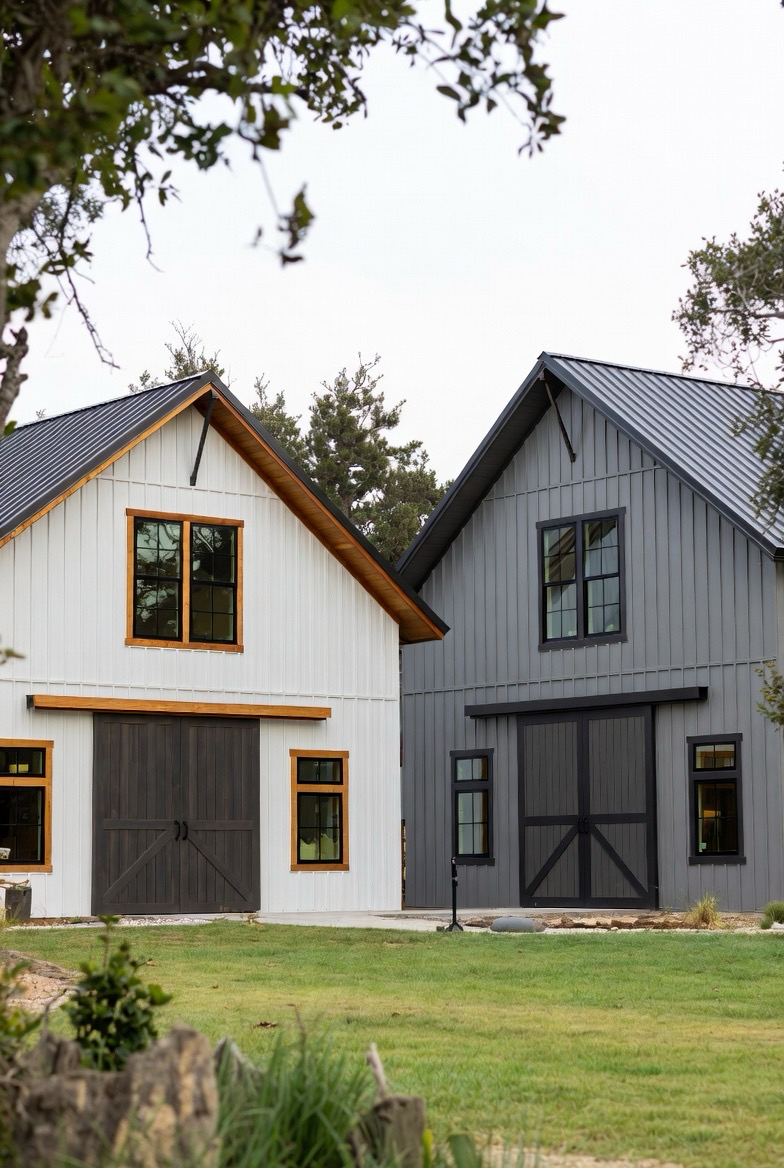 Using two contrasting exterior colors adds depth and interest. For example, pairing white with natural wood or gray with black creates a dynamic, layered look. The different tones highlight architectural features and break up the large barn structure visually. This design feels custom and thoughtfully styled. It’s great for homeowners who want a unique, eye-catching exterior.