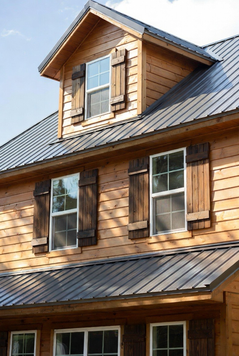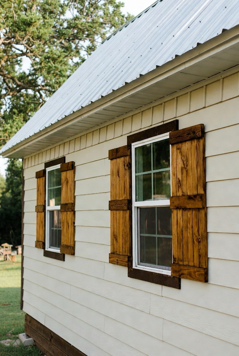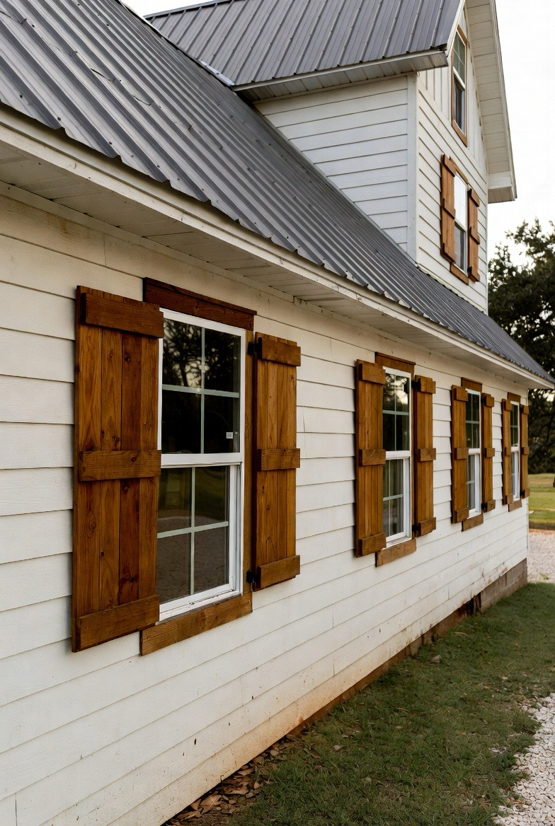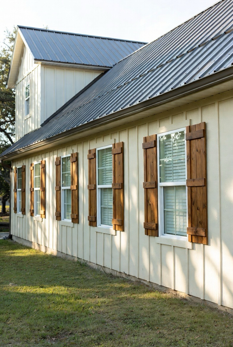 Wood shutters add charm and softness to a barndominium exterior. They frame windows beautifully and enhance the home’s country appeal. Paired with light siding and a metal roof, they create a warm, welcoming look. This style feels classic and lived-in. It’s perfect for families who love cozy, traditional vibes.