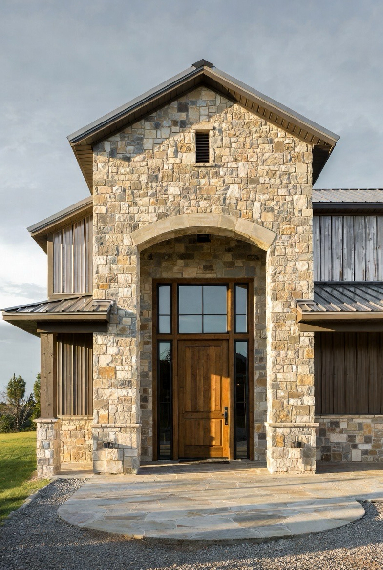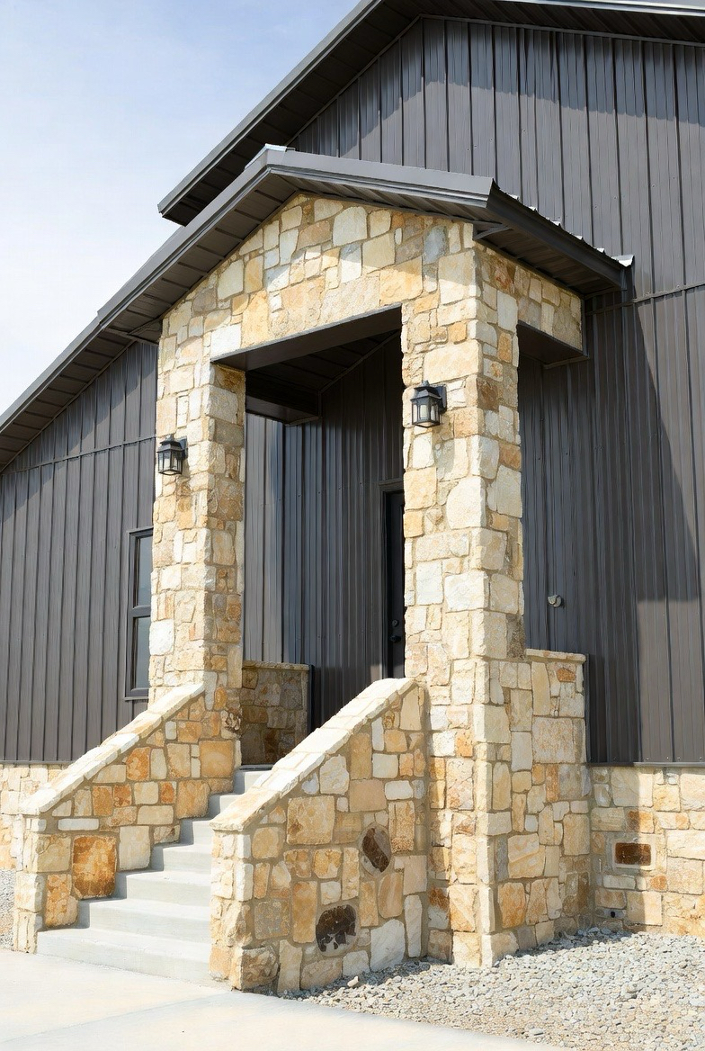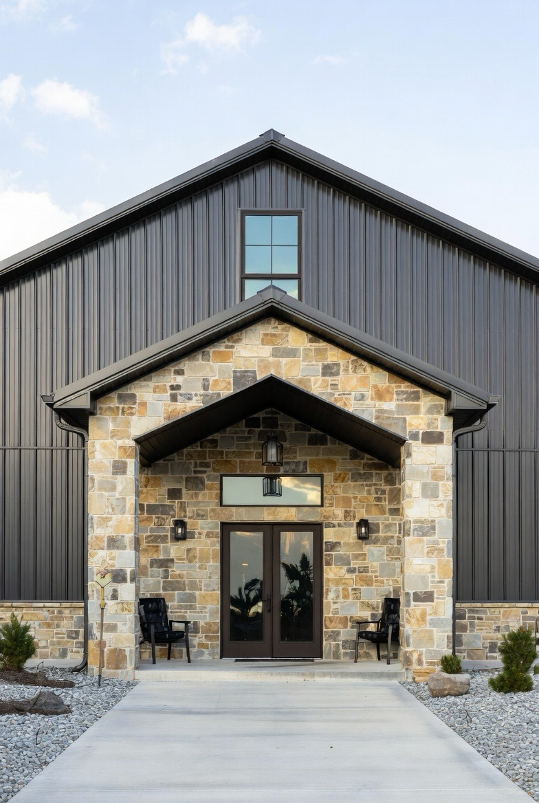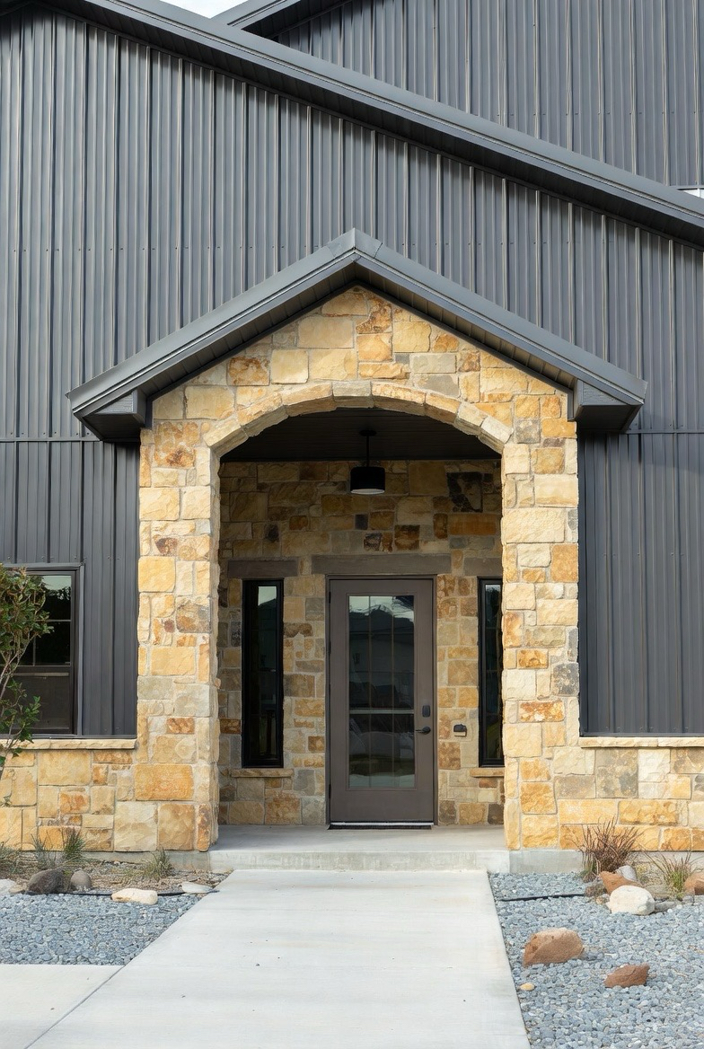 A stone entryway creates a strong focal point. It adds texture and a sense of luxury to the exterior. Stone around the front door or porch makes the entrance feel grand and grounded. It balances metal siding beautifully and adds visual weight. This style is perfect for homeowners who want a dramatic and elegant front façade.