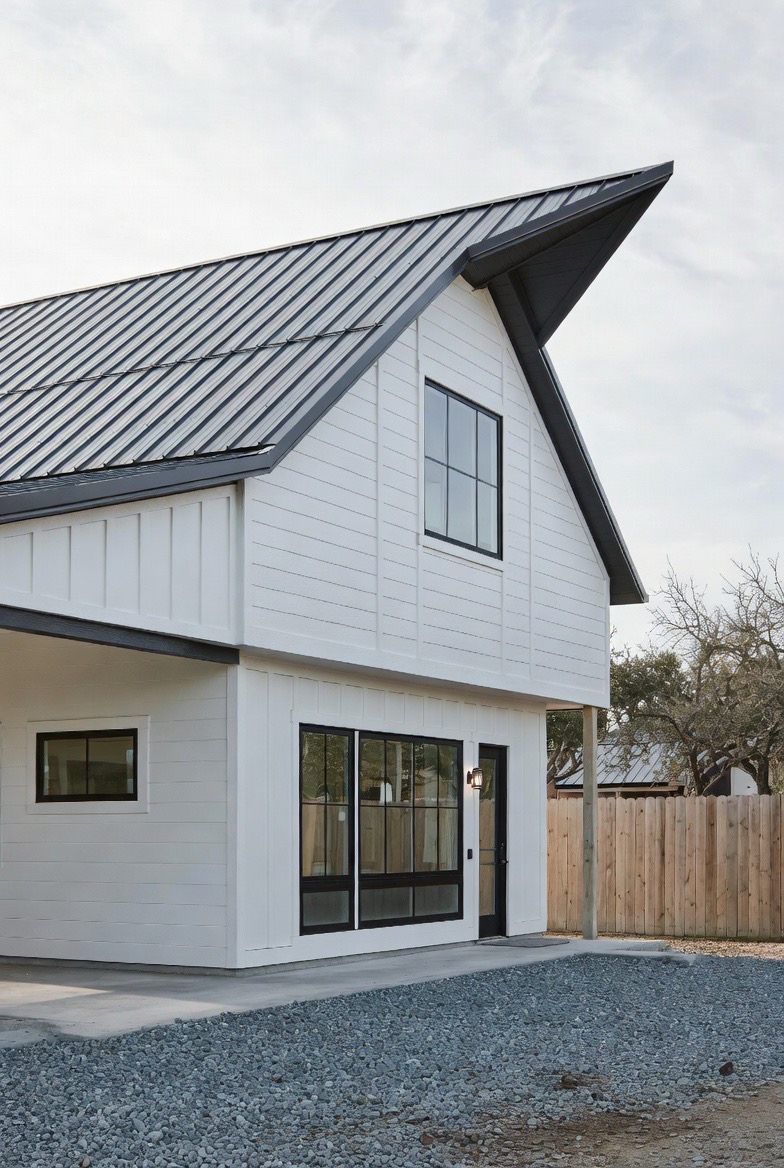 A minimalist exterior focuses on simple lines, limited colors, and clean materials. Think white or gray siding, black trim, and uncluttered design. This style feels modern, calm, and intentional. It’s perfect for those who love simplicity and sleek beauty. The barn shape remains strong while the details stay refined and subtle.