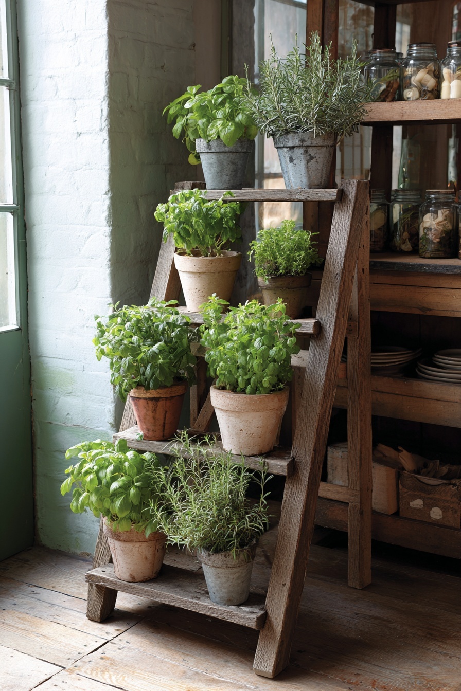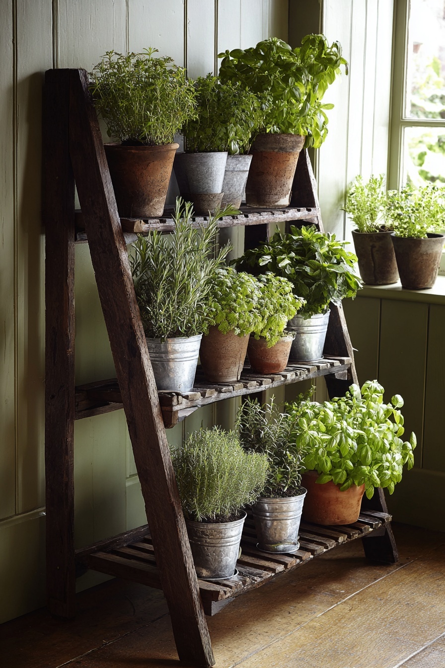 Using a tiered step ladder or a dedicated plant stand is a brilliant way to add depth and dimension to a small corner while maximizing light exposure for every plant. By staggering the heights of your herb pots, you ensure that the taller plants in the back do not cast shadows over the smaller ones in the front, allowing for a more even growth rate across your collection. This arrangement also makes it much easier to organize your herbs based on their watering needs, perhaps keeping the moisture-loving mint and parsley on one level and the drought-tolerant rosemary and sage on another. A wooden ladder adds a rustic, farmhouse charm to your decor, while a sleek metal stand can complement a more modern, minimalist aesthetic. It is a versatile solution that can easily be moved around to follow the shifting sun patterns throughout the different seasons of the year.