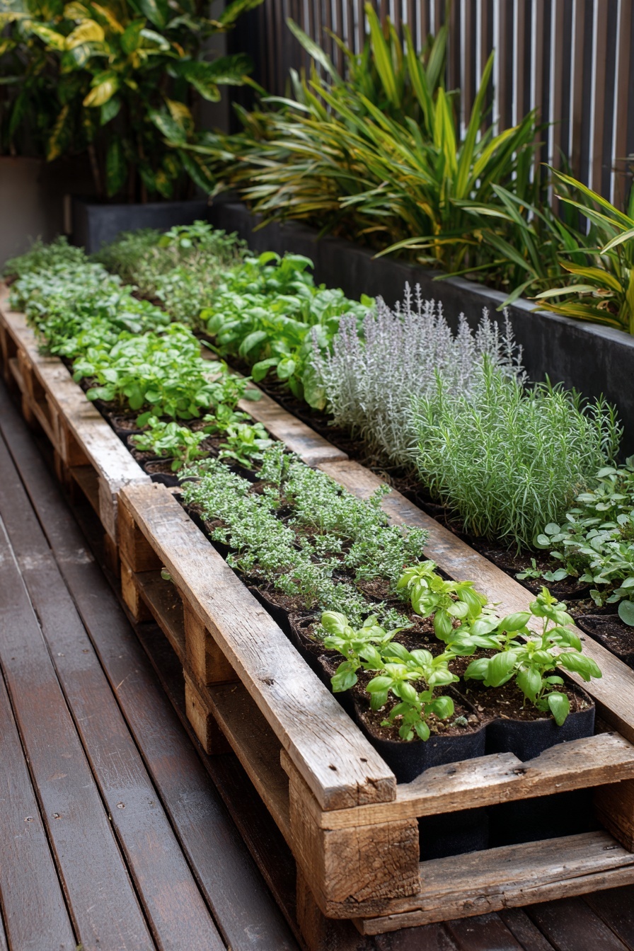 For the DIY enthusiast, a repurposed wooden pallet offers a sturdy and rustic framework for a comprehensive outdoor herb garden that takes up very little depth. By securing landscape fabric to the back and bottom of the pallet slats, you create a series of long, narrow troughs that are perfect for planting a wide variety of Mediterranean herbs. This setup is incredibly space-efficient, as the pallet can lean against a fence or a balcony wall, providing a large growing surface without encroaching on your walking area. You can even use chalkboard paint on the slats to label each herb, adding a touch of organized charm to your outdoor sanctuary. This approach is not only sustainable and cost-effective, but it also provides excellent drainage and airflow, which are essential for preventing root rot in herbs like lavender and rosemary. It is a bold, industrial statement piece that proves you can grow a significant amount of food in a very narrow footprint.