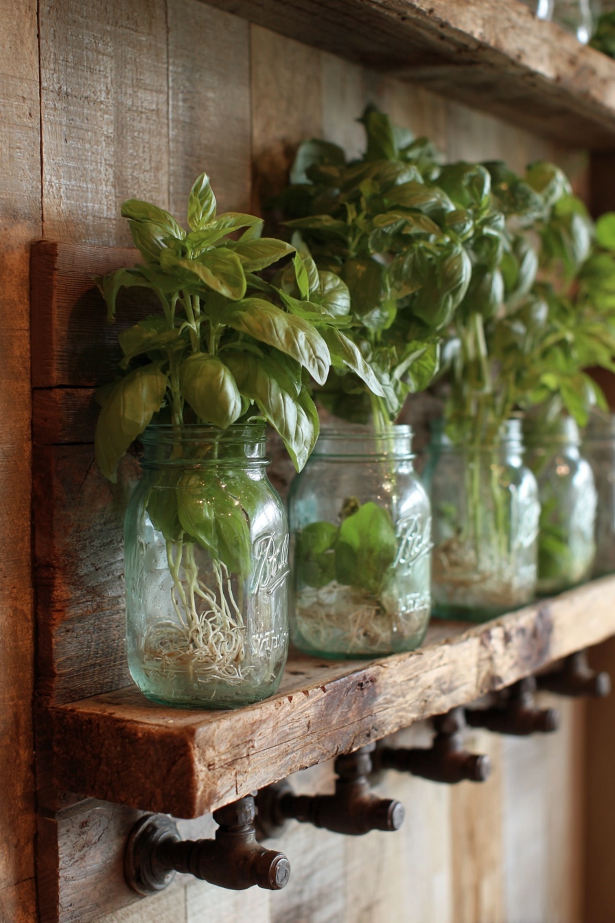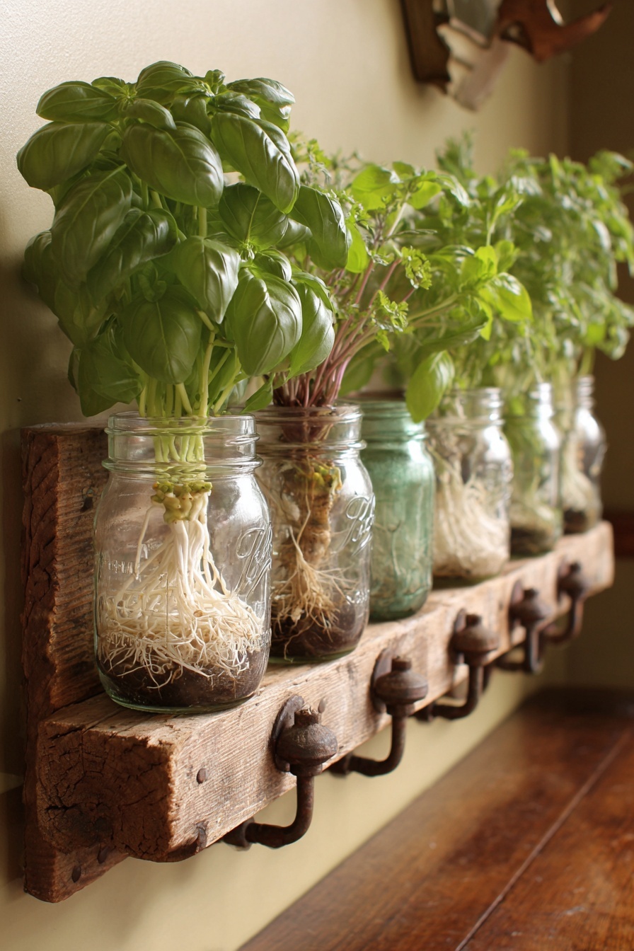 Mason jars attached to a reclaimed wood board provide a beautiful and organized way to grow herbs with a touch of vintage, farmhouse style. By using pipe clamps to secure the jars to the board, you create a sturdy and attractive wall display that can be mounted in a kitchen or a sunroom. Since glass jars do not have drainage holes, it is essential to add a layer of pebbles or charcoal at the bottom to prevent the roots from sitting in water. This setup is particularly well-suited for herbs that can be grown in water alone, such as basil or mint, which look stunning as their white roots grow visible through the clear glass. The combination of glass, wood, and vibrant greenery creates a sophisticated and cozy atmosphere, making your herb garden a central focal point of your interior design. It is a perfect blend of form and function that celebrates the simple beauty of nature.