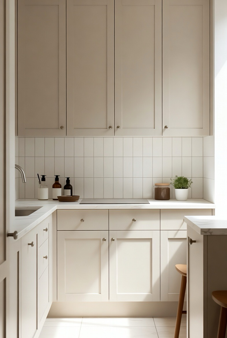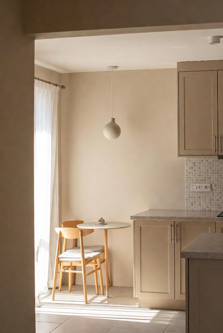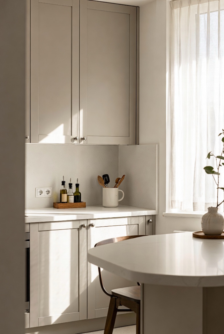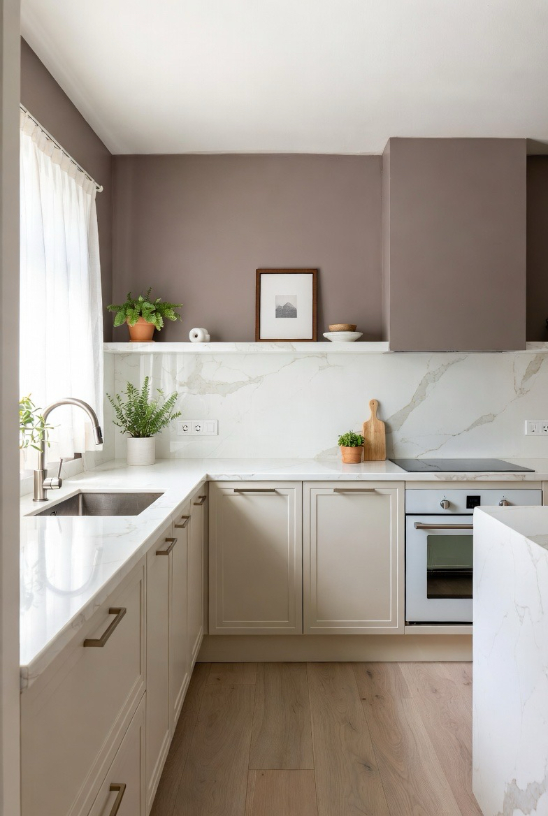 A soft neutral palette instantly makes your kitchen feel calm, clean, and elevated. Shades like cream, beige, warm gray, and soft taupe reflect light beautifully and create a timeless backdrop. These colors allow your cabinets, countertops, and decor to shine without overwhelming the space. Neutrals also make your kitchen feel bigger and more open, especially in small layouts. Pairing soft walls with light wood or marble surfaces adds warmth and sophistication. A neutral kitchen doesn’t mean boring, it means balanced, elegant, and endlessly adaptable to different styles and seasons.