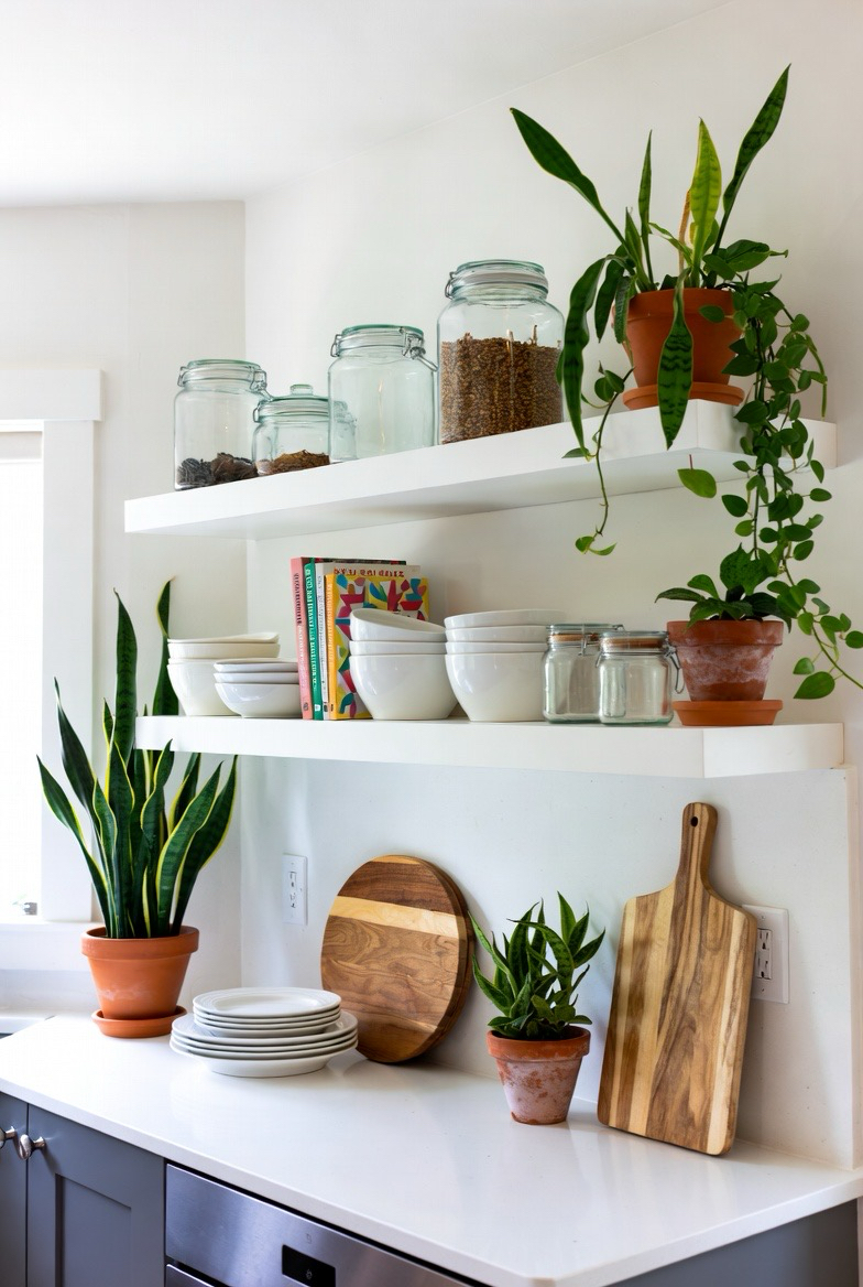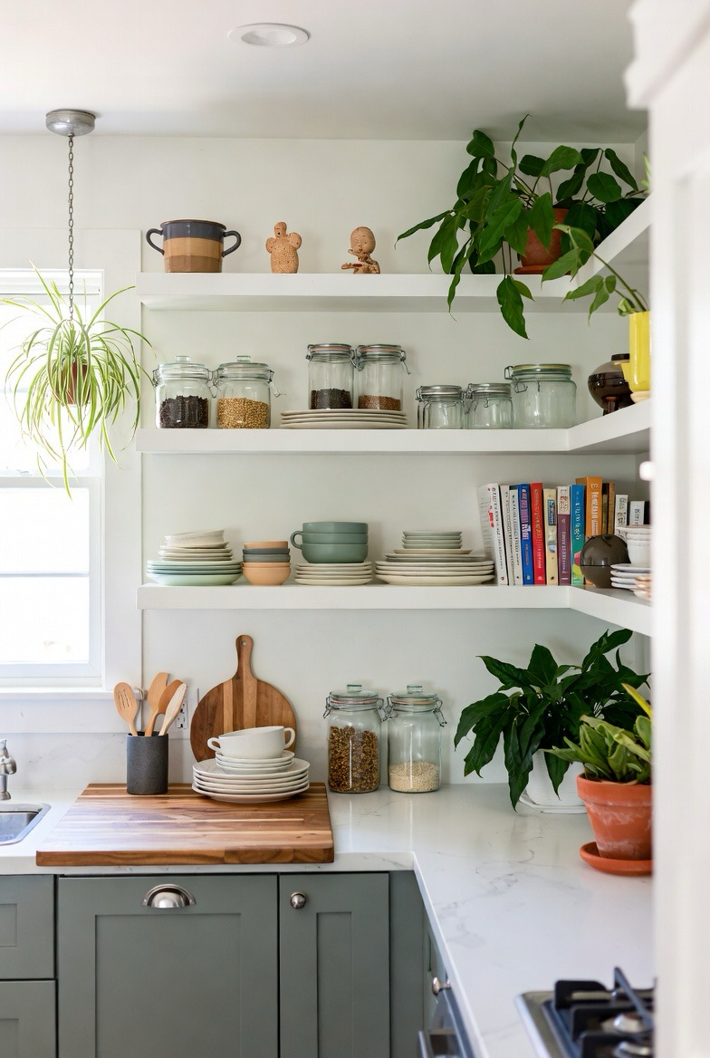 Open shelves turn everyday kitchen items into decor. Instead of hiding everything behind cabinets, you can showcase beautiful dishes, glass jars, cookbooks, and plants. The key is to keep it intentional and uncluttered. Choose a color theme and stick to it for a cohesive look. Open shelving makes your kitchen feel airy and personal. It adds charm and character while still being practical. When styled well, your kitchen becomes both functional and visually pleasing.