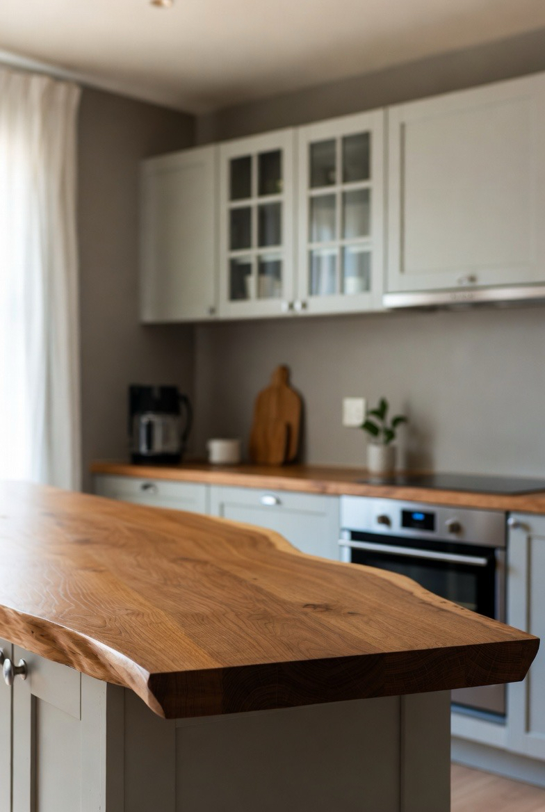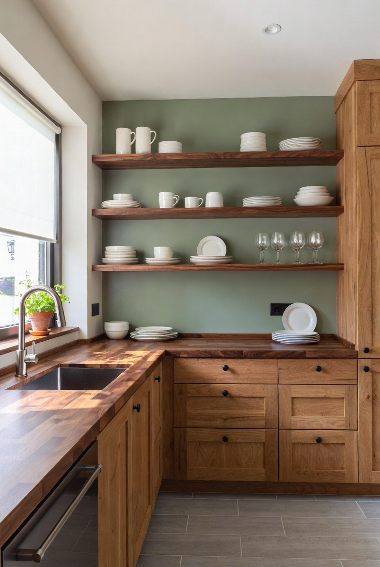 Wood instantly adds warmth and texture. Whether it’s oak cabinets, walnut shelves, or a butcher-block countertop, wood creates a cozy, organic feel. It softens modern kitchens and enriches minimalist designs. The natural grain brings life and authenticity to the space. Wood accents make your kitchen feel inviting and grounded. They pair beautifully with white, sage green, and soft gray tones.