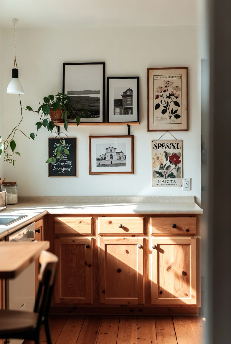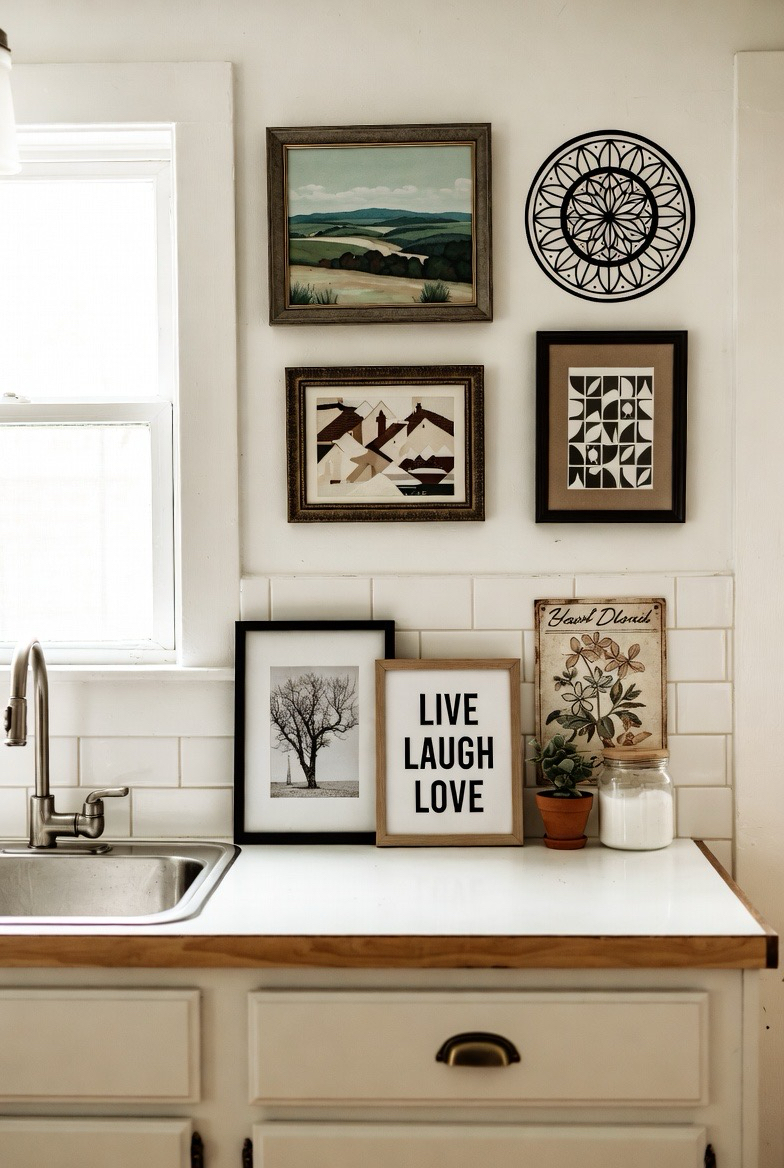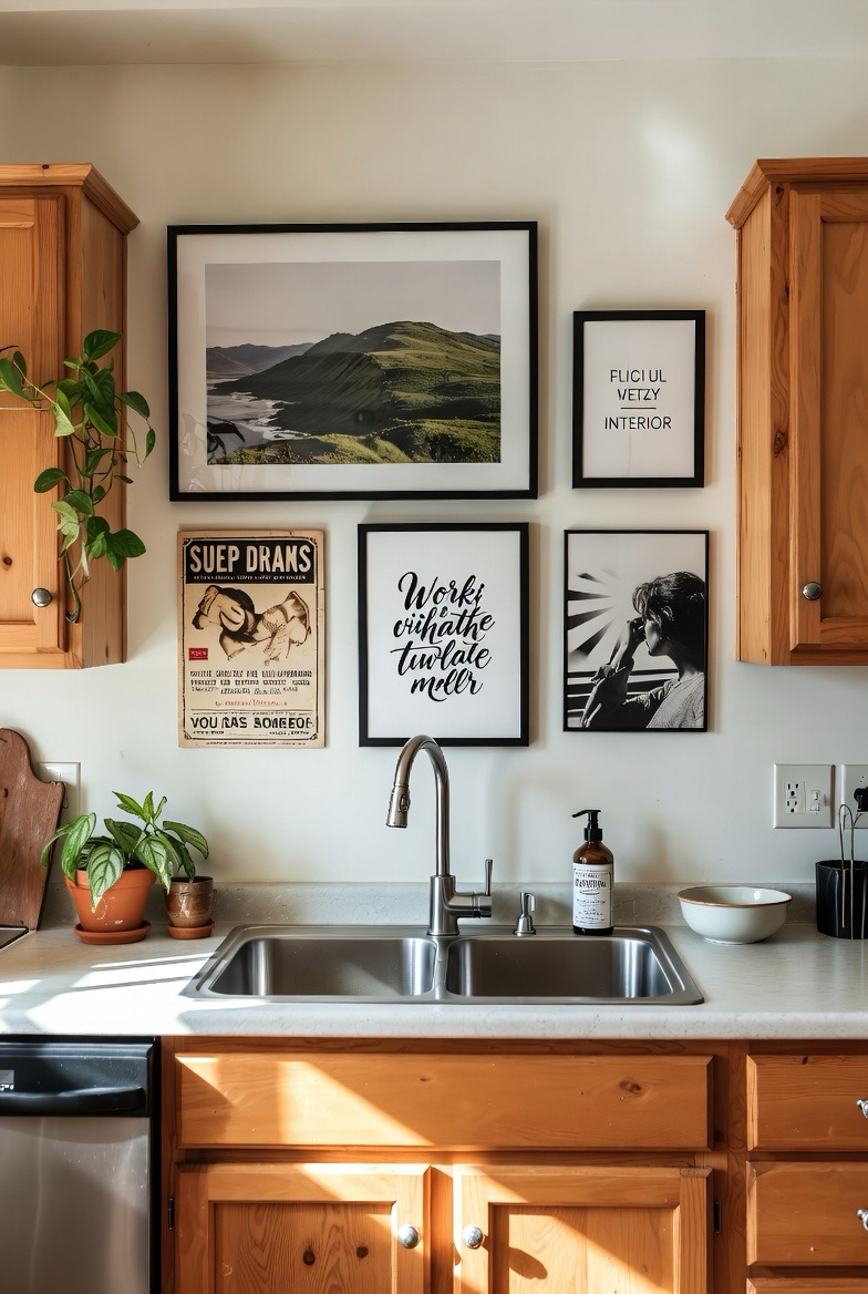 Art in the kitchen adds personality. Framed prints, quotes, or vintage pieces make the space feel lived-in and creative.