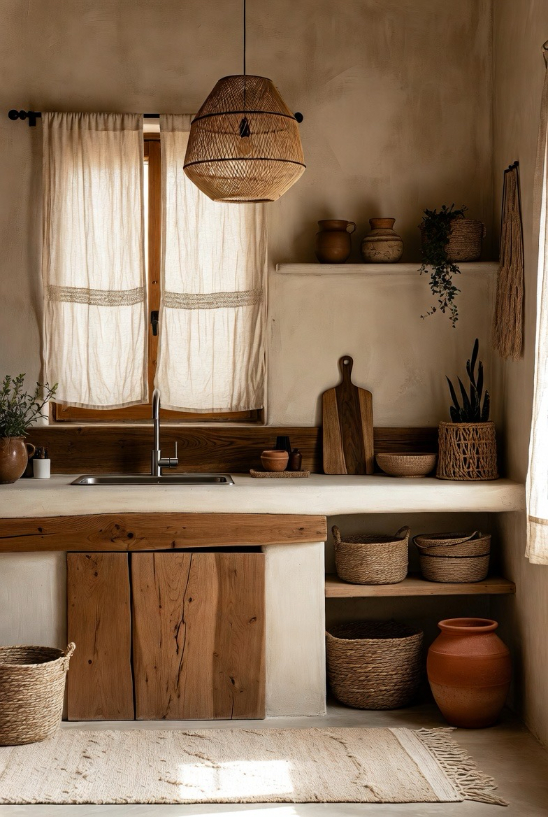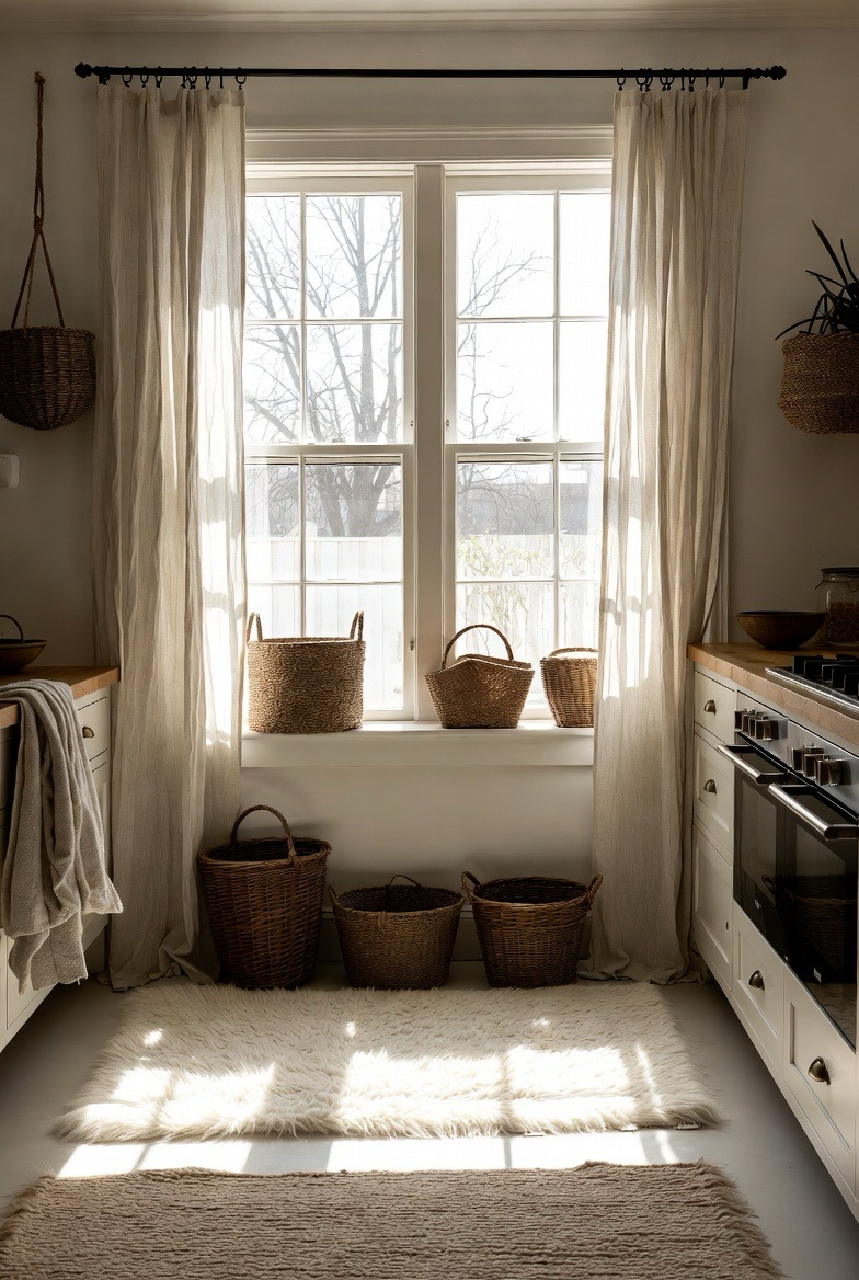 Adding linen curtains, soft rugs, and woven baskets introduces texture. It makes the kitchen feel cozy and layered.