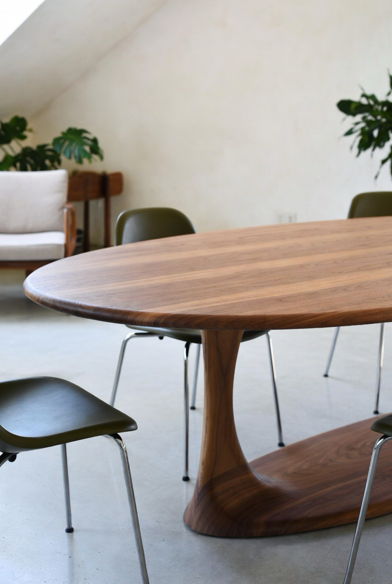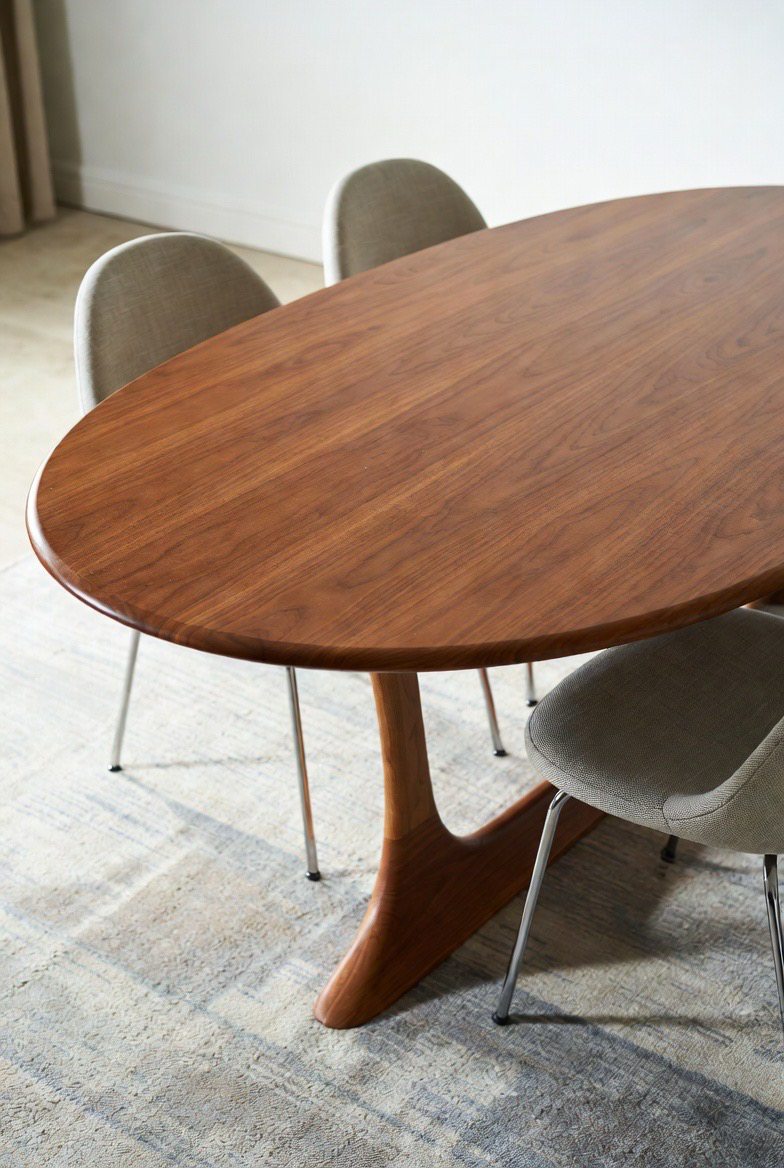 This oval walnut pedestal table captures the heart of mid-century modern design with its smooth silhouette and sculptural base. The single pedestal allows for flexible seating while keeping the look clean and uncluttered. Rich walnut tones add warmth and depth, making it perfect for both intimate dinners and stylish gatherings. Pair it with molded chairs or upholstered seating to balance comfort and elegance. Its flowing shape softens angular spaces and creates a welcoming dining environment that feels refined yet relaxed.