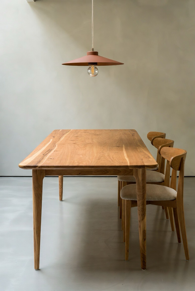 A slab-top mid-century dining table celebrates simplicity and material beauty. Thick wooden tops paired with slim legs create a grounded yet elegant presence. This style works especially well in modern homes that value natural textures and clean design. The focus remains on the wood’s grain and craftsmanship, making every table feel one-of-a-kind. Add neutral textiles and soft lighting to enhance its understated, timeless appeal.