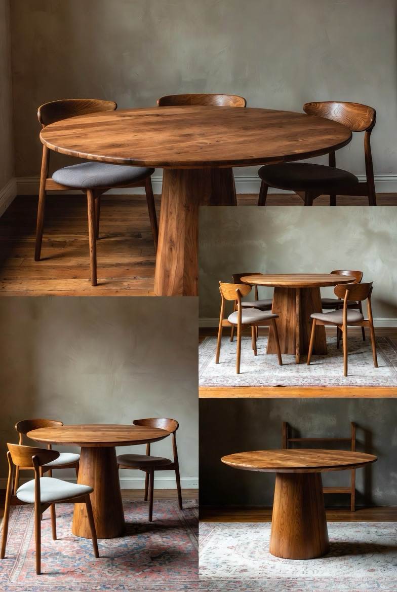 Round mid-century modern dining tables encourage connection and conversation. Crafted from solid wood, these tables showcase expert craftsmanship and organic charm. The circular shape pairs beautifully with curved chairs and soft lighting, creating a cozy yet sophisticated atmosphere. Ideal for smaller dining rooms, a round table maximizes space while maintaining strong visual impact. Its seamless blend of form and function makes it a favorite for homeowners seeking warmth, balance, and classic mid-century elegance.