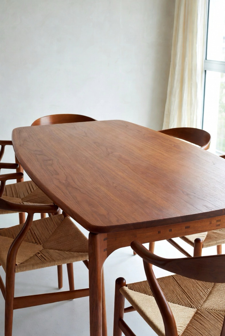 Boat-shaped dining tables are a signature mid-century silhouette, featuring gently curved edges and tapered ends. This shape feels softer than a standard rectangle while still offering ample seating. Crafted in walnut or teak, it showcases beautiful wood grain and expert joinery. The unique outline adds subtle interest without overpowering the room. Styled with classic wishbone or spindle chairs, it delivers a perfect mix of sophistication and approachability.