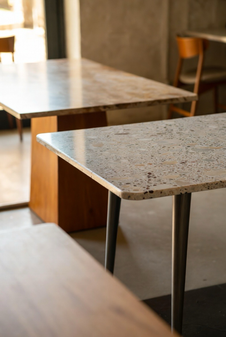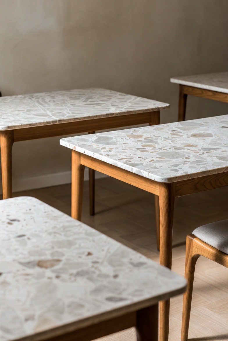 Stone-top dining tables introduce a luxurious twist to mid-century modern design. Marble or terrazzo surfaces add texture and contrast against wooden bases. The combination feels sophisticated yet grounded, making it ideal for upscale interiors. This style elevates the dining experience, blending natural materials with iconic forms. Keep surrounding décor minimal to allow the table’s materials and silhouette to take center stage.