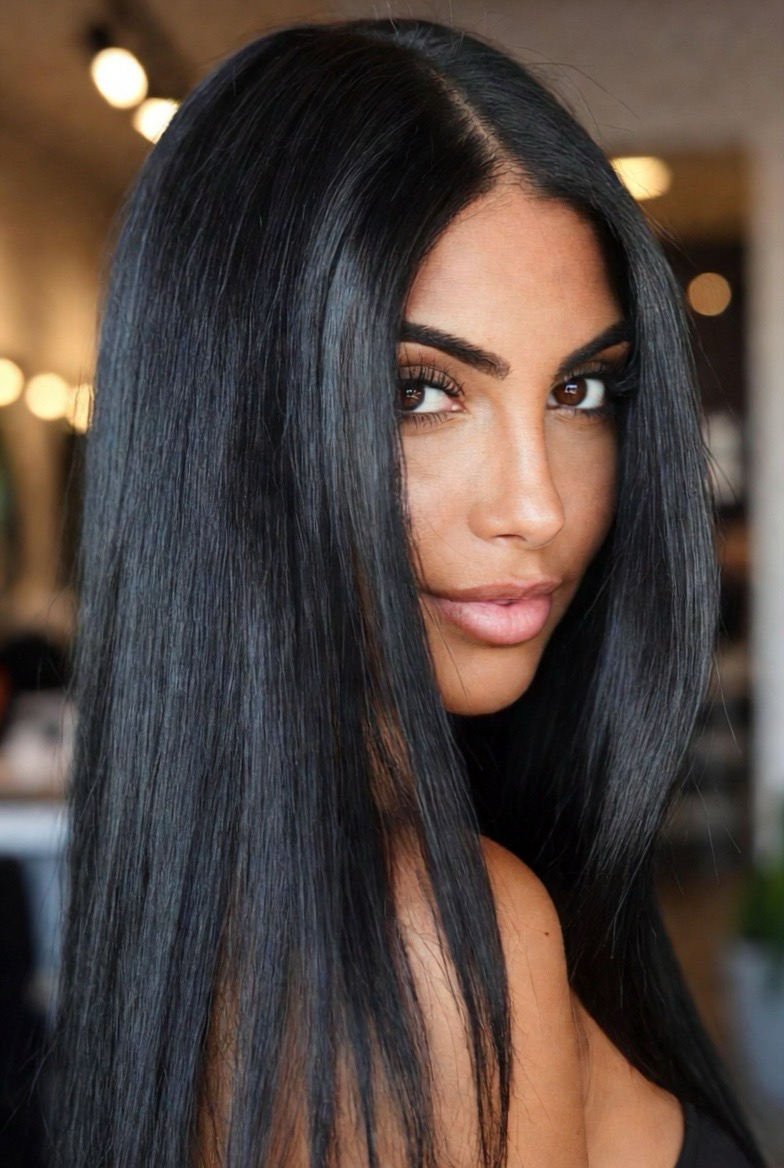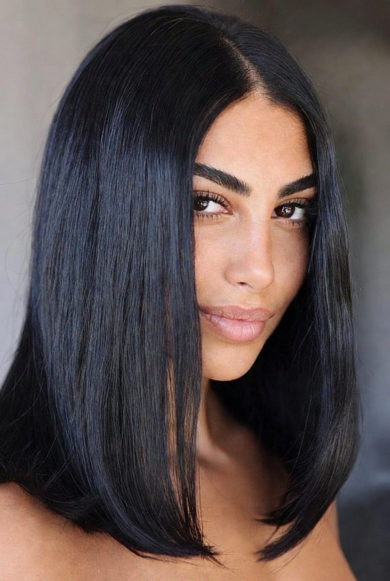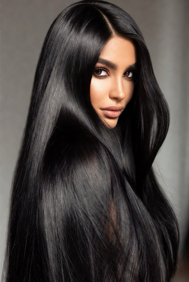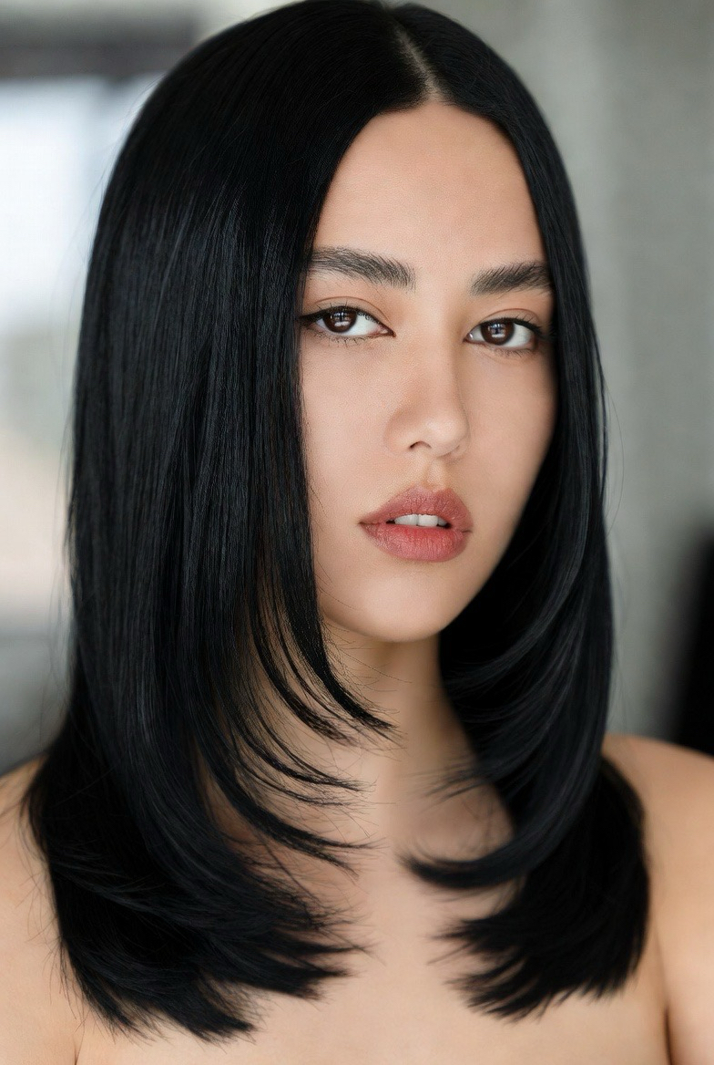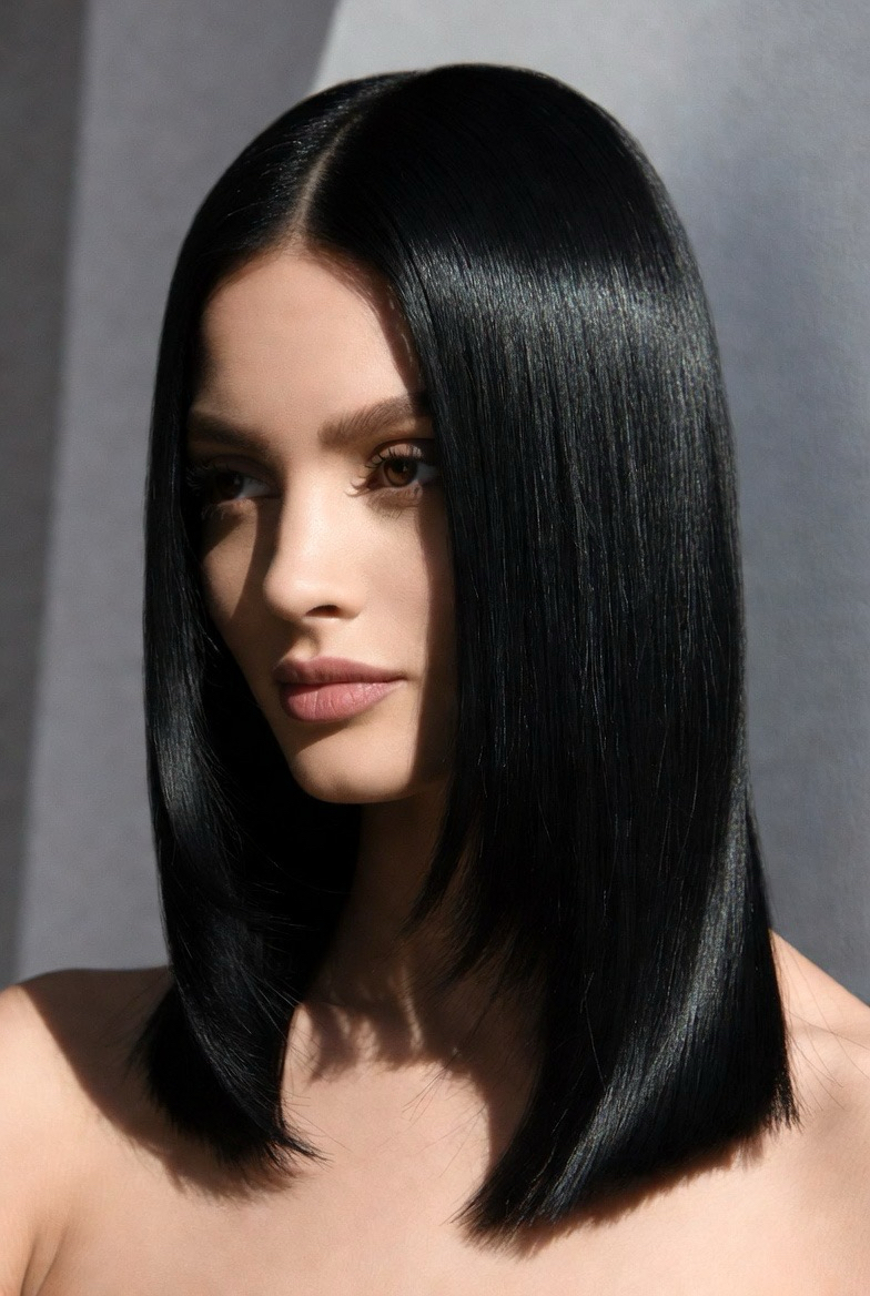 Jet black hair amplifies shine and drama. When styled sleek and straight, it delivers a striking, glassy finish that feels bold and luxurious. This look pairs beautifully with minimal layers for maximum impact.