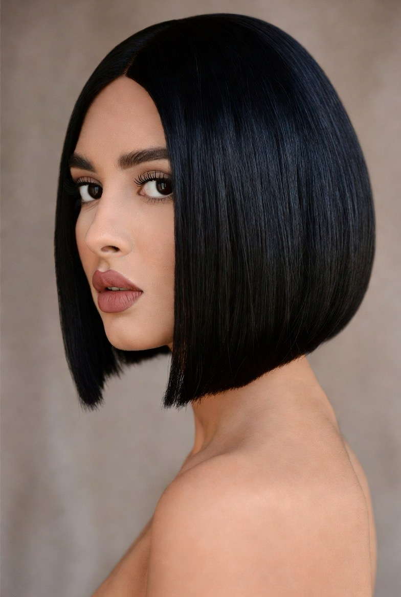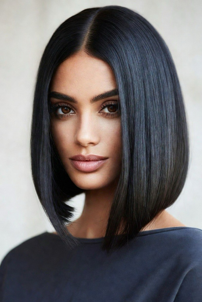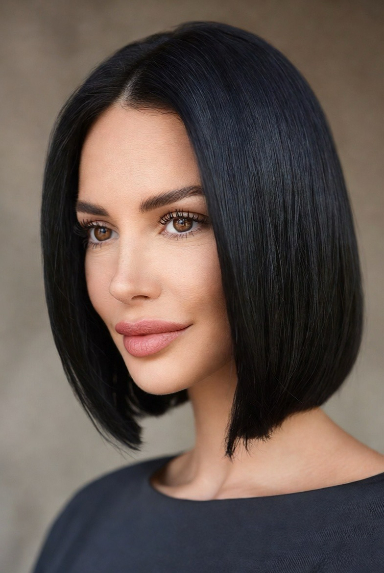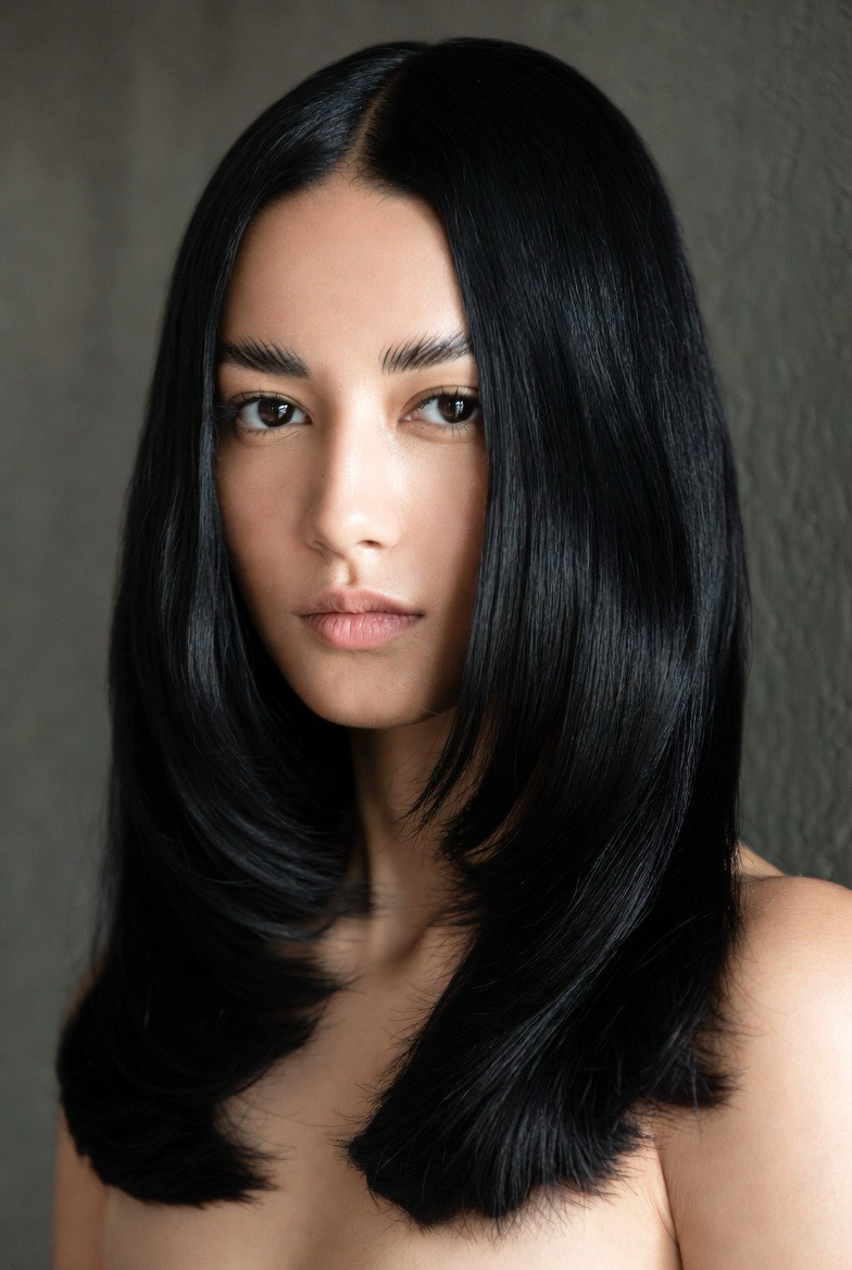 Jet black hair amplifies shine and drama. When styled sleek and straight, it delivers a striking, glassy finish that feels bold and luxurious. This look pairs beautifully with minimal layers for maximum impact.