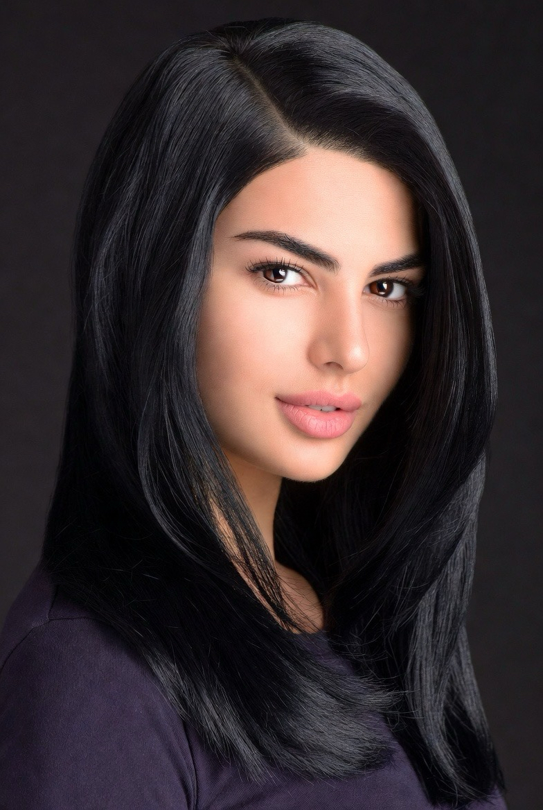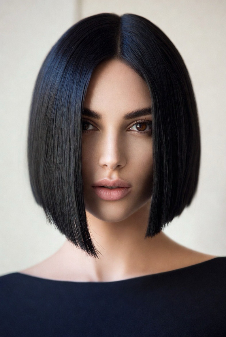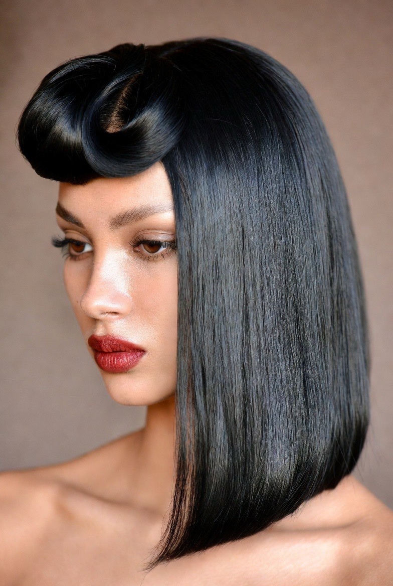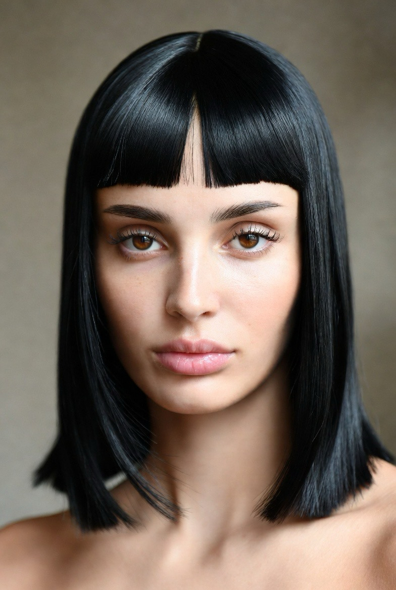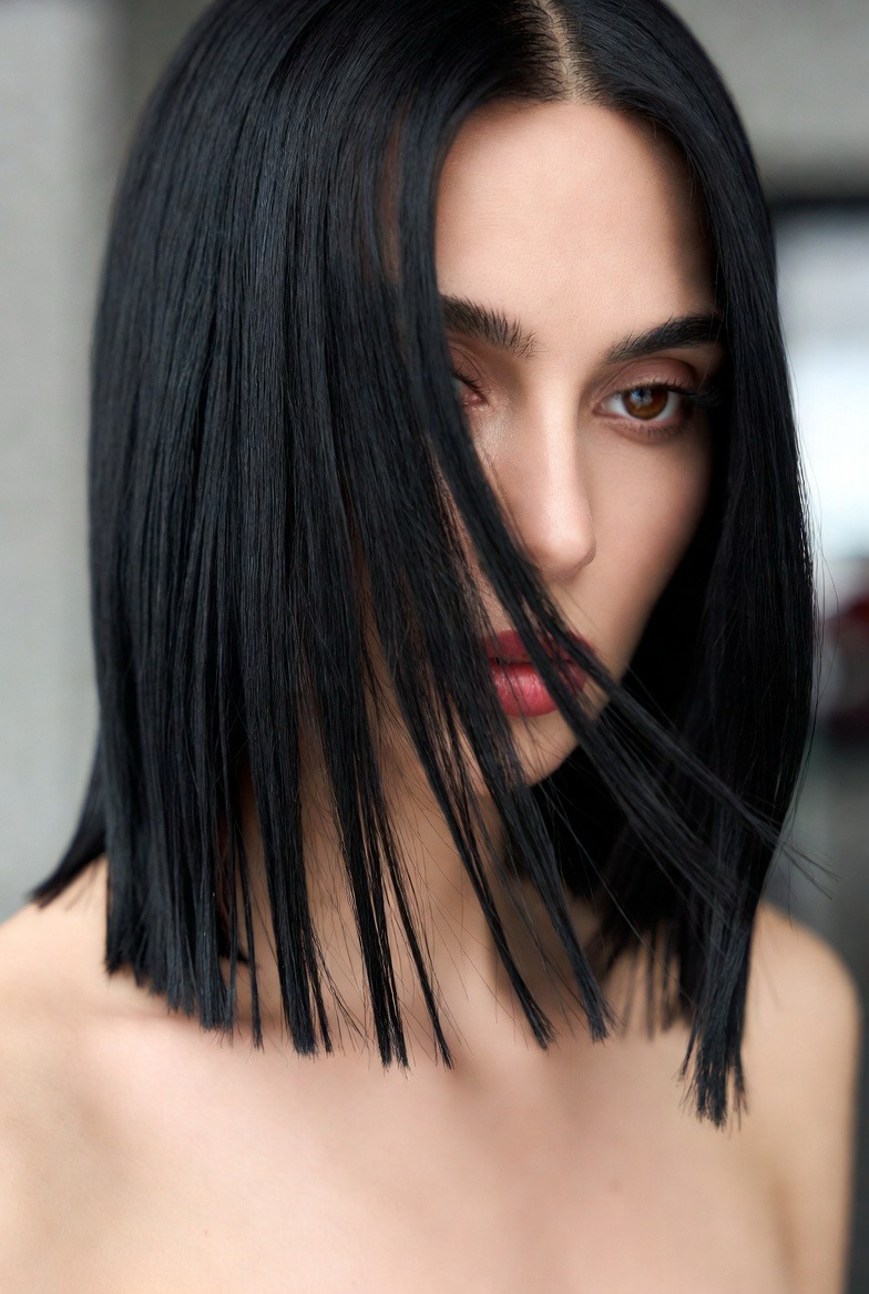 Jet black hair amplifies shine and drama. When styled sleek and straight, it delivers a striking, glassy finish that feels bold and luxurious. This look pairs beautifully with minimal layers for maximum impact.