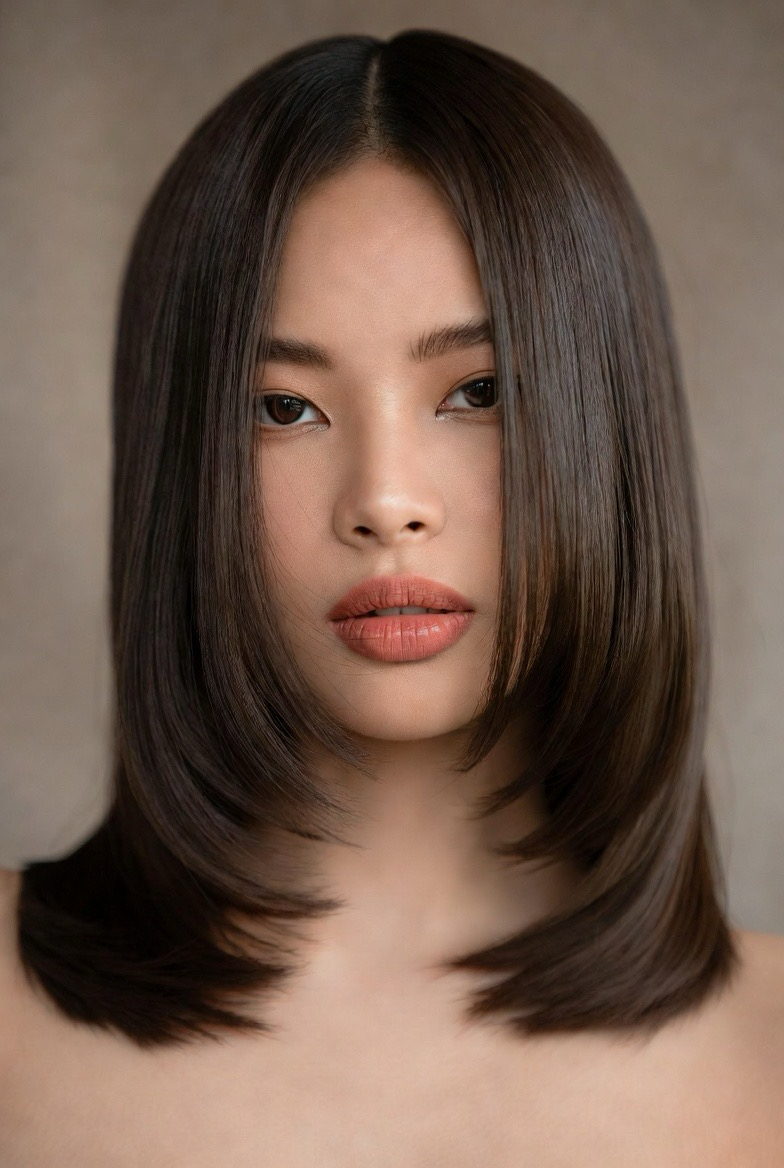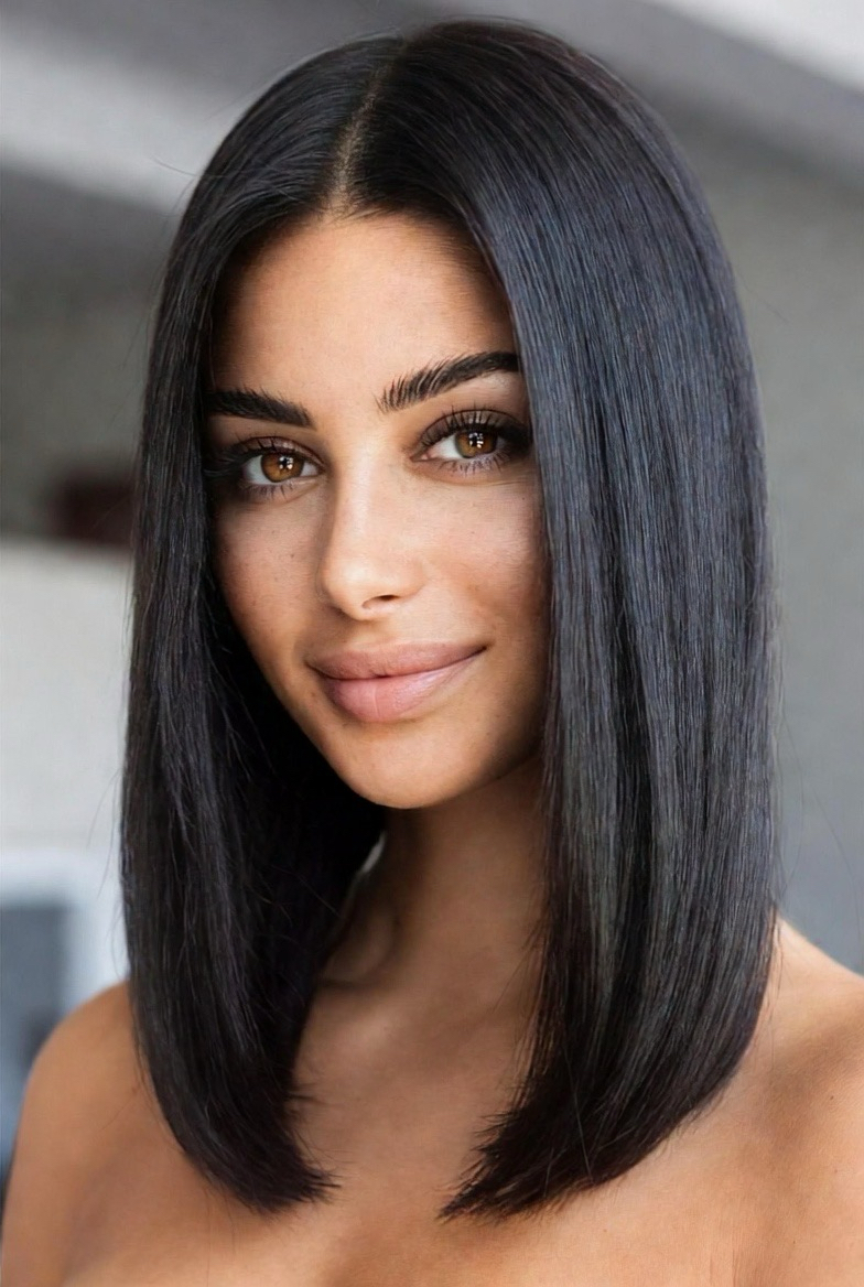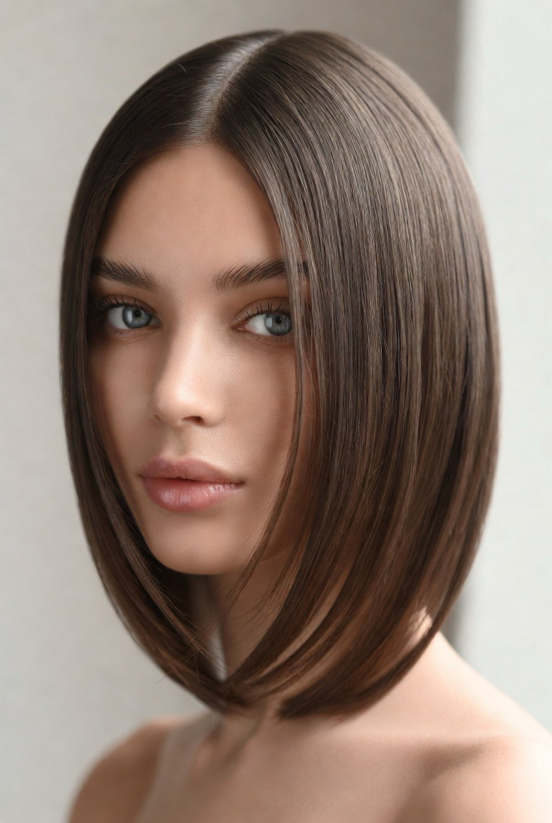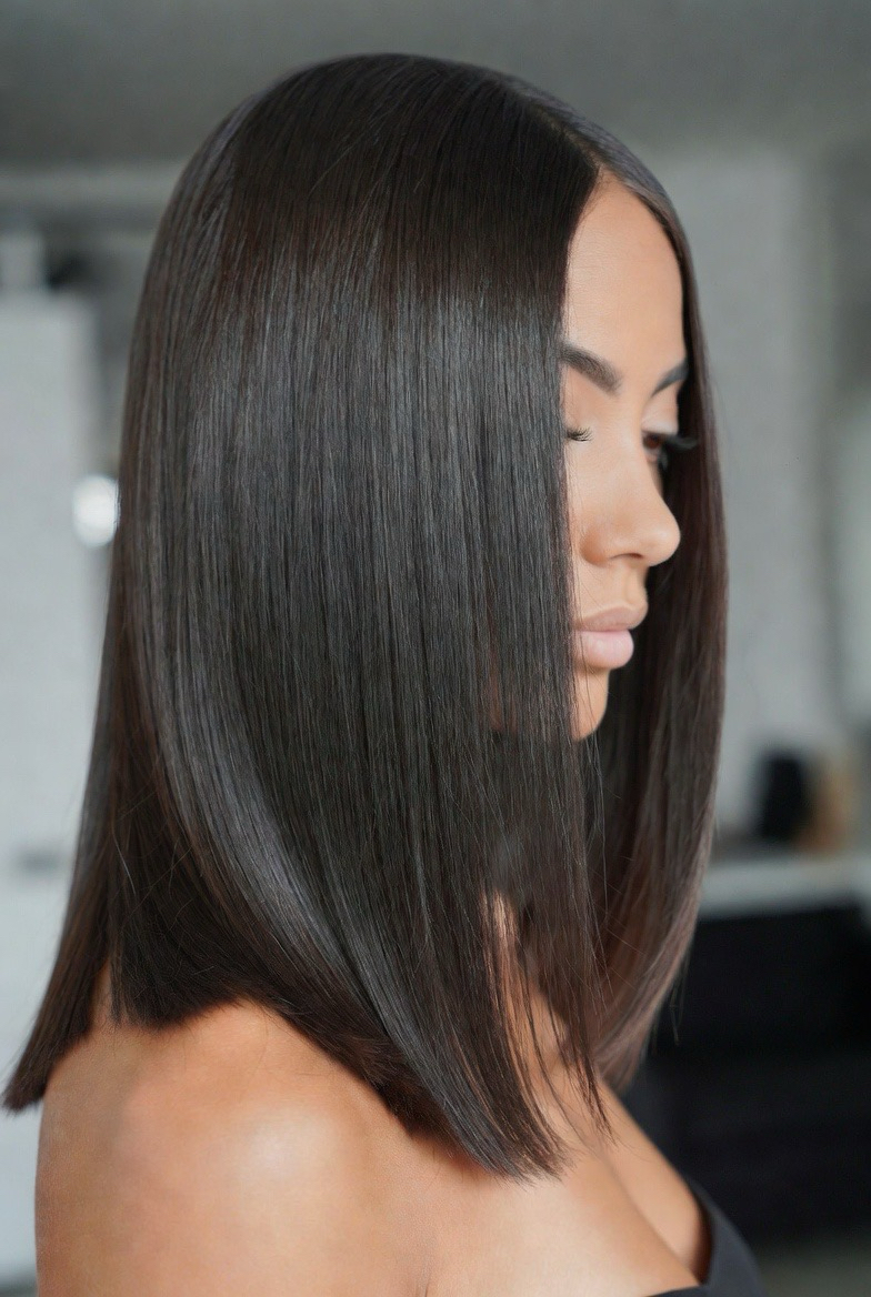 A straight lob offers versatility and modern charm. Sitting just at or below the shoulders, this cut frames the face beautifully while remaining easy to style. Its clean shape and glossy finish make it ideal for everyday elegance.