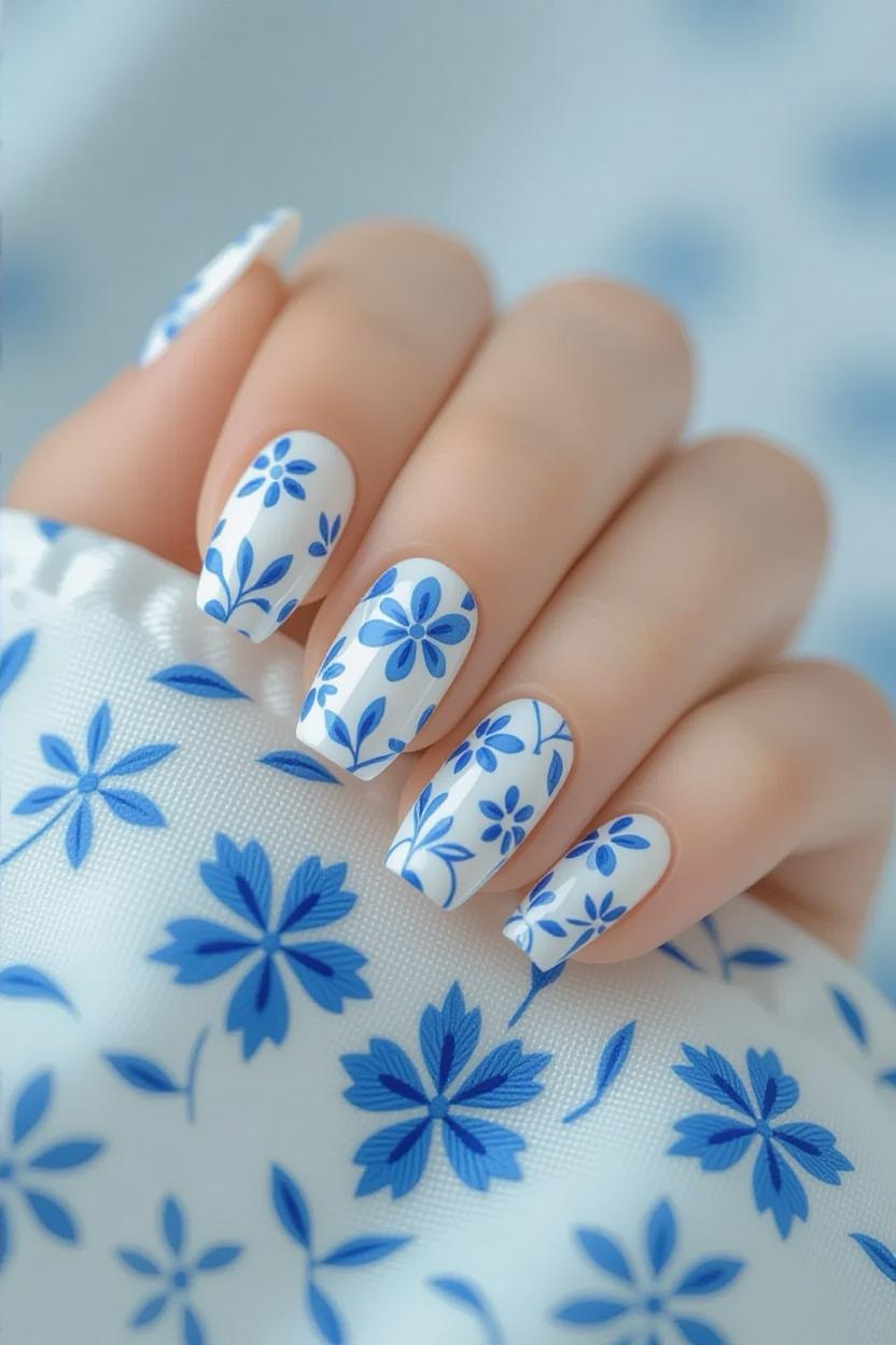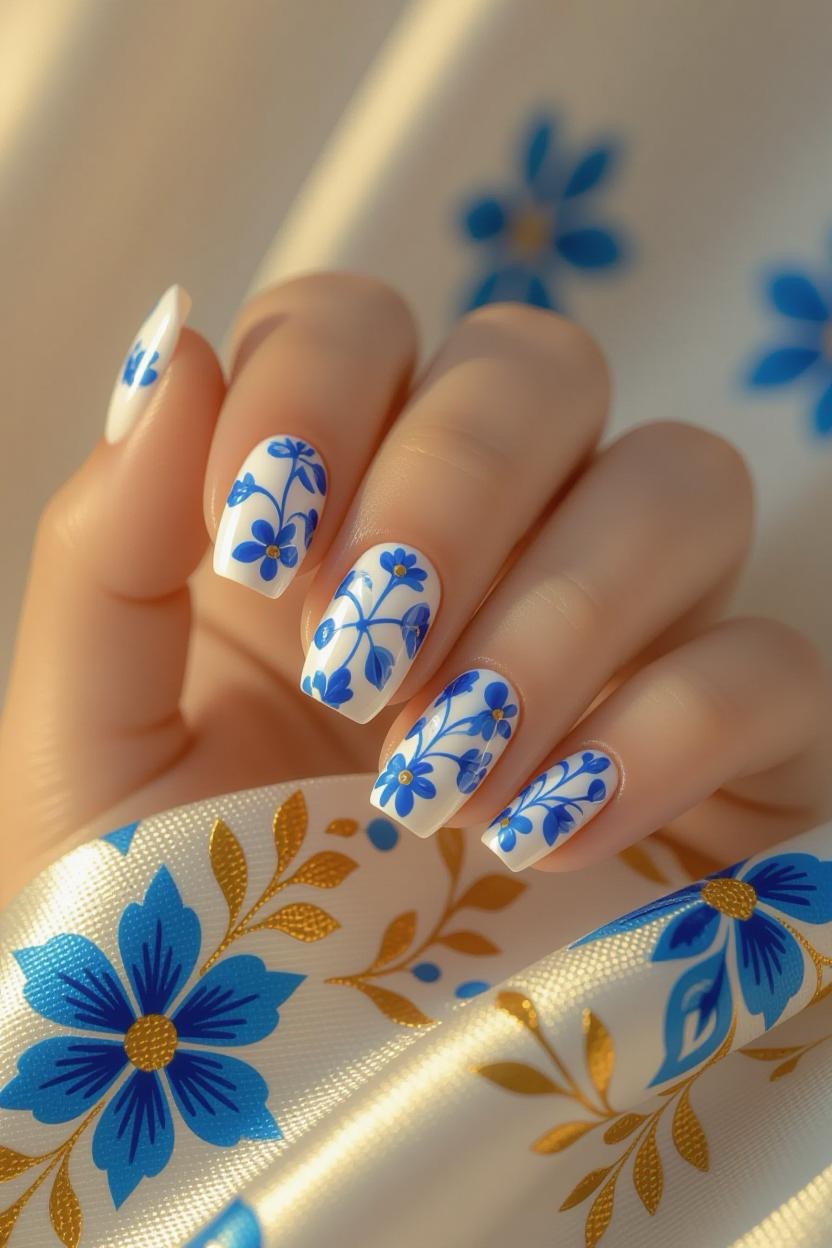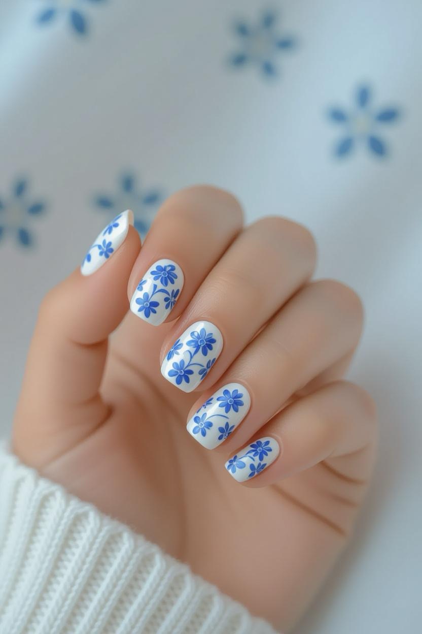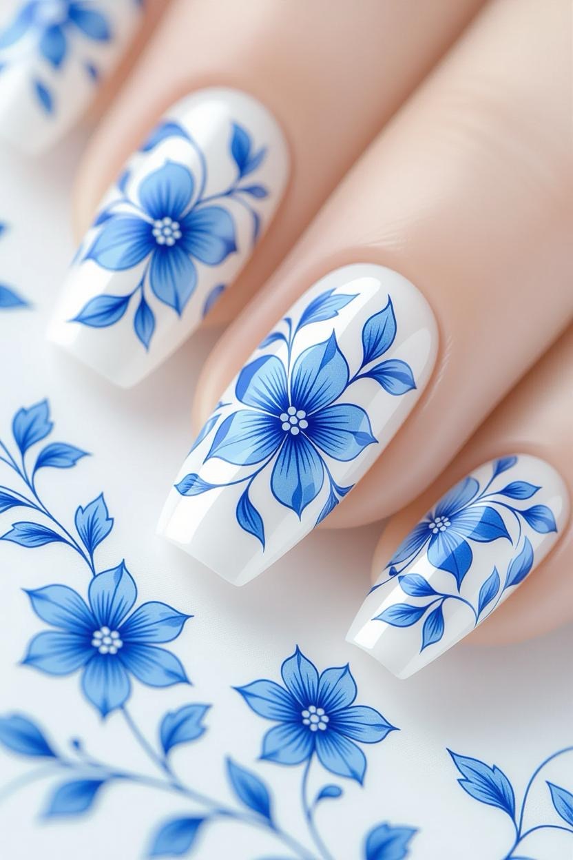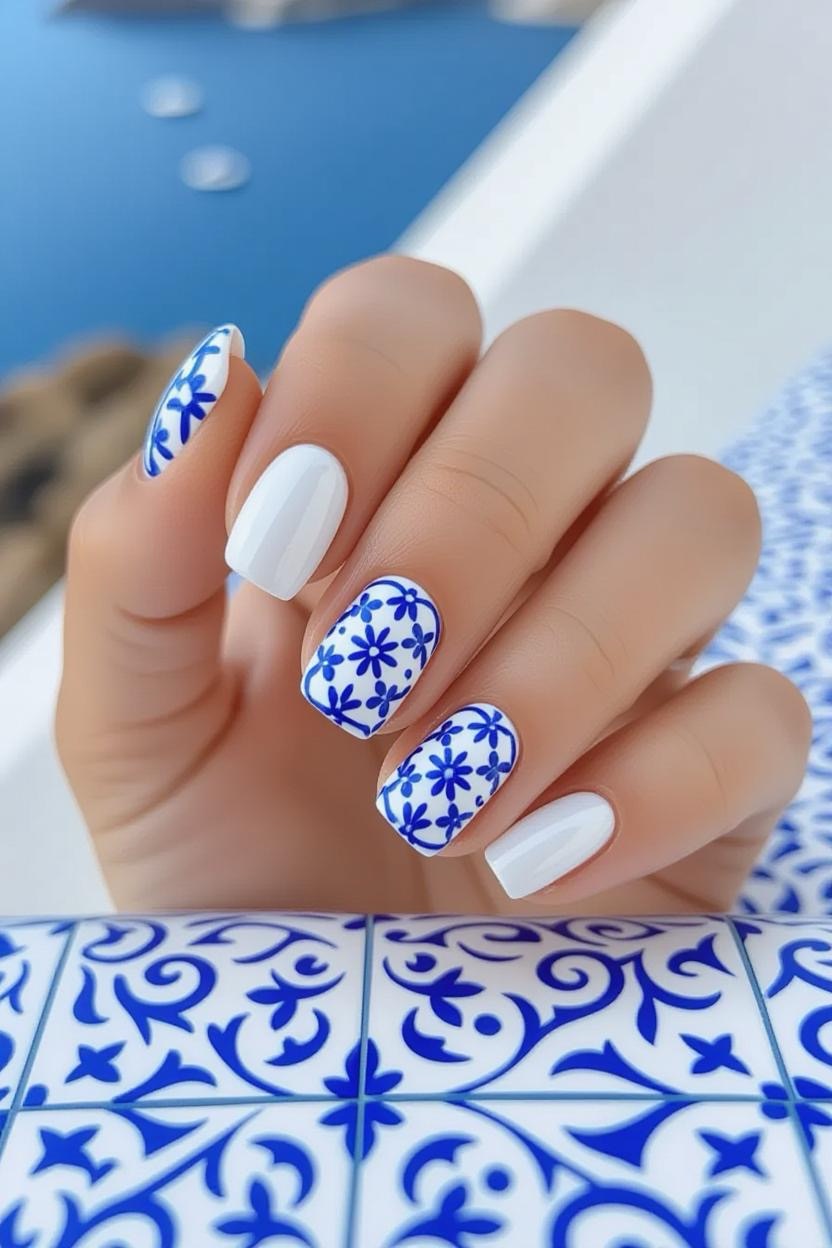 Soft white nails with blue floral patterns inspired by Greek textiles create a delicate, feminine look that works for any season.