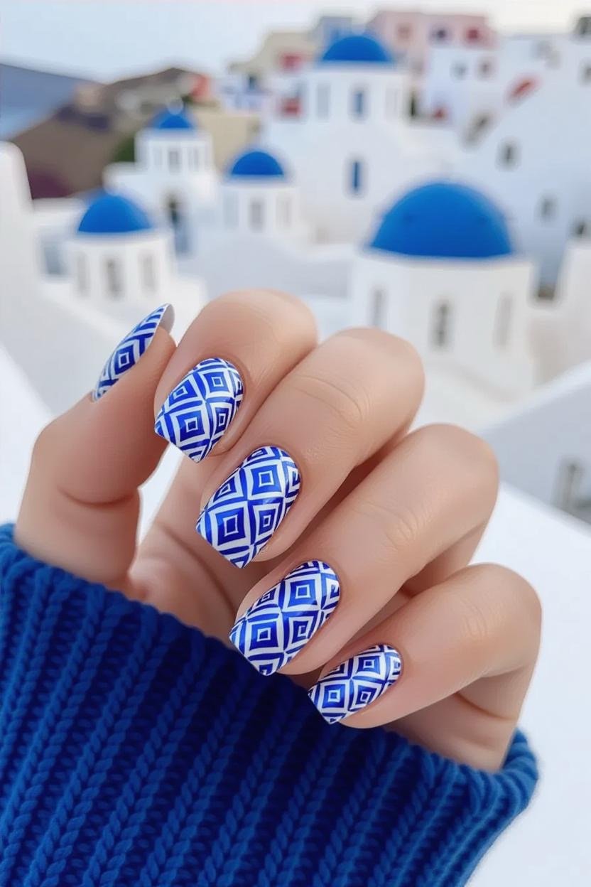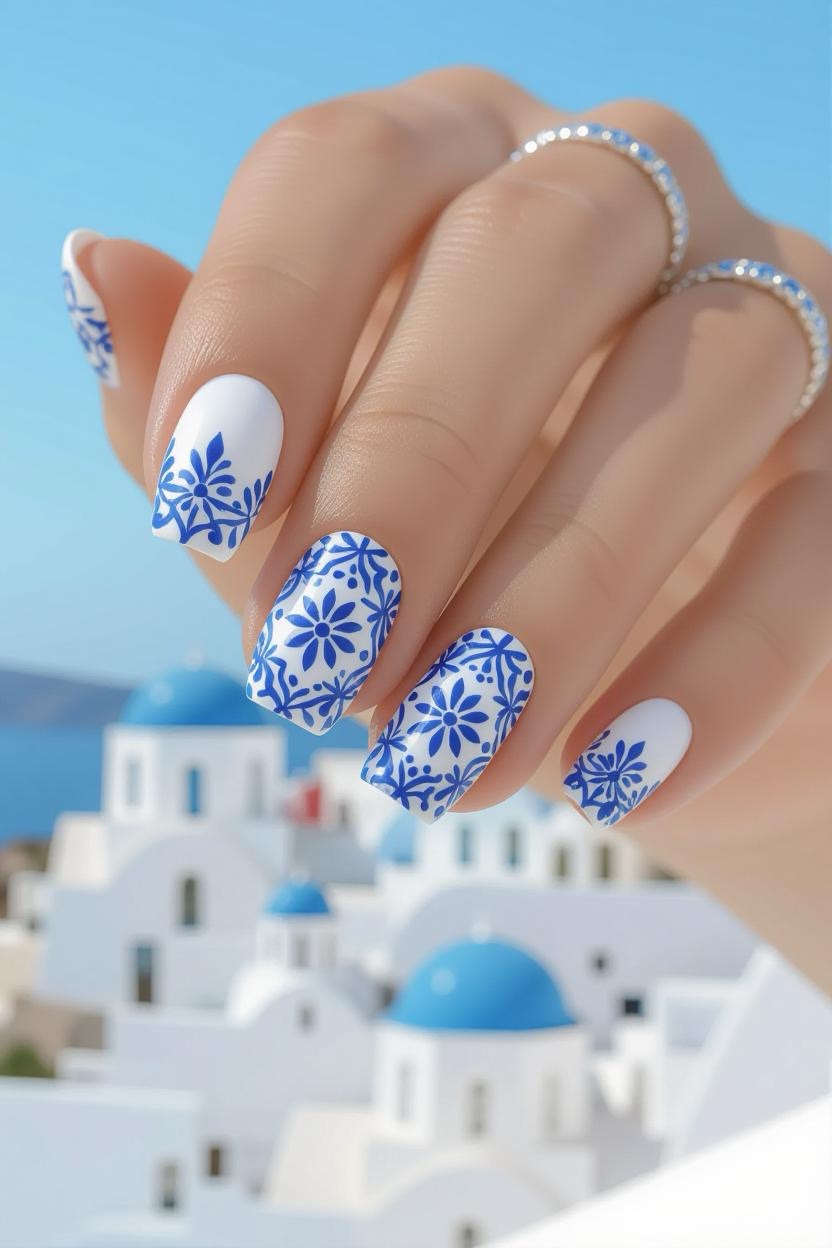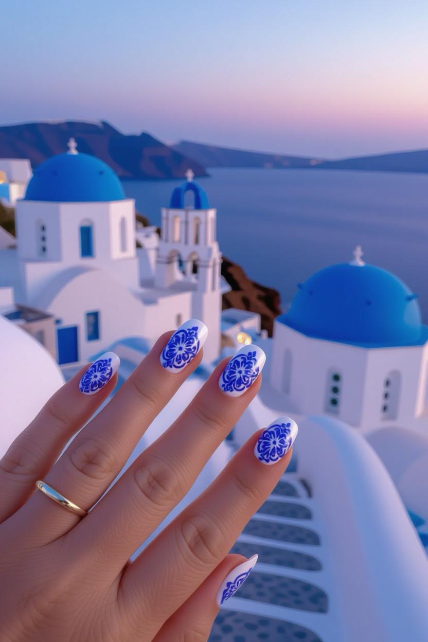 Channel the beauty of Santorini’s iconic rooftops with crisp white nails accented by intricate cobalt blue tile patterns. This design feels refreshing, clean, and instantly recognizable as Greek-inspired, making it ideal for vacation-ready vibes.