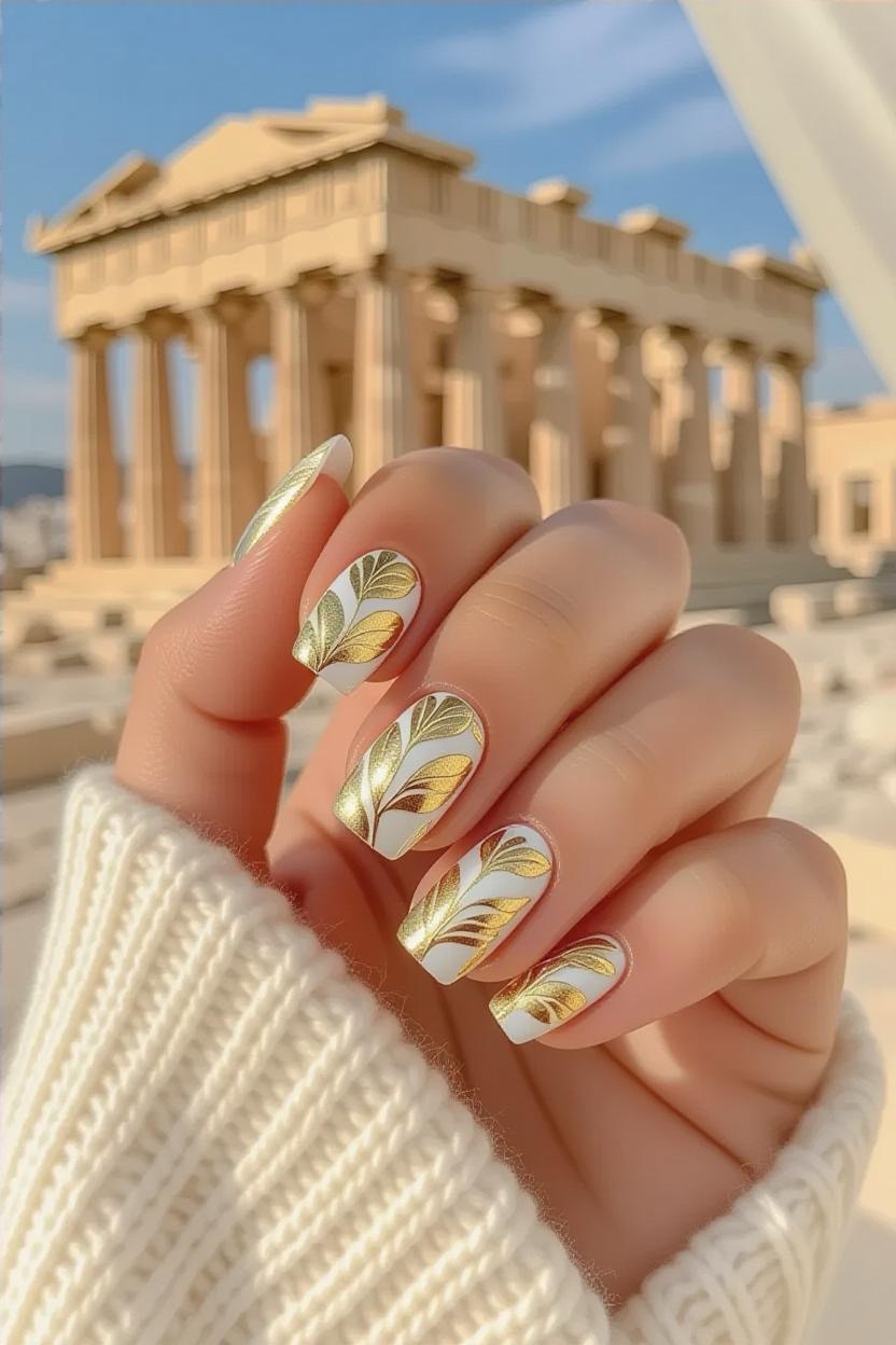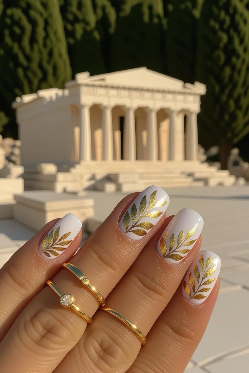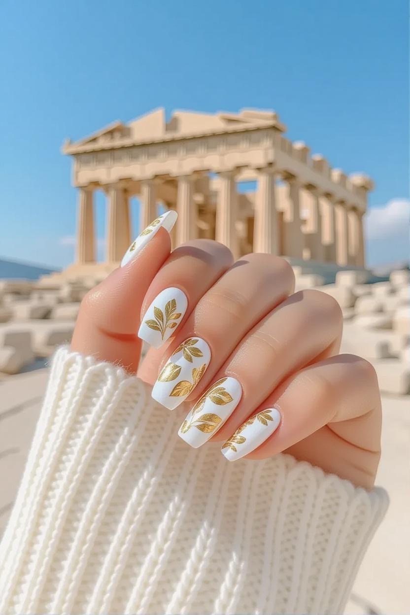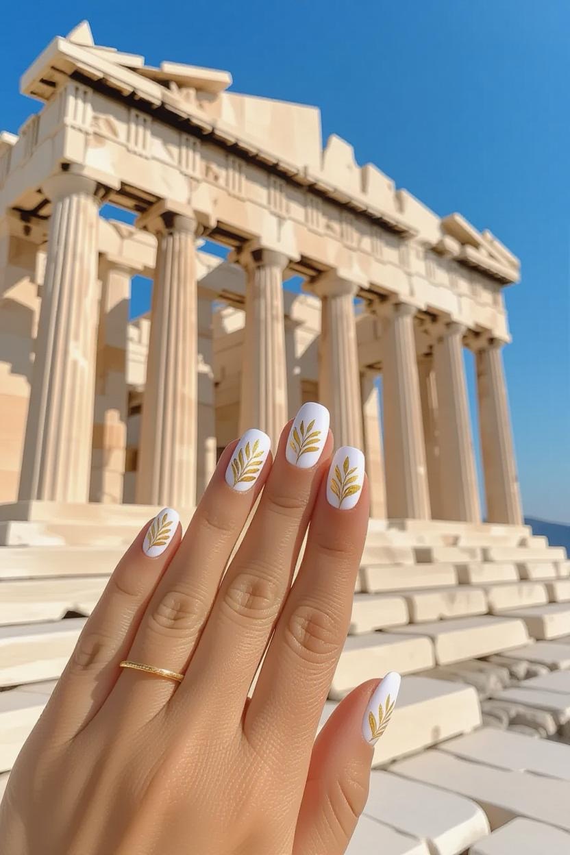 Add a touch of luxury by placing delicate gold foil or leaf over a white polish base. The gold mirrors the shimmering sunlight on Greek temples and works beautifully for both casual and formal occasions.