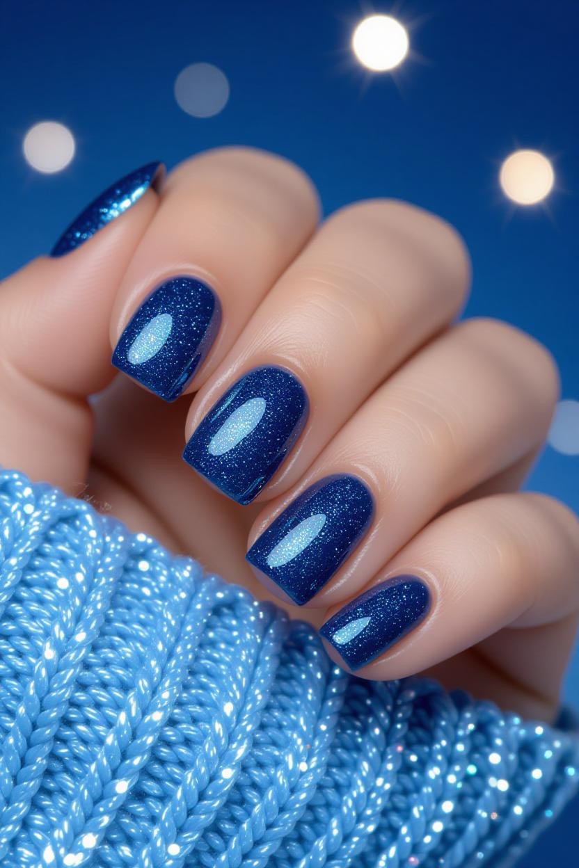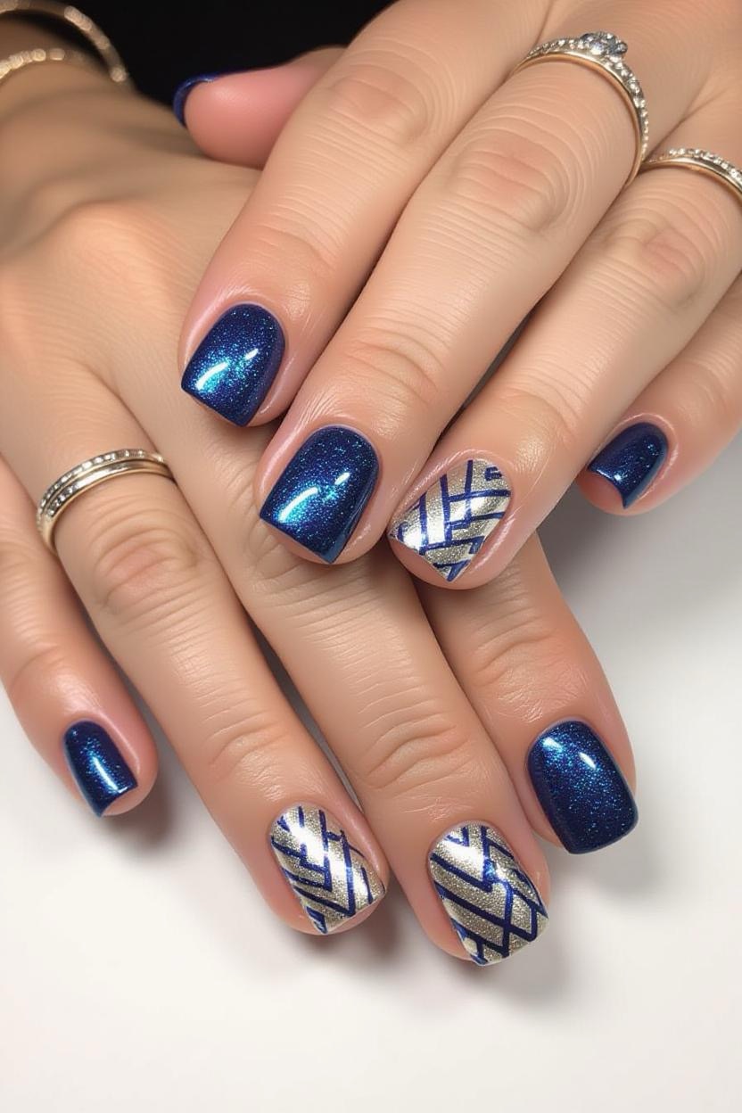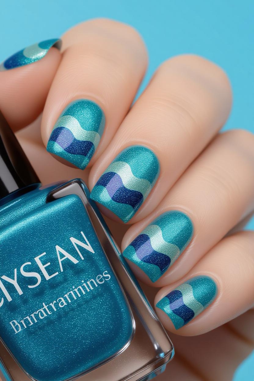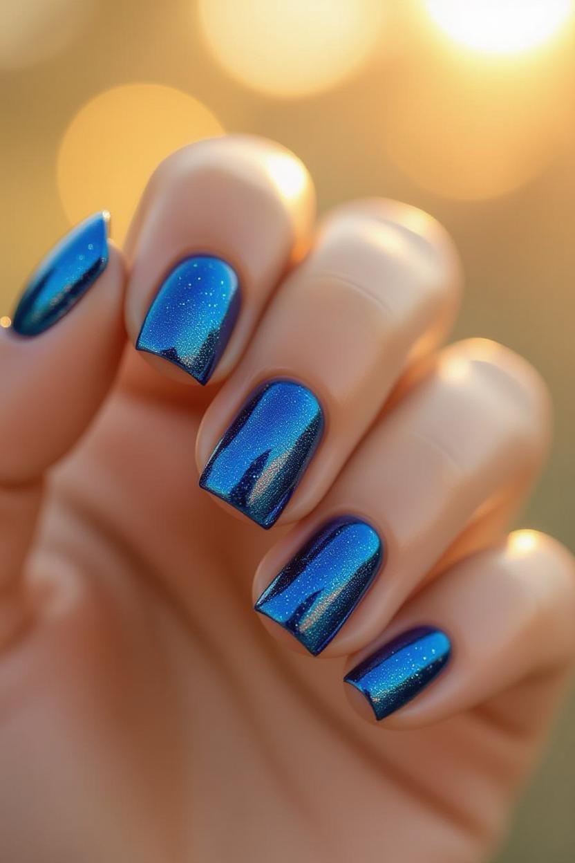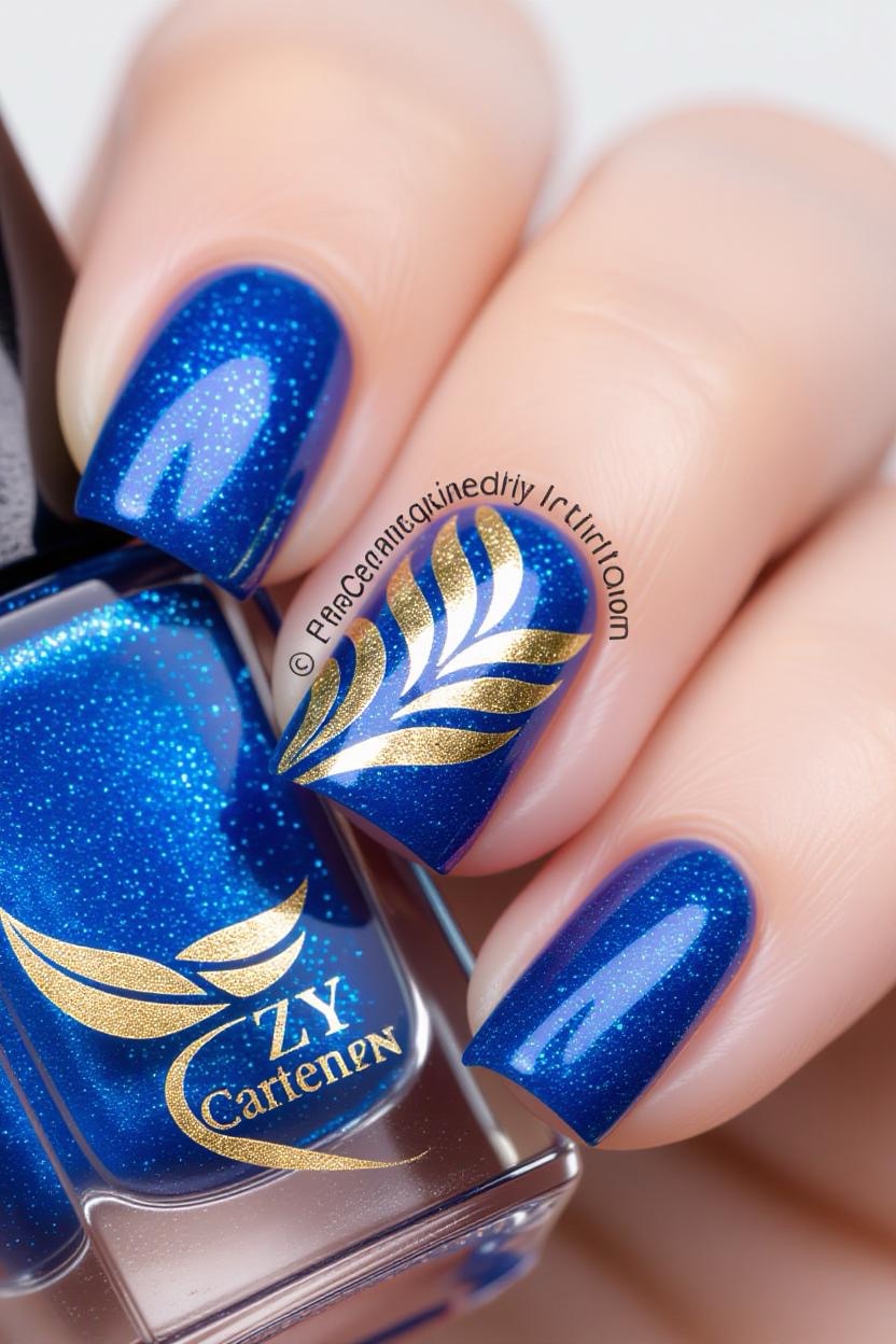 Add a glittering twist to Greek blue by using metallic shimmer polish over deep blue nails. It’s a glamorous take on the classic color palette.