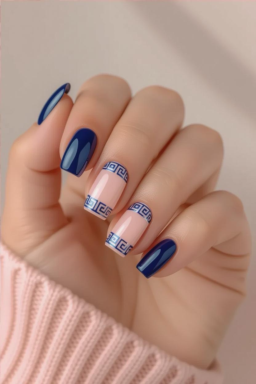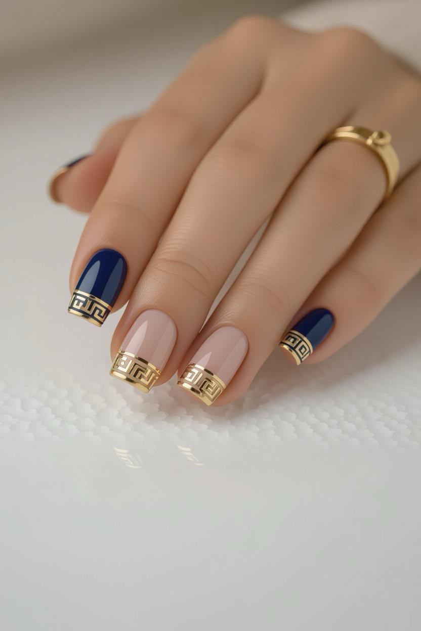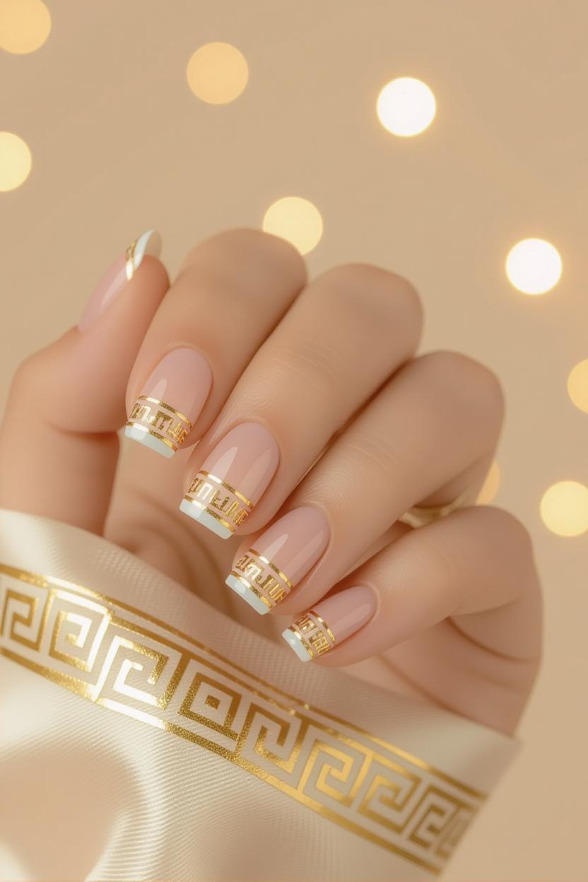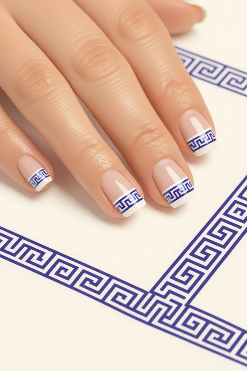 French manicures get a Mediterranean upgrade with thin Greek key (meander) borders painted along the tips. Choose gold or deep blue for a striking contrast against a nude or pale background.