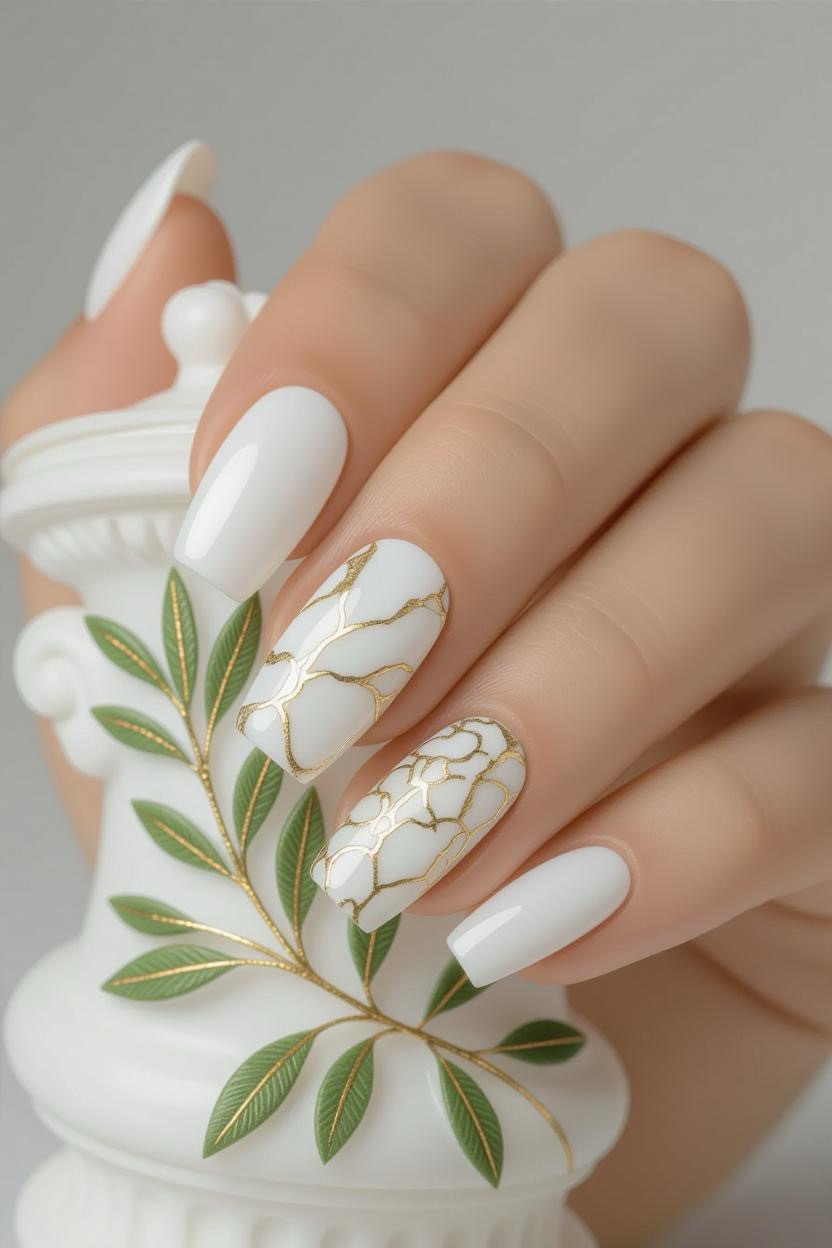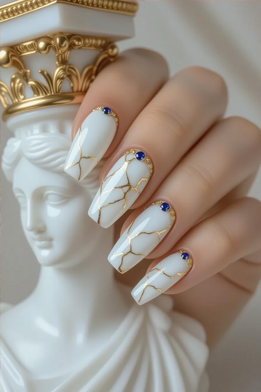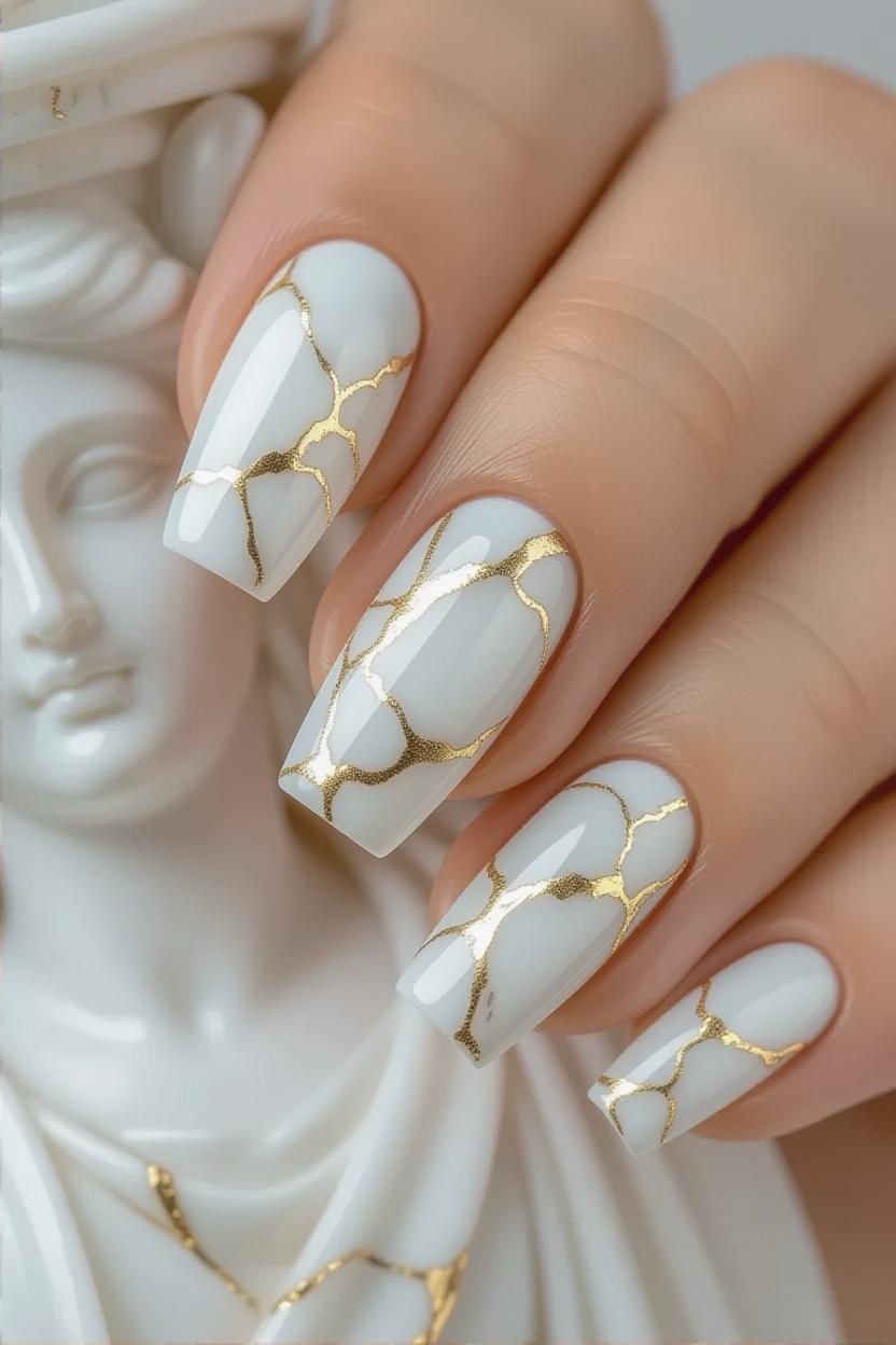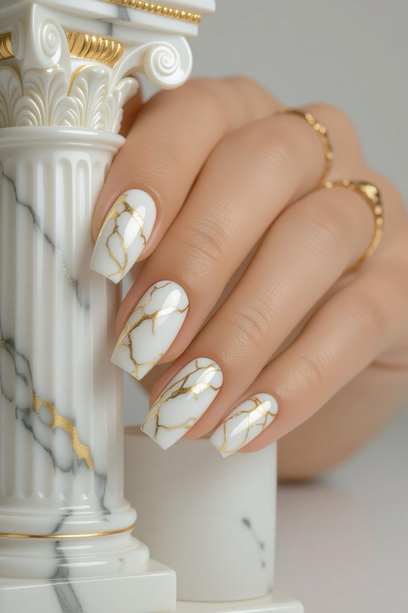 White and soft grey marble nails with subtle gold veining echo the elegance of ancient Greek statues and columns. This design feels modern yet deeply rooted in history.