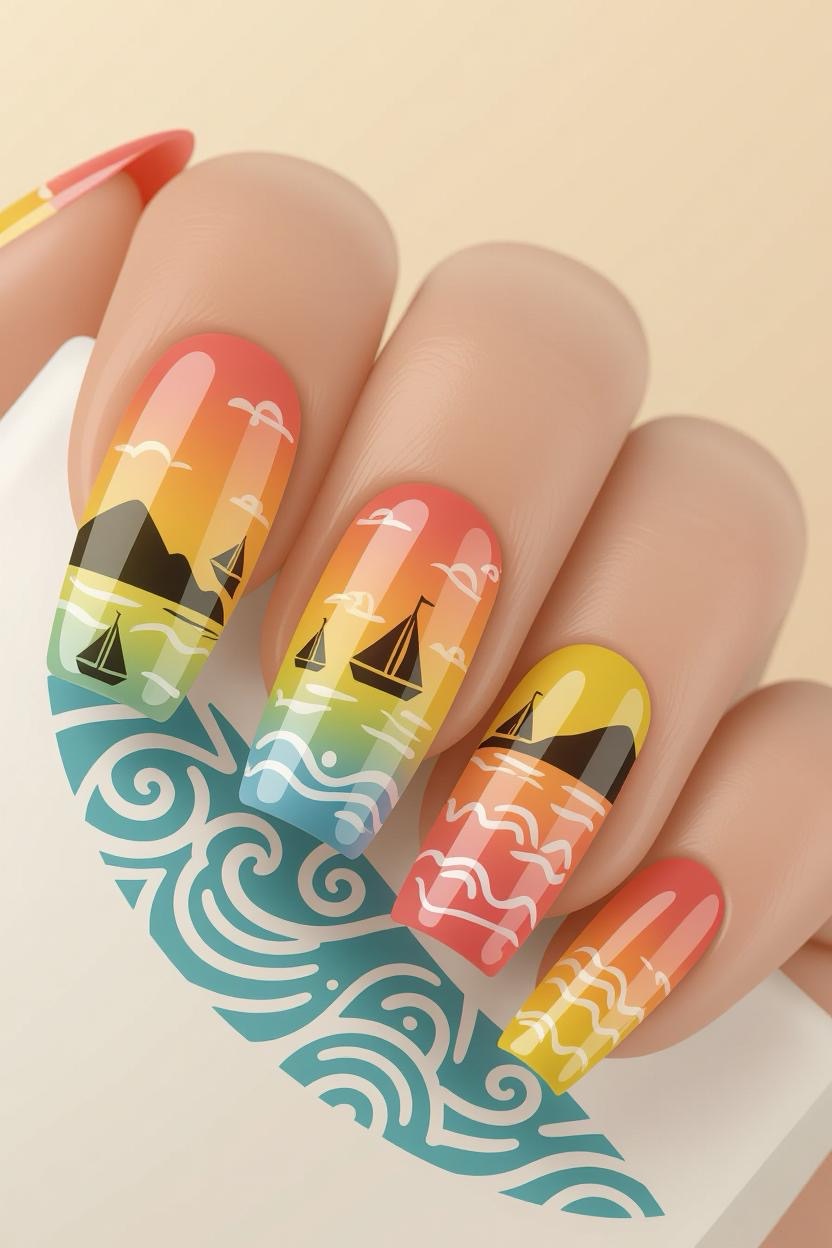 A warm gradient of coral, pink, and golden yellow captures the magic of Greek island sunsets. You can even add tiny silhouettes of boats or hills for extra charm.