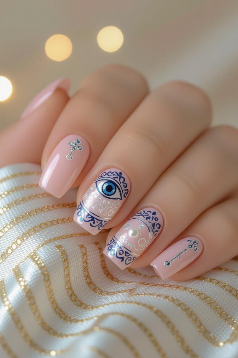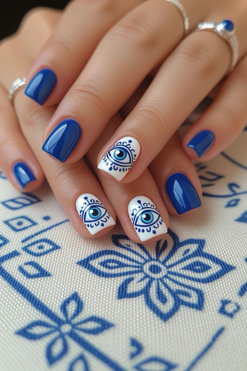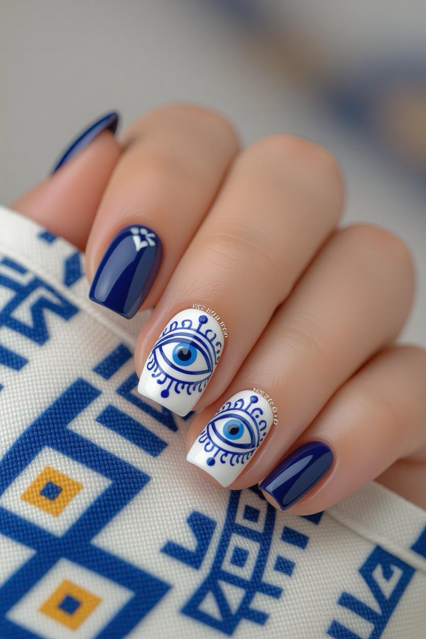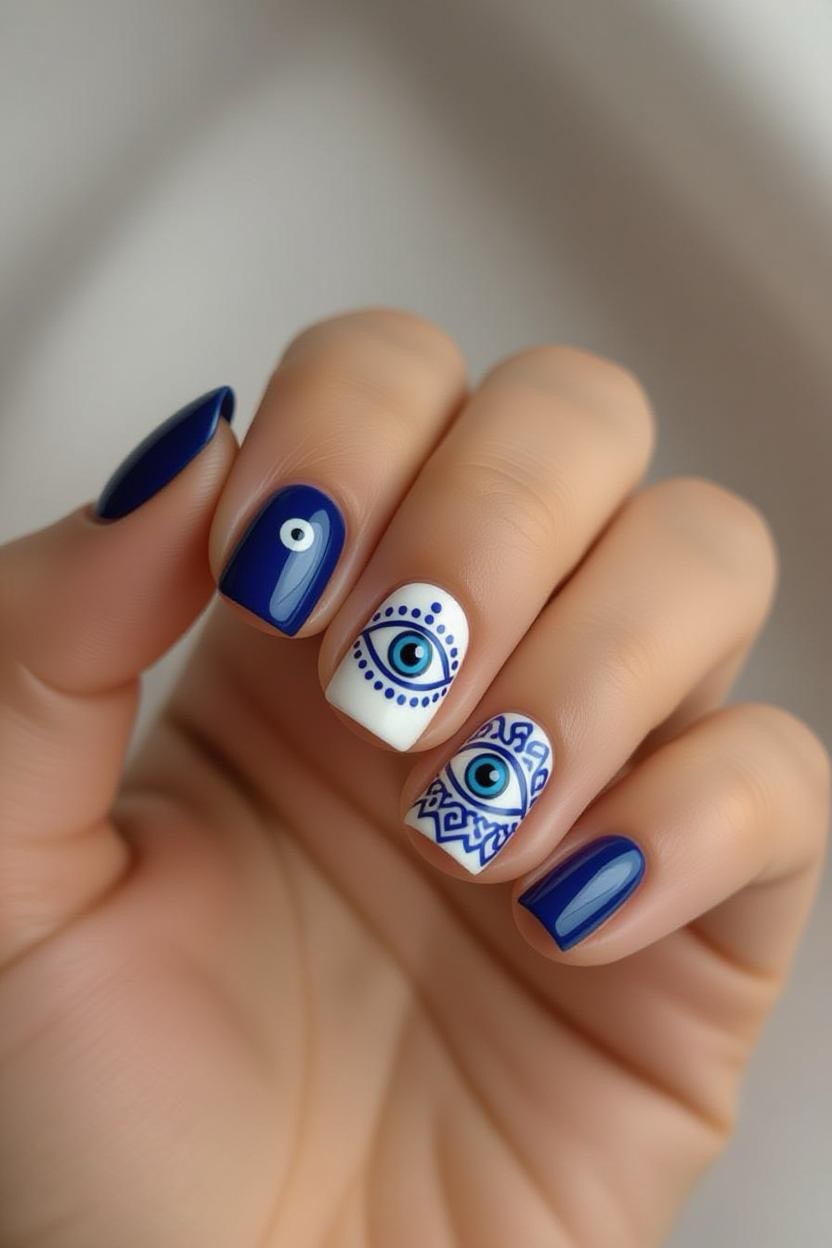 Incorporate the traditional Greek mati (evil eye) symbol in a small accent nail. It’s believed to bring good luck while adding a quirky and stylish touch to your manicure.