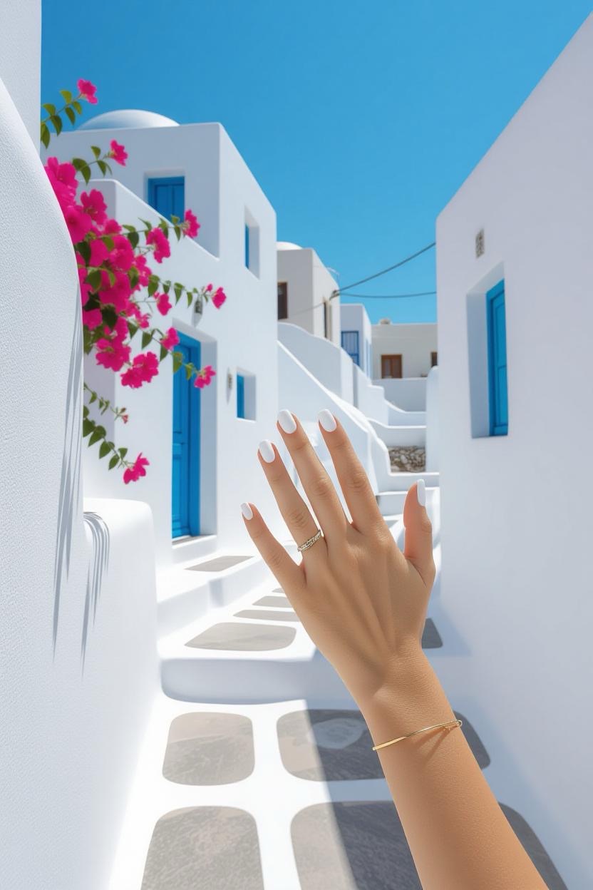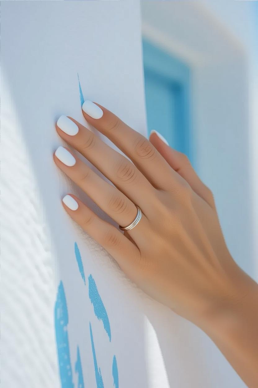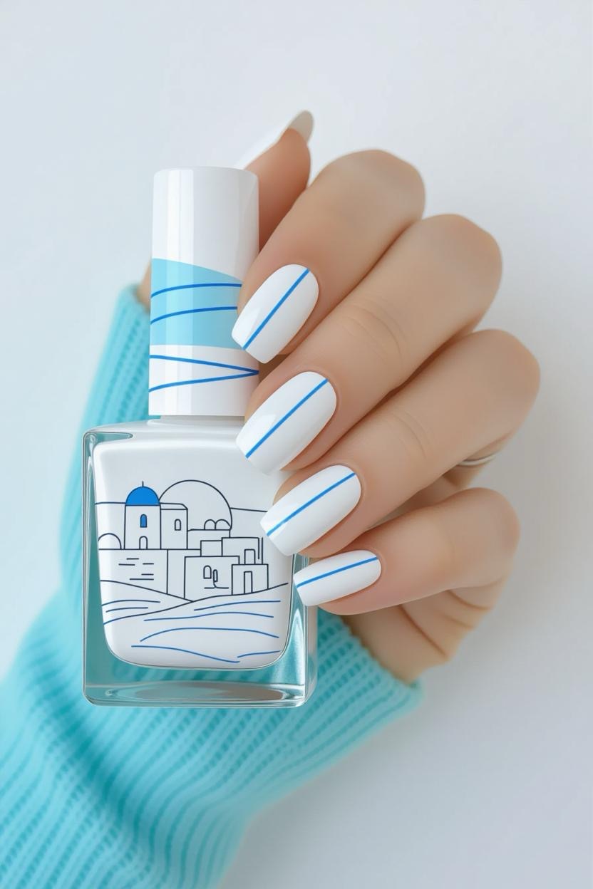 Matte white nails with minimal blue lines replicate the clean, whitewashed walls of the Cycladic islands. This minimalist style is fresh, modern, and perfect for summer.