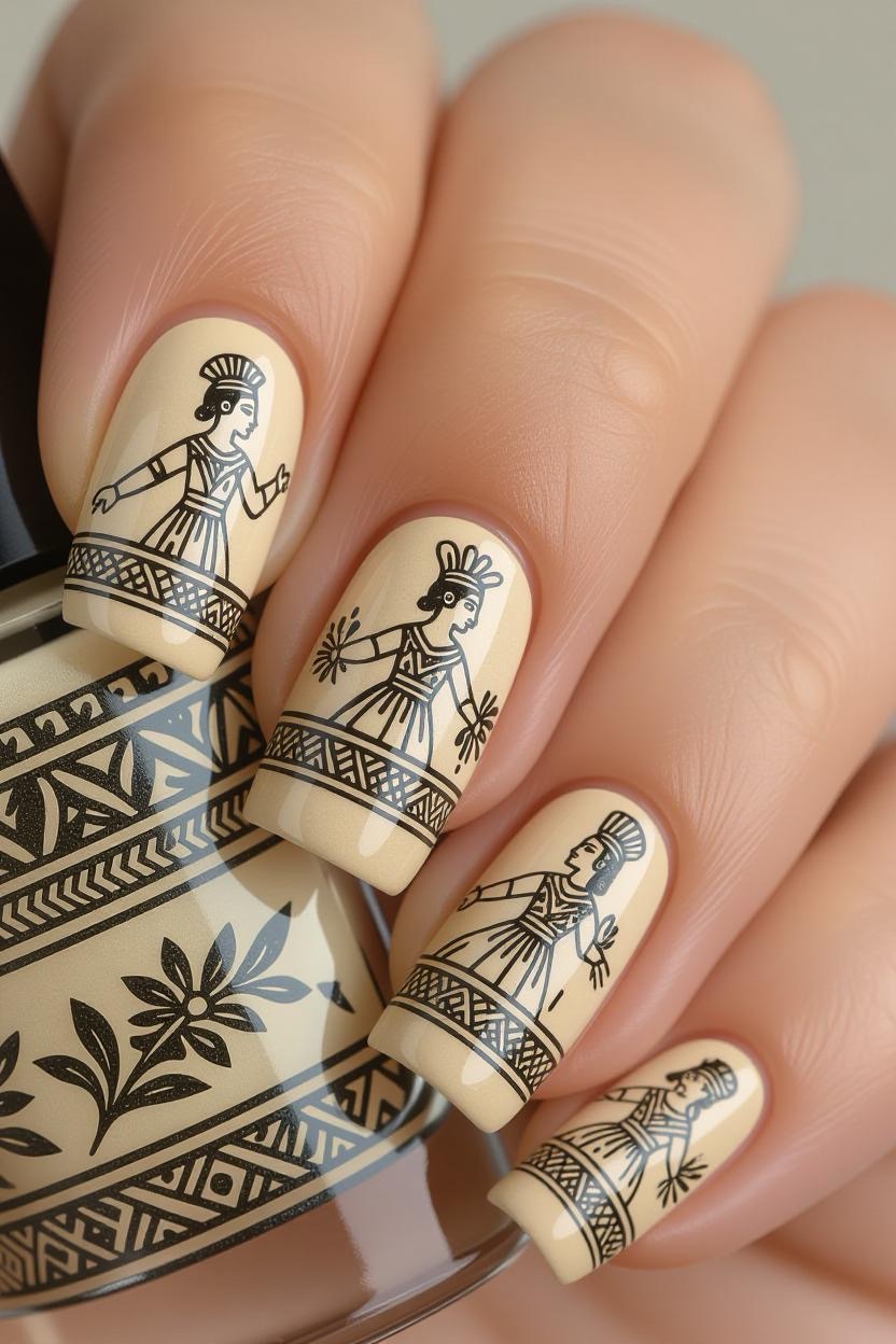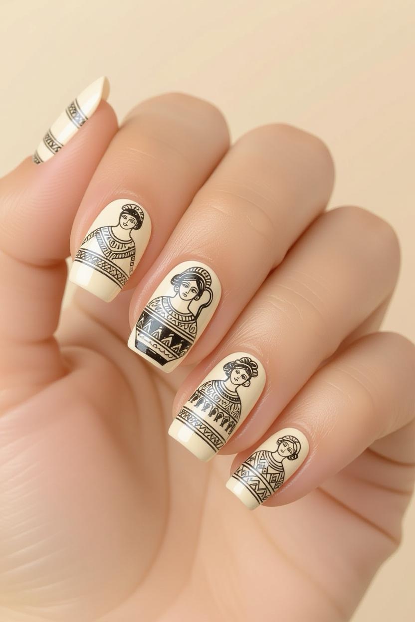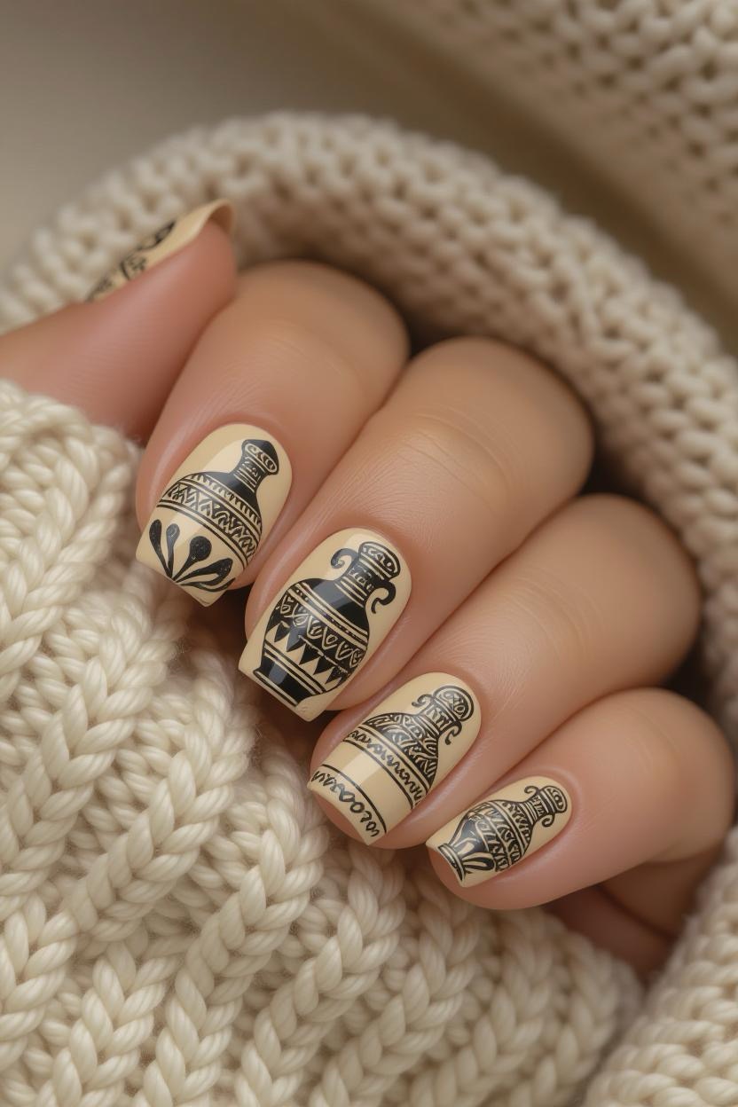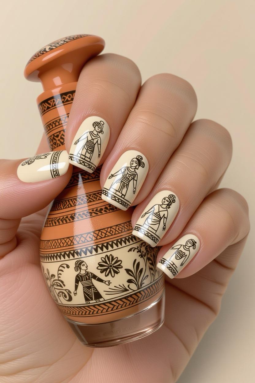 Terracotta and cream nails adorned with delicate, black-ink-style illustrations mimic traditional Greek pottery art. This choice is unique and sure to spark conversations.