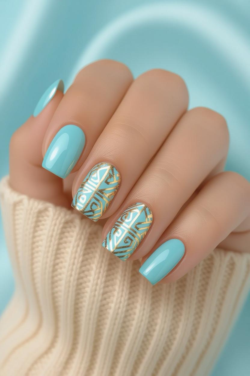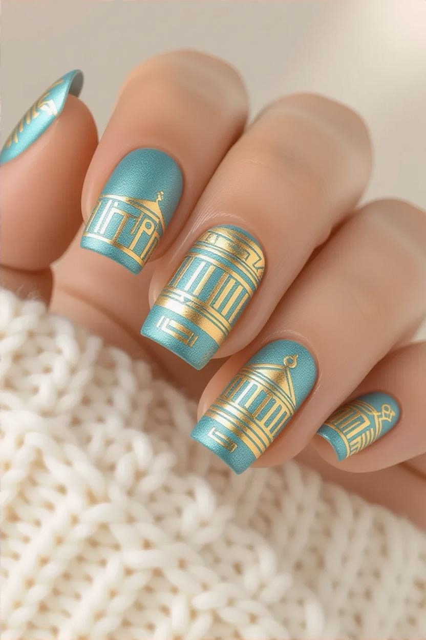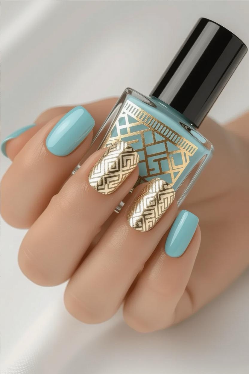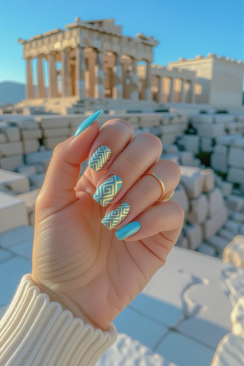 Geometric patterns in metallic gold over pale blue nails pay homage to Greece’s architectural precision while adding a luxe, modern finish.