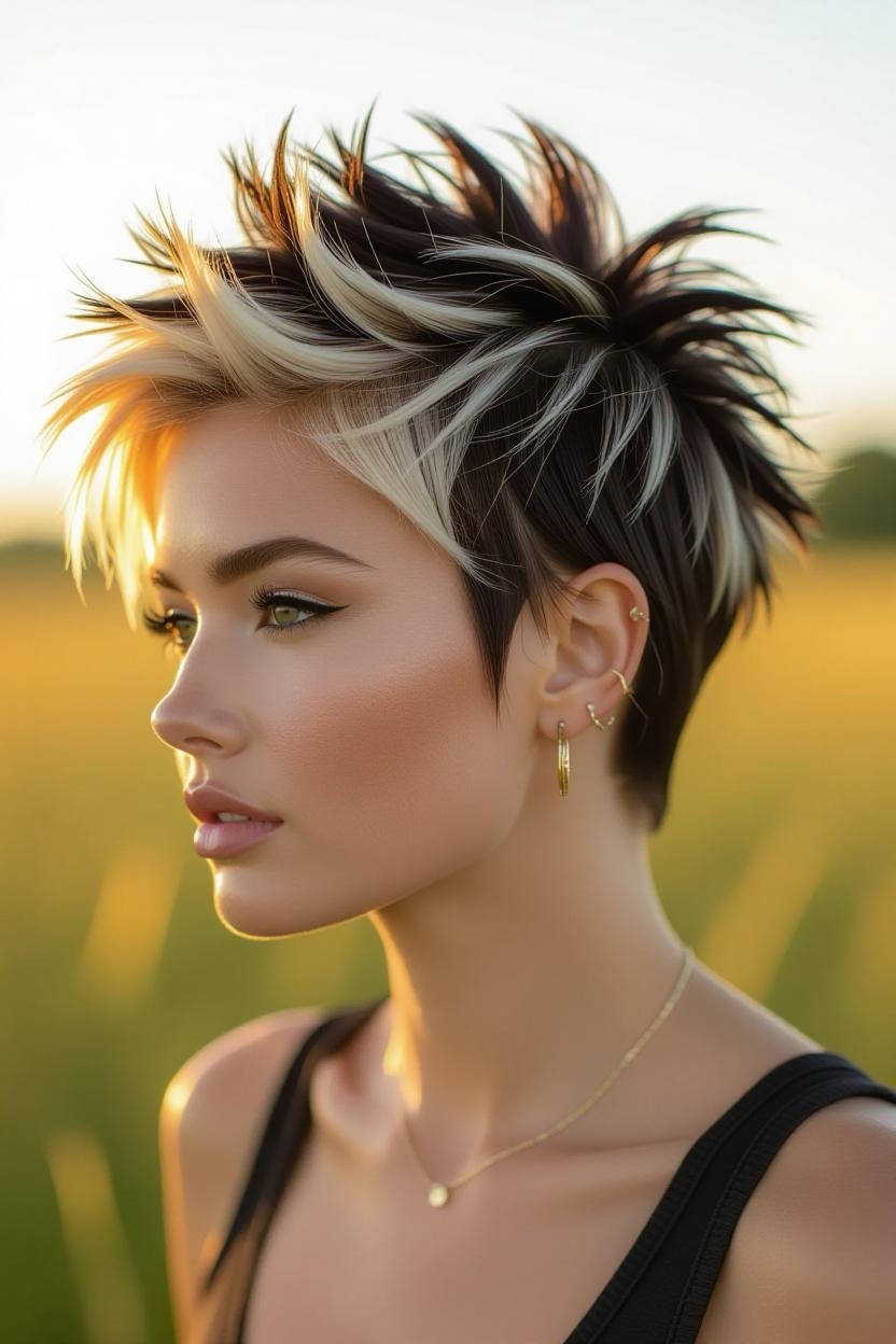 For extra flair, combine spikes with color. A spiky cut with highlights or contrasting tones, like blonde tips over dark roots, makes the style pop while emphasizing texture.