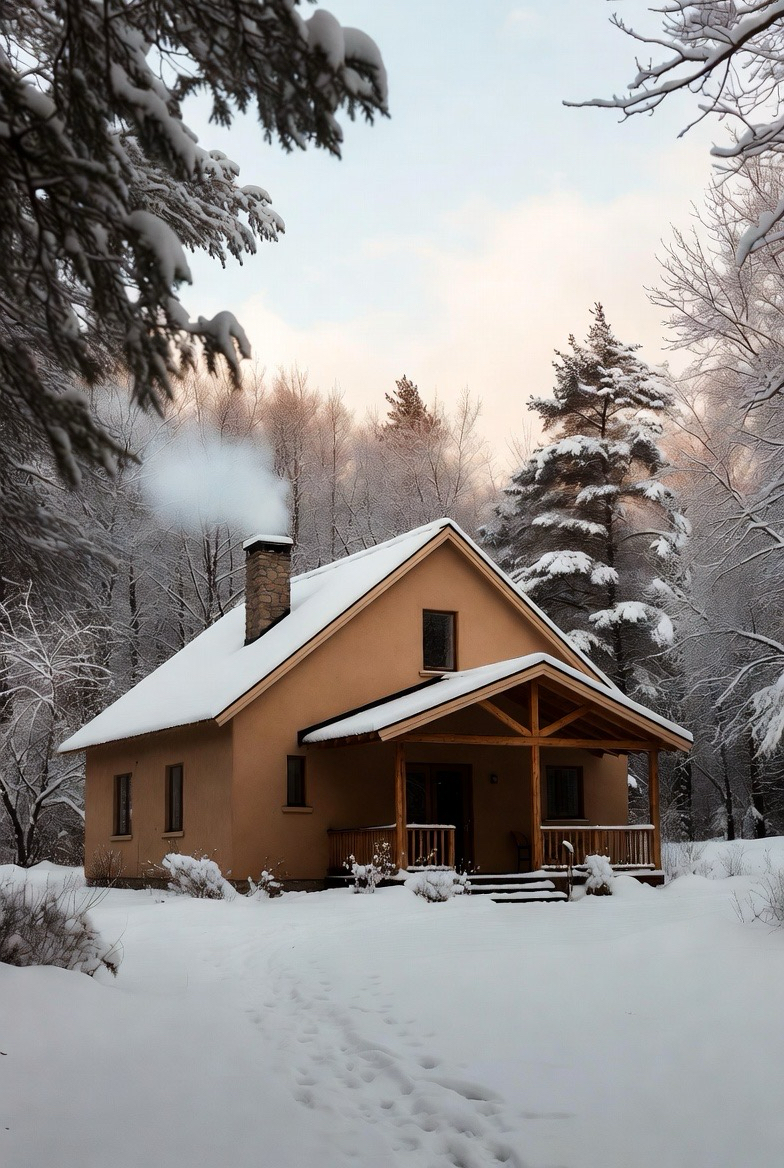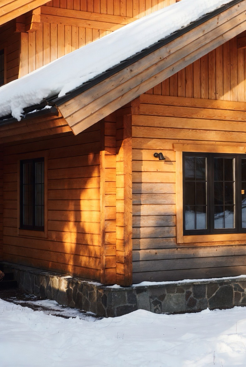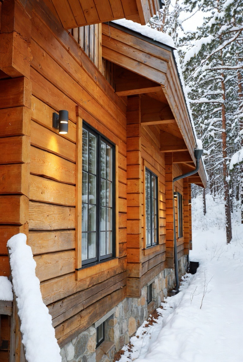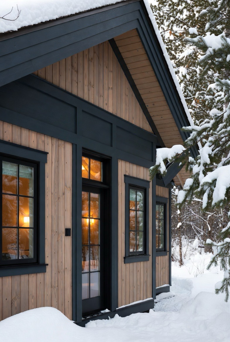 Natural timber siding instantly creates a cozy winter cabin vibe, especially when finished in warm honey or deep chestnut tones. Wood textures soften the exterior and blend beautifully with snowy landscapes, making the cabin feel grounded and inviting. Pair the timber cladding with dark window frames, stone foundations, and soft exterior lighting to enhance warmth after sunset. This classic look ages gracefully and feels timeless, perfect for cabins tucked into forests or mountain settings where nature is part of the aesthetic.
