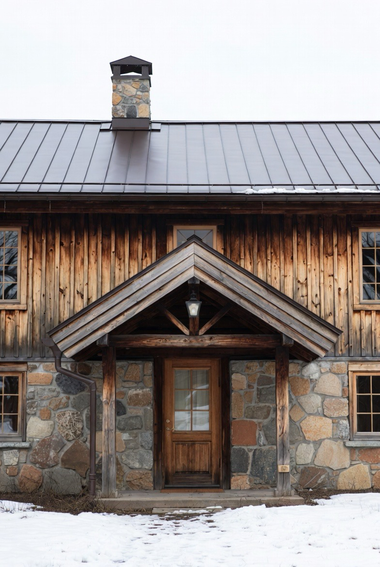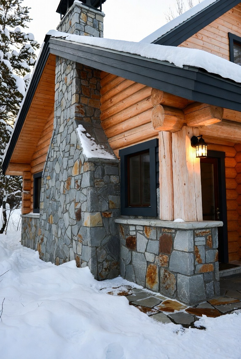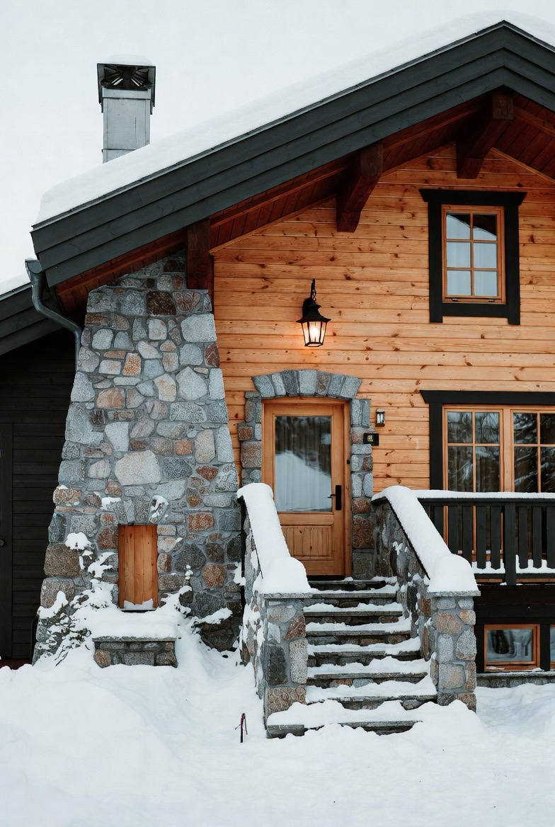 Stone accents add depth, texture, and a sense of permanence to winter cabin exteriors. Whether used on the base, chimney, or entryway, natural stone brings a rugged elegance that feels perfect for cold-weather retreats. In winter, stone contrasts beautifully against snow, giving the cabin a storybook appearance. Combine stonework with wooden beams, lantern-style lighting, and dark trim to amplify the cozy factor while maintaining a strong, grounded exterior presence.