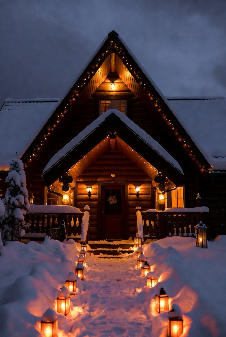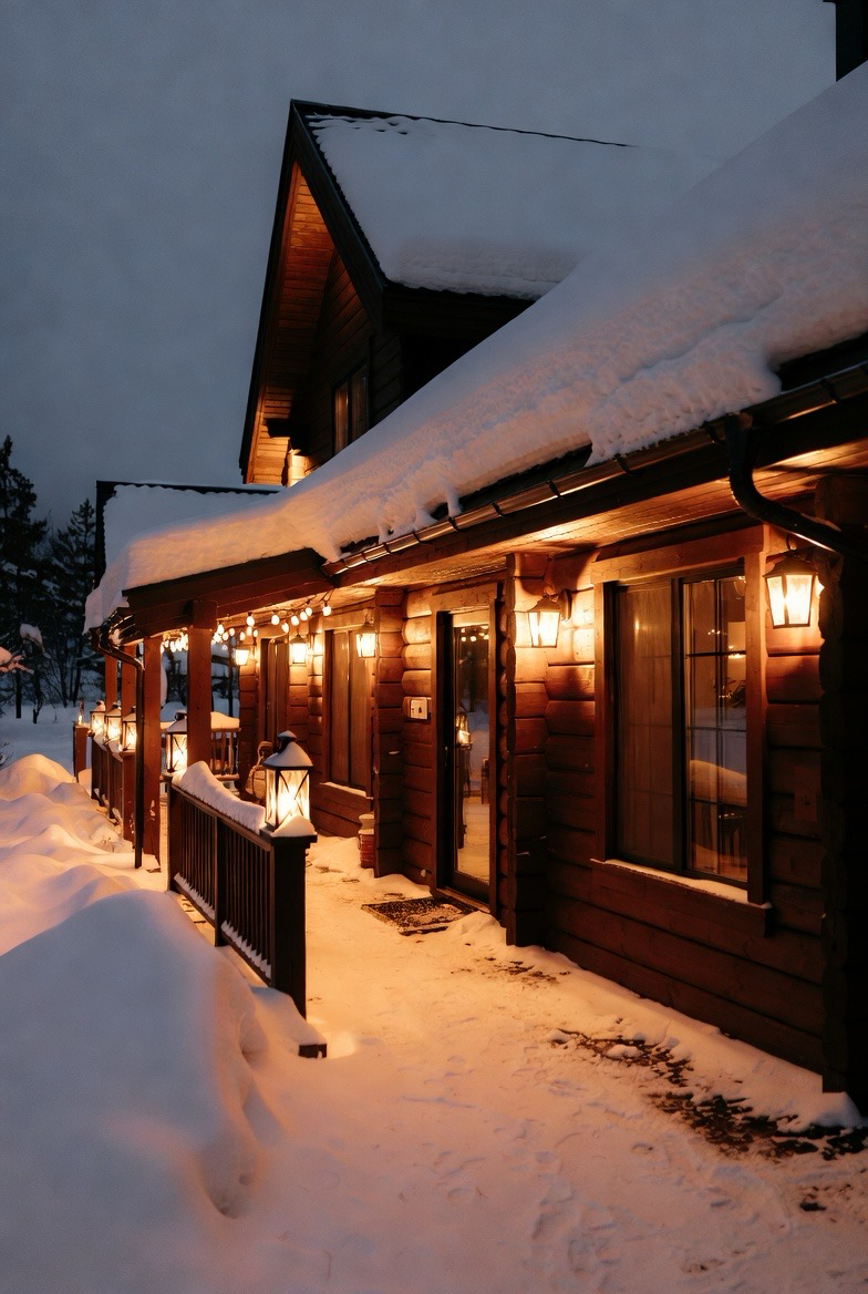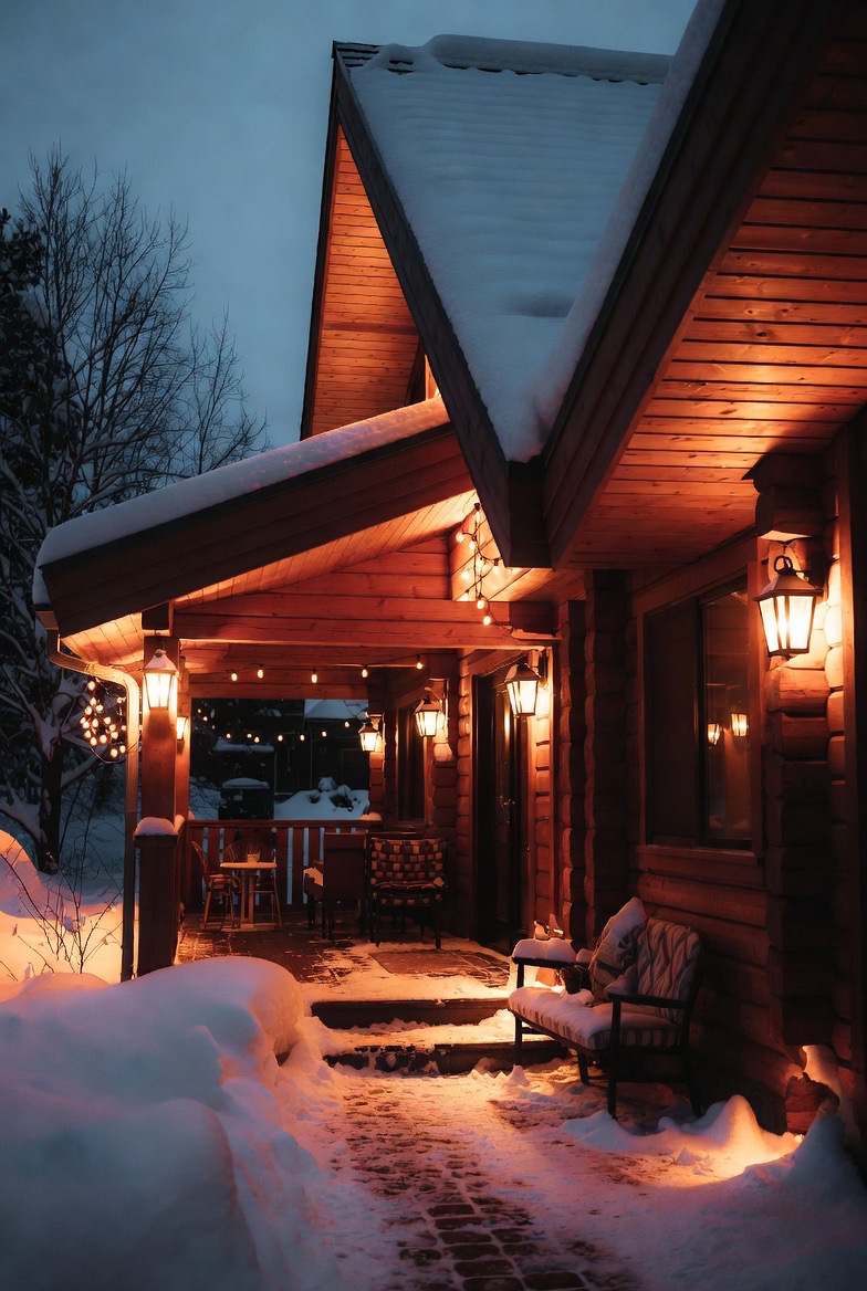 Warm outdoor lighting can completely change the mood of a winter cabin exterior. Soft amber lights along pathways, eaves, and porch ceilings create a welcoming glow that feels magical against winter skies. Lanterns, string lights, and wall sconces add visual warmth while improving safety in snowy conditions. This lighting approach enhances curb appeal and makes the cabin feel alive and inviting, even during long winter nights when darkness falls early.