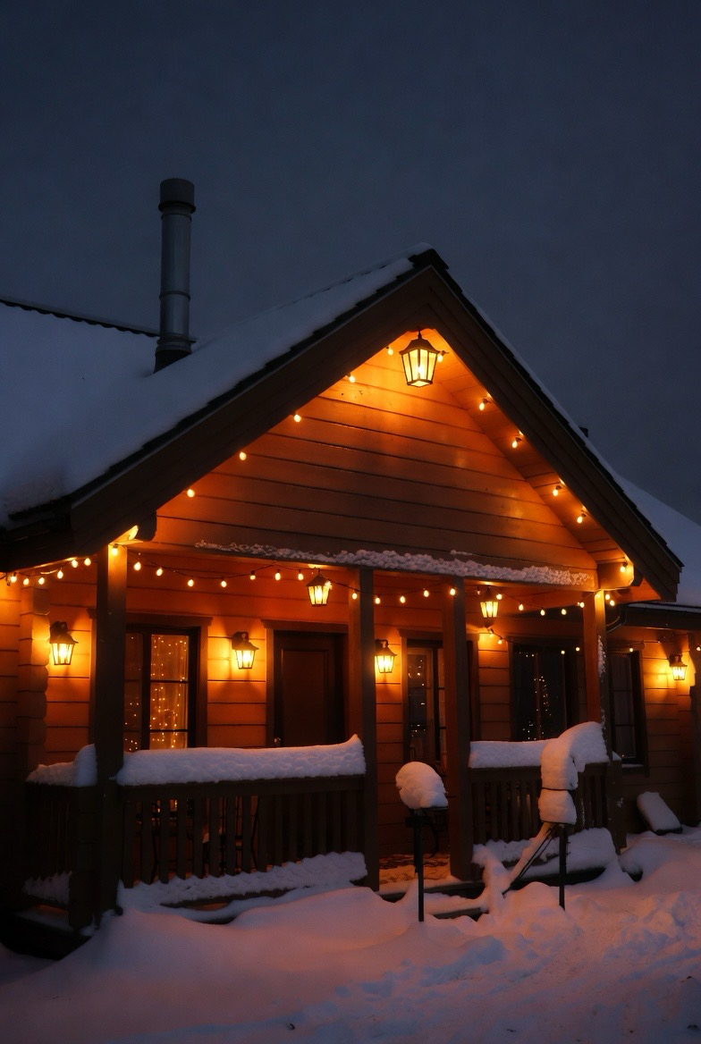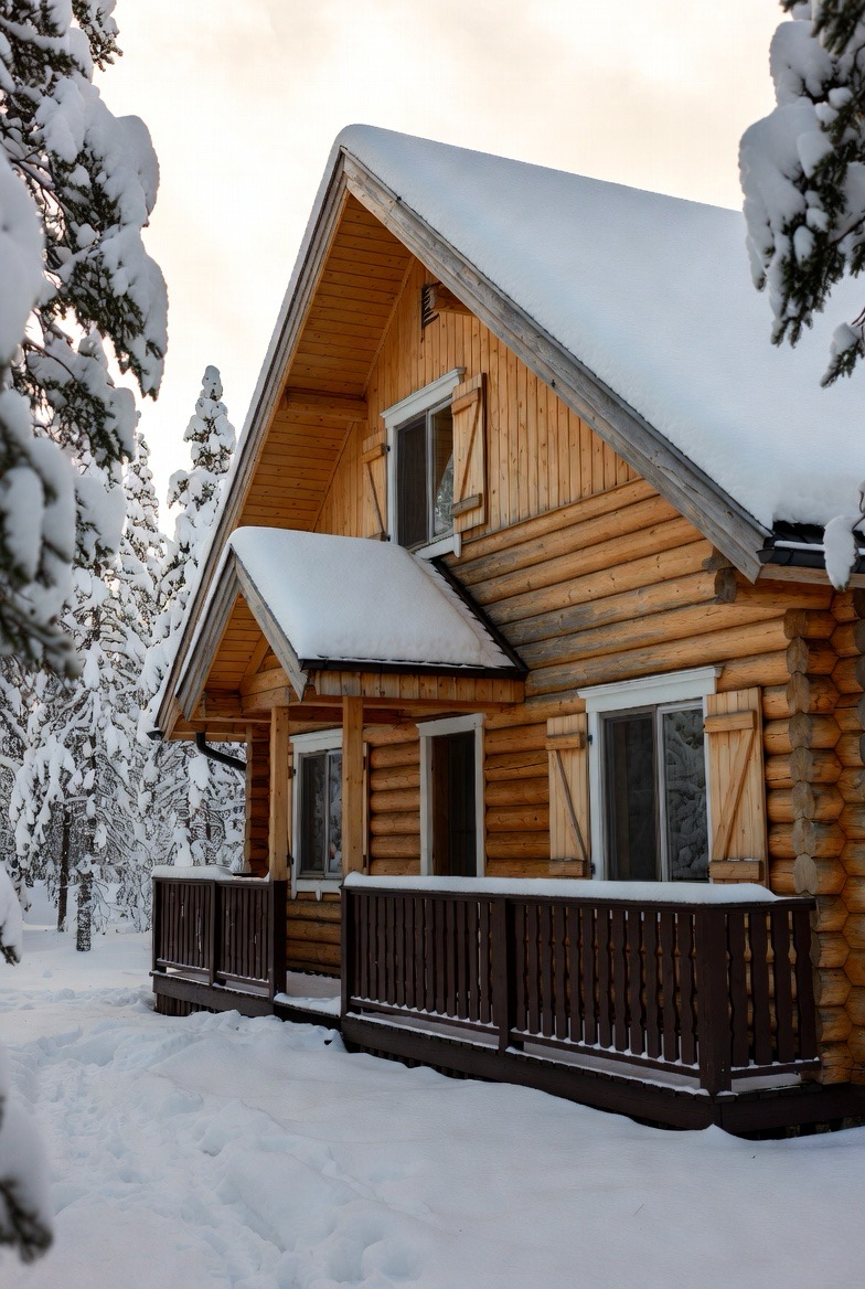 Wooden railings, shutters, and trim add layers of texture to winter cabin exteriors. These details enhance the handcrafted, cozy look that cabins are known for. Slightly weathered finishes feel authentic and blend naturally with winter settings. Combined with soft lighting and snow-covered surroundings, rustic details make the cabin feel like a peaceful winter retreat.
