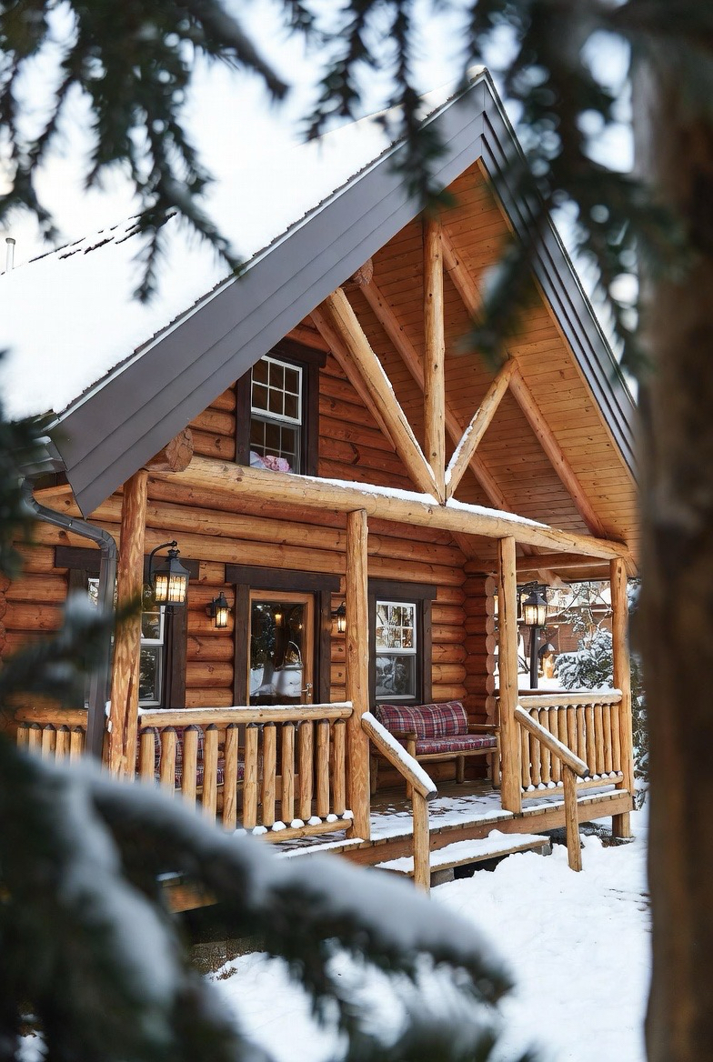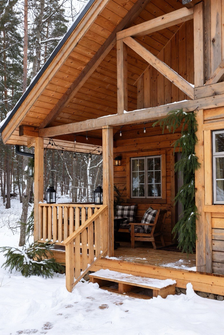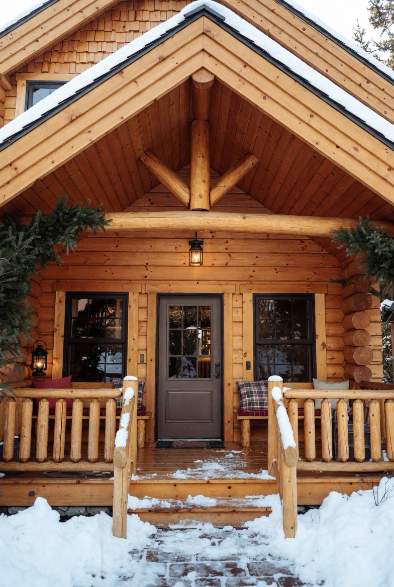 A covered porch adds instant charm and functionality to winter cabin exteriors. It creates a sheltered transition between outdoors and indoors while providing space for cozy decor like wooden benches, plaid cushions, or lanterns. Rustic railings, exposed beams, and natural wood finishes elevate the look. In snowy weather, a porch framed with soft lighting and evergreen accents becomes a warm welcome that invites guests inside.