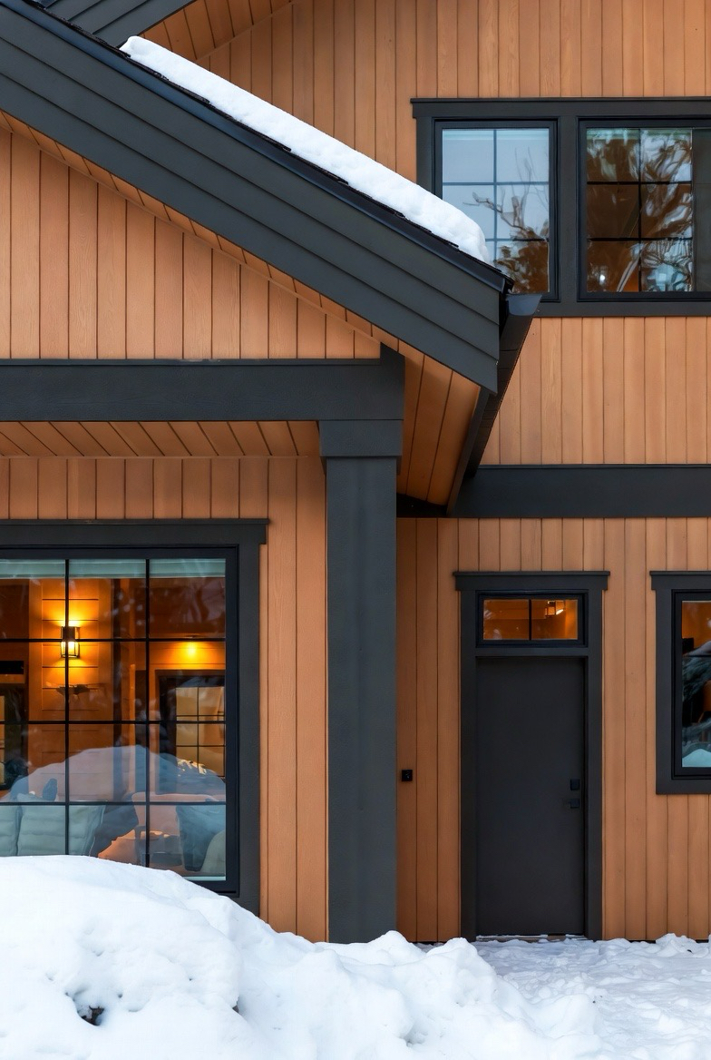 Dark trim around windows, doors, and rooflines gives winter cabins a bold yet cozy look. Shades like charcoal, deep brown, or matte black create striking contrast against wood siding and snowy surroundings. This design choice adds definition and makes architectural details stand out. When paired with warm interior lighting visible through the windows, dark trim helps the cabin feel both dramatic and comforting at the same time.