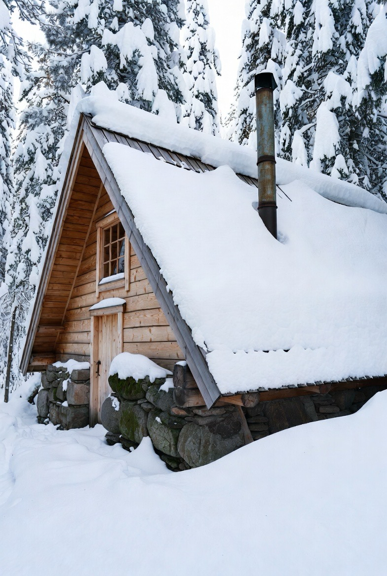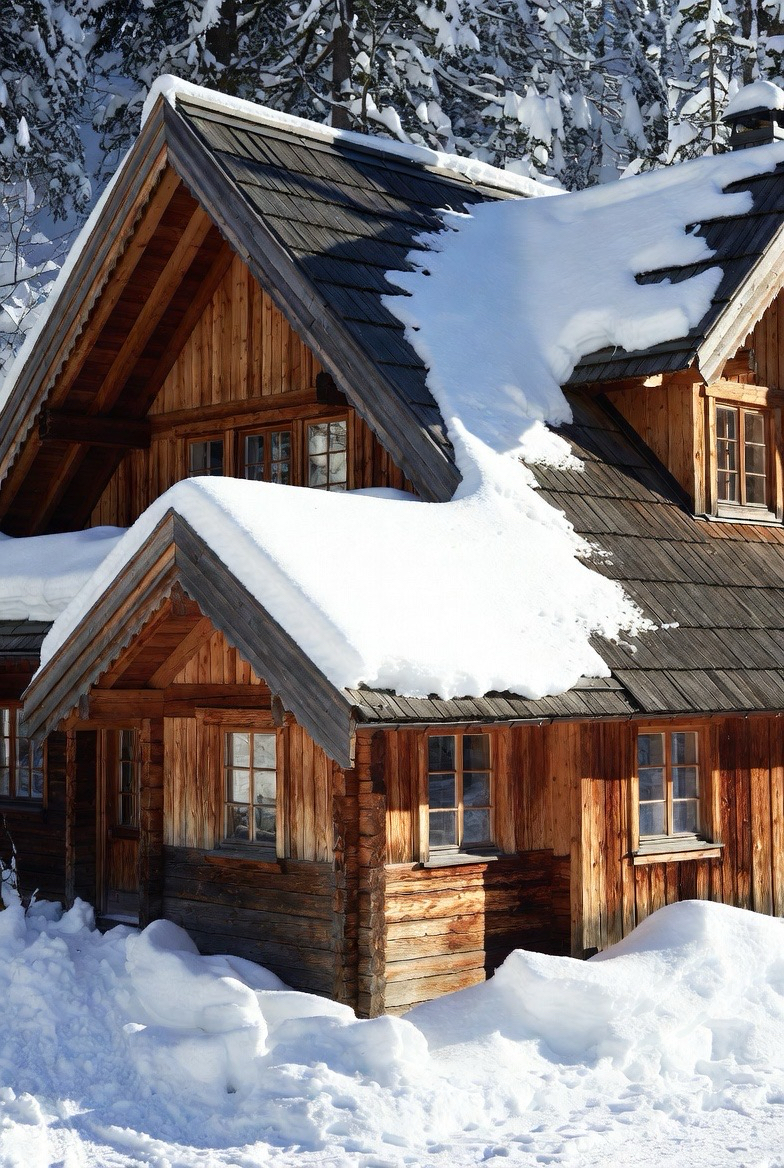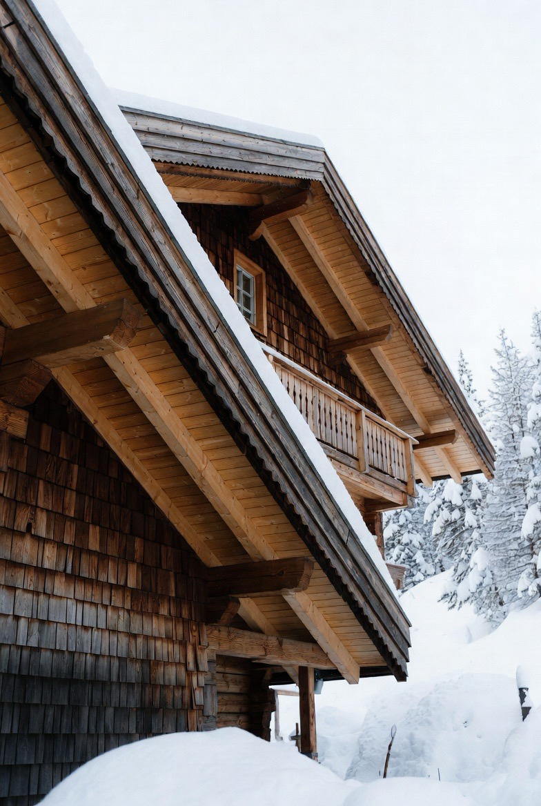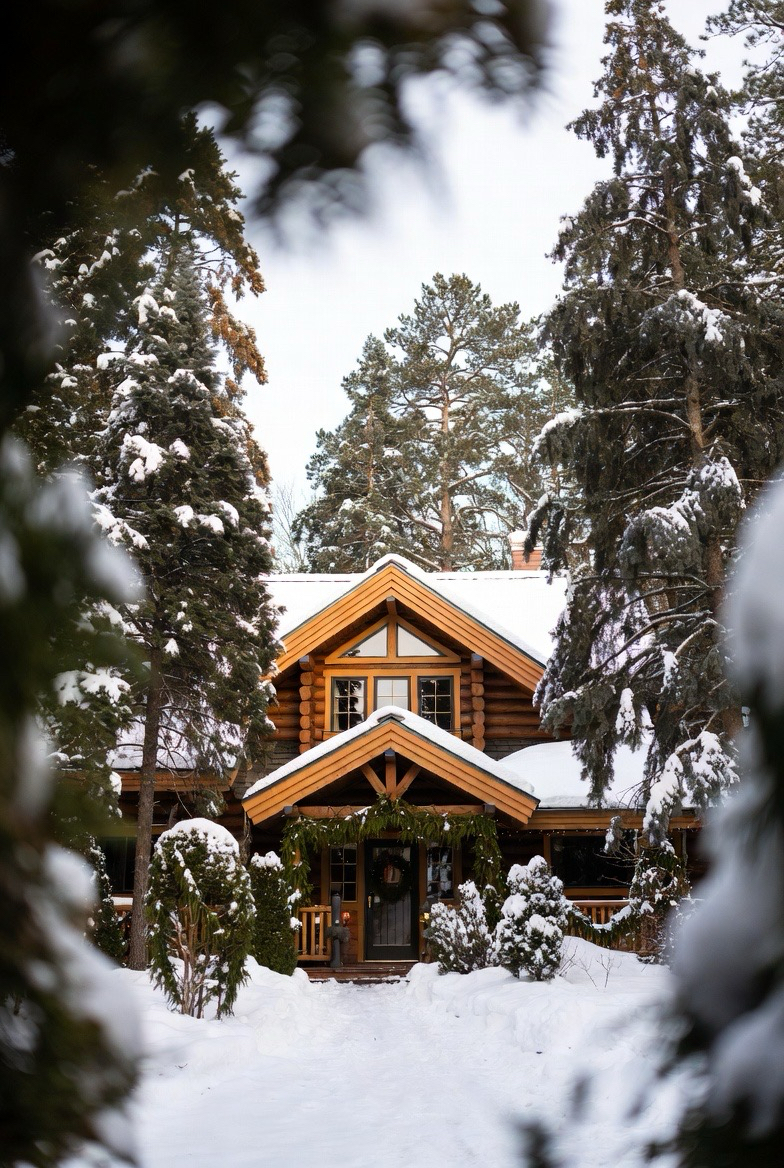 Steep rooflines aren’t just practical for snow, they also add storybook charm to winter cabins. Sloped roofs help snow slide off while creating a classic alpine silhouette. Exposed rafters, wood beams, and dark shingles enhance the cozy aesthetic. A well-designed roofline contributes to both functionality and visual warmth, making the cabin feel safe, snug, and thoughtfully built.