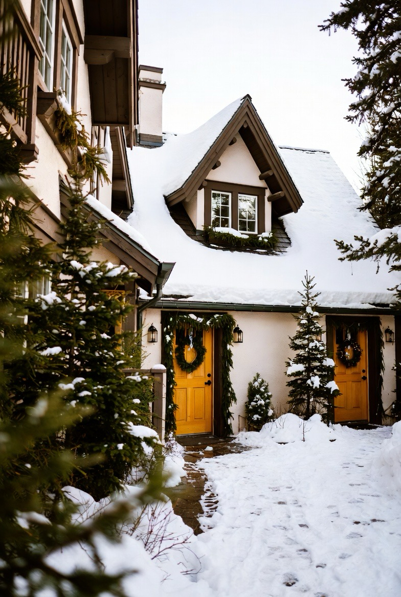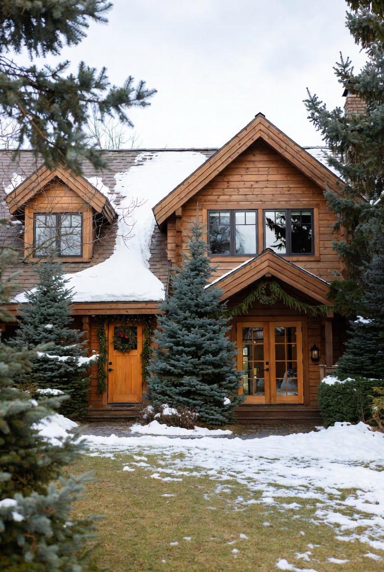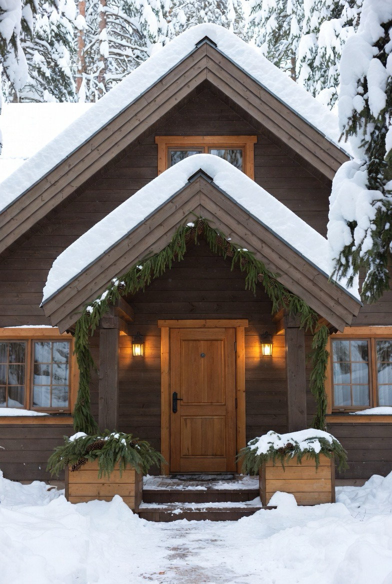 Evergreen trees, shrubs, and garlands keep winter cabin exteriors looking lush even when everything else is dormant. Pines, firs, and cedar accents provide natural color and texture that complement rustic architecture. Framing entryways with greenery or adding wreaths to doors instantly boosts seasonal charm. Evergreen landscaping softens the exterior and keeps the cabin feeling alive throughout the winter months.