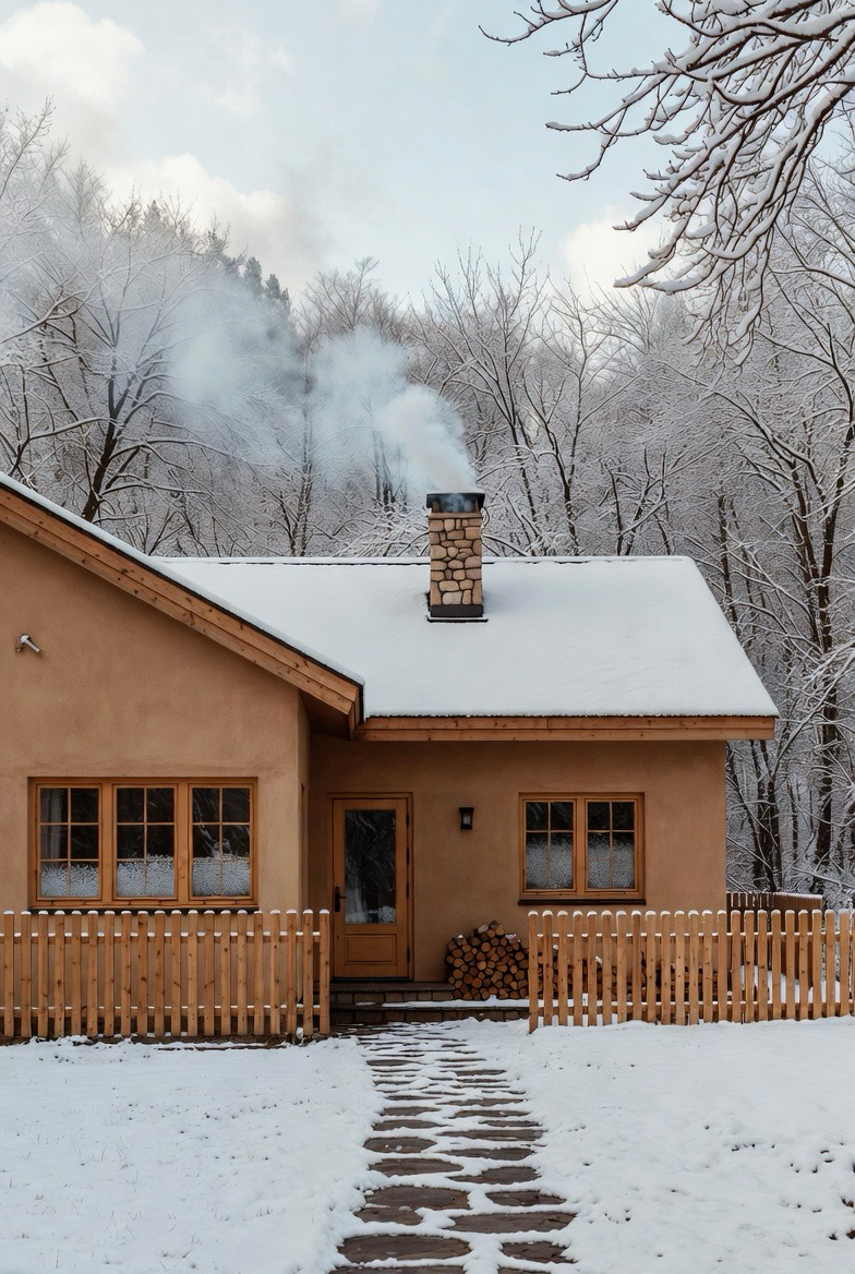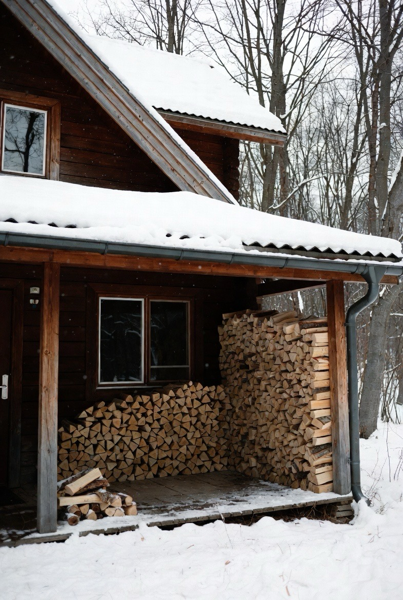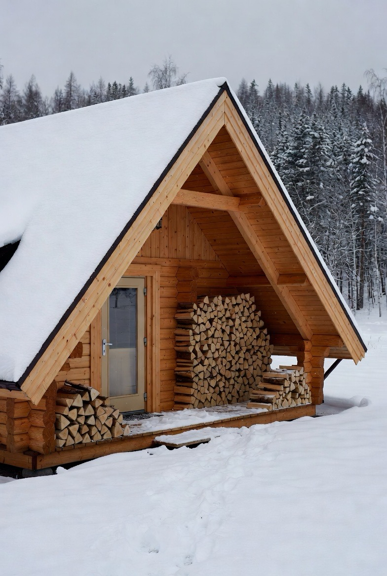 Stacked firewood isn’t just practical, it’s visually cozy. Neatly arranged wood piles near the entry or under a porch add rustic charm and hint at warmth inside. Firewood storage can be both decorative and functional, reinforcing the winter cabin aesthetic. It’s a simple detail that adds authenticity and seasonal comfort to the exterior.
