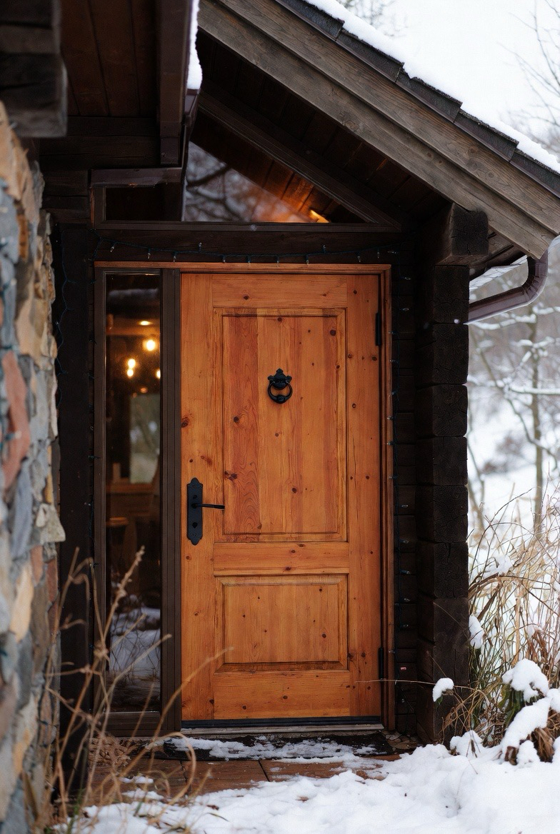 A solid wooden front door adds charm and warmth to winter cabin exteriors. Rich wood tones, iron hardware, and simple paneling enhance the rustic feel. The door becomes a visual anchor, especially when framed with stone or timber. In winter, a wooden door paired with soft lighting and seasonal decor makes the entire exterior feel more inviting and lived-in.